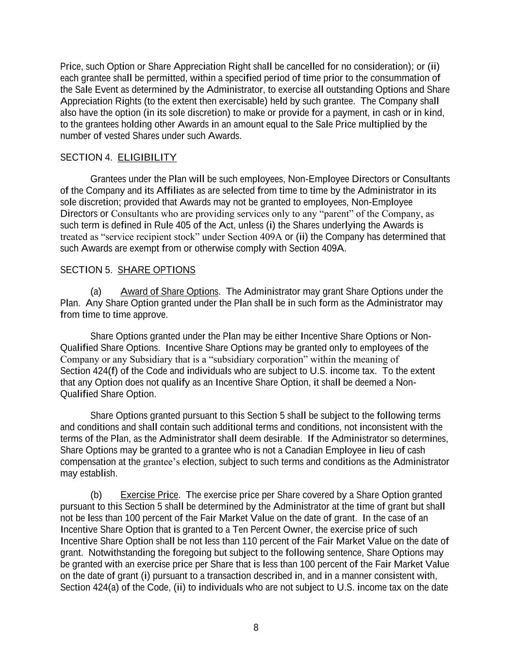 8 Price, such Option or Share Appreciation Right shall be cancelled for no consideration); or (ii) each grantee shall be permitted, within a specified period of time prior to the consummation of the Sale Event as determined by the Administrator, to exercise all outstanding Options and Share Appreciation Rights (to the extent then exercisable) held by such grantee. The Company shall also have the option (in its sole discretion) to make or provide for a payment, in cash or in kind, to the grantees holding other Awards in an amount equal to the Sale Price multiplied by the number of vested Shares under such Awards. SECTION 4. ELIGIBILITY Grantees under the Plan will be such employees, Non-Employee Directors or Consultants of the Company and its Affiliates as are selected from time to time by the Administrator in its sole discretion; provided that Awards may not be granted to employees, Non-Employee Directors or Consultants who are providing services only to any “parent” of the Company, as such term is defined in Rule 405 of the Act, unless (i) the Shares underlying the Awards is treated as “service recipient stock” under Section 409A or (ii) the Company has determined that such Awards are exempt from or otherwise comply with Section 409A. SECTION 5. SHARE OPTIONS (a) Award of Share Options. The Administrator may grant Share Options under the Plan. Any Share Option granted under the Plan shall be in such form as the Administrator may from time to time approve. Share Options granted under the Plan may be either Incentive Share Options or Non- Qualified Share Options. Incentive Share Options may be granted only to employees of the Company or any Subsidiary that is a “subsidiary corporation” within the meaning of Section 424(f) of the Code and individuals who are subject to U.S. income tax. To the extent that any Option does not qualify as an Incentive Share Option, it shall be deemed a Non- Qualified Share Option. Share Options granted pursuant to this Section 5 shall be subject to the following terms and conditions and shall contain such additional terms and conditions, not inconsistent with the terms of the Plan, as the Administrator shall deem desirable. If the Administrator so determines, Share Options may be granted to a grantee who is not a Canadian Employee in lieu of cash compensation at the grantee’s election, subject to such terms and conditions as the Administrator may establish. (b) Exercise Price. The exercise price per Share covered by a Share Option granted pursuant to this Section 5 shall be determined by the Administrator at the time of grant but shall not be less than 100 percent of the Fair Market Value on the date of grant. In the case of an Incentive Share Option that is granted to a Ten Percent Owner, the exercise price of such Incentive Share Option shall be not less than 110 percent of the Fair Market Value on the date of grant. Notwithstanding the foregoing but subject to the following sentence, Share Options may be granted with an exercise price per Share that is less than 100 percent of the Fair Market Value on the date of grant (i) pursuant to a transaction described in, and in a manner consistent with, Section 424(a) of the Code, (ii) to individuals who are not subject to U.S. income tax on the date