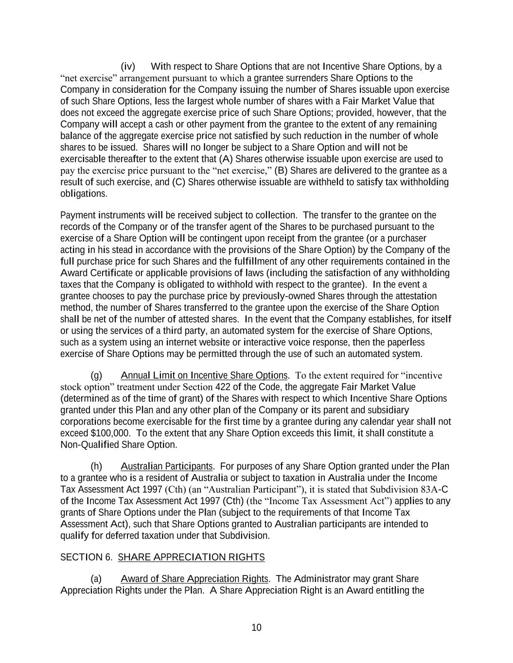 10 (iv) With respect to Share Options that are not Incentive Share Options, by a “net exercise” arrangement pursuant to which a grantee surrenders Share Options to the Company in consideration for the Company issuing the number of Shares issuable upon exercise of such Share Options, less the largest whole number of shares with a Fair Market Value that does not exceed the aggregate exercise price of such Share Options; provided, however, that the Company will accept a cash or other payment from the grantee to the extent of any remaining balance of the aggregate exercise price not satisfied by such reduction in the number of whole shares to be issued. Shares will no longer be subject to a Share Option and will not be exercisable thereafter to the extent that (A) Shares otherwise issuable upon exercise are used to pay the exercise price pursuant to the “net exercise,” (B) Shares are delivered to the grantee as a result of such exercise, and (C) Shares otherwise issuable are withheld to satisfy tax withholding obligations. Payment instruments will be received subject to collection. The transfer to the grantee on the records of the Company or of the transfer agent of the Shares to be purchased pursuant to the exercise of a Share Option will be contingent upon receipt from the grantee (or a purchaser acting in his stead in accordance with the provisions of the Share Option) by the Company of the full purchase price for such Shares and the fulfillment of any other requirements contained in the Award Certificate or applicable provisions of laws (including the satisfaction of any withholding taxes that the Company is obligated to withhold with respect to the grantee). In the event a grantee chooses to pay the purchase price by previously-owned Shares through the attestation method, the number of Shares transferred to the grantee upon the exercise of the Share Option shall be net of the number of attested shares. In the event that the Company establishes, for itself or using the services of a third party, an automated system for the exercise of Share Options, such as a system using an internet website or interactive voice response, then the paperless exercise of Share Options may be permitted through the use of such an automated system. (g) Annual Limit on Incentive Share Options. To the extent required for “incentive stock option” treatment under Section 422 of the Code, the aggregate Fair Market Value (determined as of the time of grant) of the Shares with respect to which Incentive Share Options granted under this Plan and any other plan of the Company or its parent and subsidiary corporations become exercisable for the first time by a grantee during any calendar year shall not exceed $100,000. To the extent that any Share Option exceeds this limit, it shall constitute a Non-Qualified Share Option. (h) Australian Participants. For purposes of any Share Option granted under the Plan to a grantee who is a resident of Australia or subject to taxation in Australia under the Income Tax Assessment Act 1997 (Cth) (an “Australian Participant”), it is stated that Subdivision 83A-C of the Income Tax Assessment Act 1997 (Cth) (the “Income Tax Assessment Act”) applies to any grants of Share Options under the Plan (subject to the requirements of that Income Tax Assessment Act), such that Share Options granted to Australian participants are intended to qualify for deferred taxation under that Subdivision. SECTION 6. SHARE APPRECIATION RIGHTS (a) Award of Share Appreciation Rights. The Administrator may grant Share Appreciation Rights under the Plan. A Share Appreciation Right is an Award entitling the