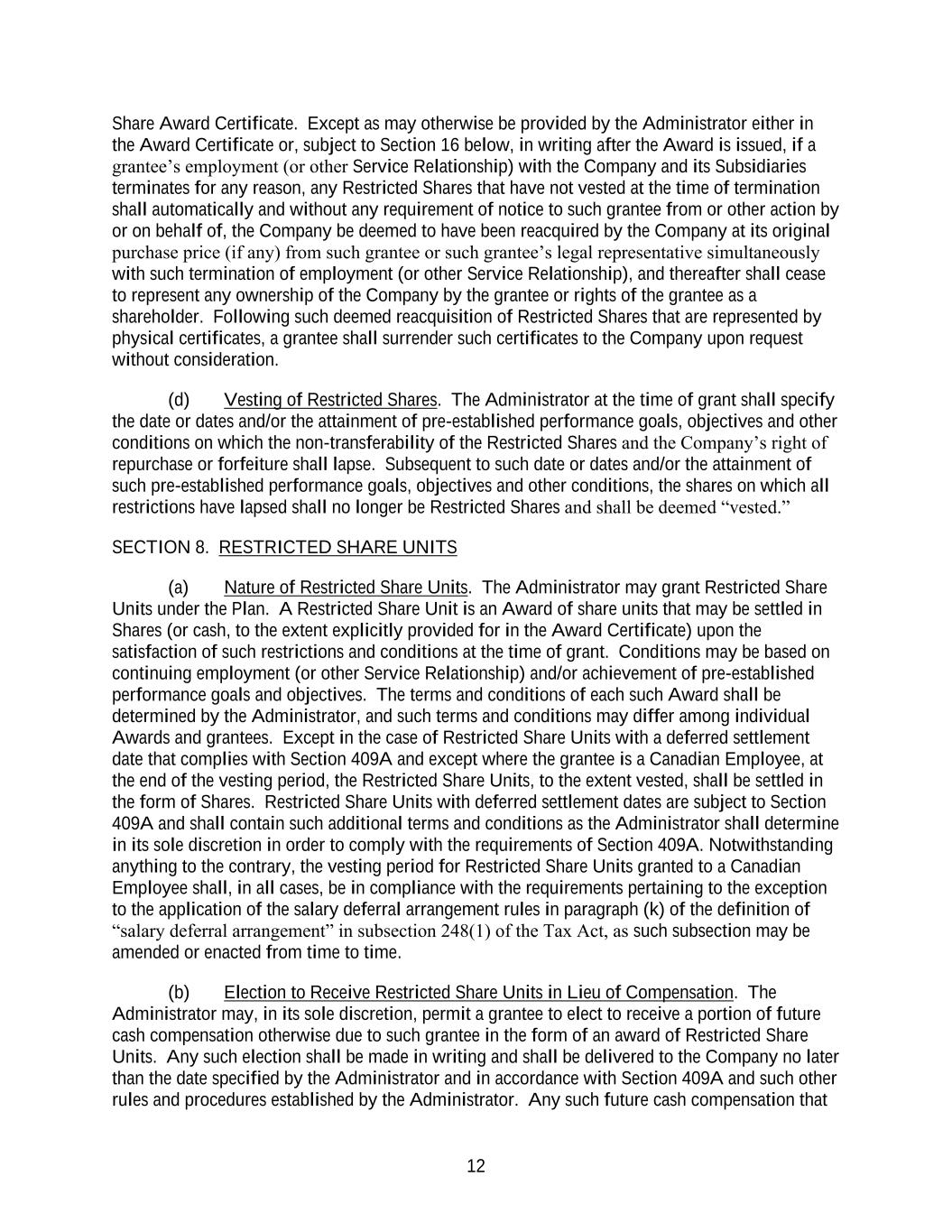 12 Share Award Certificate. Except as may otherwise be provided by the Administrator either in the Award Certificate or, subject to Section 16 below, in writing after the Award is issued, if a grantee’s employment (or other Service Relationship) with the Company and its Subsidiaries terminates for any reason, any Restricted Shares that have not vested at the time of termination shall automatically and without any requirement of notice to such grantee from or other action by or on behalf of, the Company be deemed to have been reacquired by the Company at its original purchase price (if any) from such grantee or such grantee’s legal representative simultaneously with such termination of employment (or other Service Relationship), and thereafter shall cease to represent any ownership of the Company by the grantee or rights of the grantee as a shareholder. Following such deemed reacquisition of Restricted Shares that are represented by physical certificates, a grantee shall surrender such certificates to the Company upon request without consideration. (d) Vesting of Restricted Shares. The Administrator at the time of grant shall specify the date or dates and/or the attainment of pre-established performance goals, objectives and other conditions on which the non-transferability of the Restricted Shares and the Company’s right of repurchase or forfeiture shall lapse. Subsequent to such date or dates and/or the attainment of such pre-established performance goals, objectives and other conditions, the shares on which all restrictions have lapsed shall no longer be Restricted Shares and shall be deemed “vested.” SECTION 8. RESTRICTED SHARE UNITS (a) Nature of Restricted Share Units. The Administrator may grant Restricted Share Units under the Plan. A Restricted Share Unit is an Award of share units that may be settled in Shares (or cash, to the extent explicitly provided for in the Award Certificate) upon the satisfaction of such restrictions and conditions at the time of grant. Conditions may be based on continuing employment (or other Service Relationship) and/or achievement of pre-established performance goals and objectives. The terms and conditions of each such Award shall be determined by the Administrator, and such terms and conditions may differ among individual Awards and grantees. Except in the case of Restricted Share Units with a deferred settlement date that complies with Section 409A and except where the grantee is a Canadian Employee, at the end of the vesting period, the Restricted Share Units, to the extent vested, shall be settled in the form of Shares. Restricted Share Units with deferred settlement dates are subject to Section 409A and shall contain such additional terms and conditions as the Administrator shall determine in its sole discretion in order to comply with the requirements of Section 409A. Notwithstanding anything to the contrary, the vesting period for Restricted Share Units granted to a Canadian Employee shall, in all cases, be in compliance with the requirements pertaining to the exception to the application of the salary deferral arrangement rules in paragraph (k) of the definition of “salary deferral arrangement” in subsection 248(1) of the Tax Act, as such subsection may be amended or enacted from time to time. (b) Election to Receive Restricted Share Units in Lieu of Compensation. The Administrator may, in its sole discretion, permit a grantee to elect to receive a portion of future cash compensation otherwise due to such grantee in the form of an award of Restricted Share Units. Any such election shall be made in writing and shall be delivered to the Company no later than the date specified by the Administrator and in accordance with Section 409A and such other rules and procedures established by the Administrator. Any such future cash compensation that