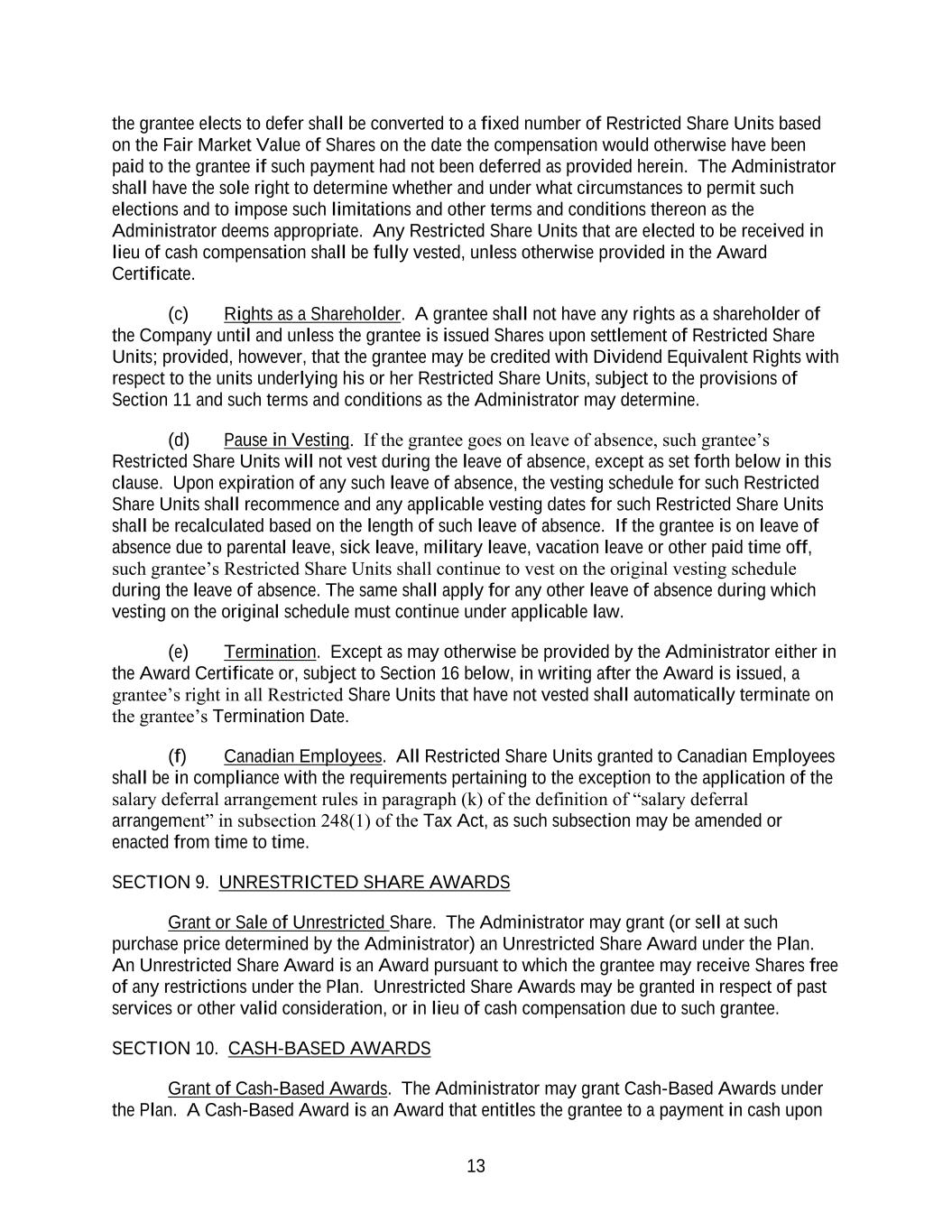 13 the grantee elects to defer shall be converted to a fixed number of Restricted Share Units based on the Fair Market Value of Shares on the date the compensation would otherwise have been paid to the grantee if such payment had not been deferred as provided herein. The Administrator shall have the sole right to determine whether and under what circumstances to permit such elections and to impose such limitations and other terms and conditions thereon as the Administrator deems appropriate. Any Restricted Share Units that are elected to be received in lieu of cash compensation shall be fully vested, unless otherwise provided in the Award Certificate. (c) Rights as a Shareholder. A grantee shall not have any rights as a shareholder of the Company until and unless the grantee is issued Shares upon settlement of Restricted Share Units; provided, however, that the grantee may be credited with Dividend Equivalent Rights with respect to the units underlying his or her Restricted Share Units, subject to the provisions of Section 11 and such terms and conditions as the Administrator may determine. (d) Pause in Vesting. If the grantee goes on leave of absence, such grantee’s Restricted Share Units will not vest during the leave of absence, except as set forth below in this clause. Upon expiration of any such leave of absence, the vesting schedule for such Restricted Share Units shall recommence and any applicable vesting dates for such Restricted Share Units shall be recalculated based on the length of such leave of absence. If the grantee is on leave of absence due to parental leave, sick leave, military leave, vacation leave or other paid time off, such grantee’s Restricted Share Units shall continue to vest on the original vesting schedule during the leave of absence. The same shall apply for any other leave of absence during which vesting on the original schedule must continue under applicable law. (e) Termination. Except as may otherwise be provided by the Administrator either in the Award Certificate or, subject to Section 16 below, in writing after the Award is issued, a grantee’s right in all Restricted Share Units that have not vested shall automatically terminate on the grantee’s Termination Date. (f) Canadian Employees. All Restricted Share Units granted to Canadian Employees shall be in compliance with the requirements pertaining to the exception to the application of the salary deferral arrangement rules in paragraph (k) of the definition of “salary deferral arrangement” in subsection 248(1) of the Tax Act, as such subsection may be amended or enacted from time to time. SECTION 9. UNRESTRICTED SHARE AWARDS Grant or Sale of Unrestricted Share. The Administrator may grant (or sell at such purchase price determined by the Administrator) an Unrestricted Share Award under the Plan. An Unrestricted Share Award is an Award pursuant to which the grantee may receive Shares free of any restrictions under the Plan. Unrestricted Share Awards may be granted in respect of past services or other valid consideration, or in lieu of cash compensation due to such grantee. SECTION 10. CASH-BASED AWARDS Grant of Cash-Based Awards. The Administrator may grant Cash-Based Awards under the Plan. A Cash-Based Award is an Award that entitles the grantee to a payment in cash upon