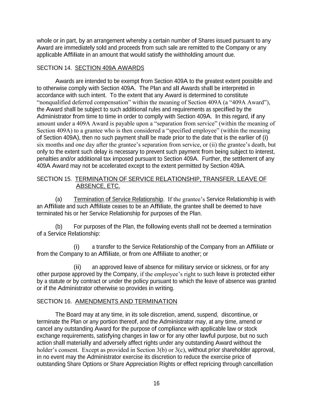 16 whole or in part, by an arrangement whereby a certain number of Shares issued pursuant to any Award are immediately sold and proceeds from such sale are remitted to the Company or any applicable Affiliate in an amount that would satisfy the withholding amount due. SECTION 14. SECTION 409A AWARDS Awards are intended to be exempt from Section 409A to the greatest extent possible and to otherwise comply with Section 409A. The Plan and all Awards shall be interpreted in accordance with such intent. To the extent that any Award is determined to constitute “nonqualified deferred compensation” within the meaning of Section 409A (a “409A Award”), the Award shall be subject to such additional rules and requirements as specified by the Administrator from time to time in order to comply with Section 409A. In this regard, if any amount under a 409A Award is payable upon a “separation from service” (within the meaning of Section 409A) to a grantee who is then considered a “specified employee” (within the meaning of Section 409A), then no such payment shall be made prior to the date that is the earlier of (i) six months and one day after the grantee’s separation from service, or (ii) the grantee’s death, but only to the extent such delay is necessary to prevent such payment from being subject to interest, penalties and/or additional tax imposed pursuant to Section 409A. Further, the settlement of any 409A Award may not be accelerated except to the extent permitted by Section 409A. SECTION 15. TERMINATION OF SERVICE RELATIONSHIP, TRANSFER, LEAVE OF ABSENCE, ETC. (a) Termination of Service Relationship. If the grantee’s Service Relationship is with an Affiliate and such Affiliate ceases to be an Affiliate, the grantee shall be deemed to have terminated his or her Service Relationship for purposes of the Plan. (b) For purposes of the Plan, the following events shall not be deemed a termination of a Service Relationship: (i) a transfer to the Service Relationship of the Company from an Affiliate or from the Company to an Affiliate, or from one Affiliate to another; or (ii) an approved leave of absence for military service or sickness, or for any other purpose approved by the Company, if the employee’s right to such leave is protected either by a statute or by contract or under the policy pursuant to which the leave of absence was granted or if the Administrator otherwise so provides in writing. SECTION 16. AMENDMENTS AND TERMINATION The Board may at any time, in its sole discretion, amend, suspend, discontinue, or terminate the Plan or any portion thereof, and the Administrator may, at any time, amend or cancel any outstanding Award for the purpose of compliance with applicable law or stock exchange requirements, satisfying changes in law or for any other lawful purpose, but no such action shall materially and adversely affect rights under any outstanding Award without the holder’s consent. Except as provided in Section 3(b) or 3(c), without prior shareholder approval, in no event may the Administrator exercise its discretion to reduce the exercise price of outstanding Share Options or Share Appreciation Rights or effect repricing through cancellation