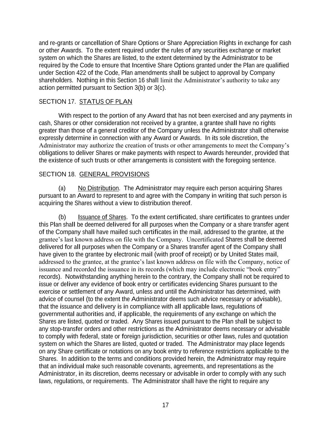 17 and re-grants or cancellation of Share Options or Share Appreciation Rights in exchange for cash or other Awards. To the extent required under the rules of any securities exchange or market system on which the Shares are listed, to the extent determined by the Administrator to be required by the Code to ensure that Incentive Share Options granted under the Plan are qualified under Section 422 of the Code, Plan amendments shall be subject to approval by Company shareholders. Nothing in this Section 16 shall limit the Administrator’s authority to take any action permitted pursuant to Section 3(b) or 3(c). SECTION 17. STATUS OF PLAN With respect to the portion of any Award that has not been exercised and any payments in cash, Shares or other consideration not received by a grantee, a grantee shall have no rights greater than those of a general creditor of the Company unless the Administrator shall otherwise expressly determine in connection with any Award or Awards. In its sole discretion, the Administrator may authorize the creation of trusts or other arrangements to meet the Company’s obligations to deliver Shares or make payments with respect to Awards hereunder, provided that the existence of such trusts or other arrangements is consistent with the foregoing sentence. SECTION 18. GENERAL PROVISIONS (a) No Distribution. The Administrator may require each person acquiring Shares pursuant to an Award to represent to and agree with the Company in writing that such person is acquiring the Shares without a view to distribution thereof. (b) Issuance of Shares. To the extent certificated, share certificates to grantees under this Plan shall be deemed delivered for all purposes when the Company or a share transfer agent of the Company shall have mailed such certificates in the mail, addressed to the grantee, at the grantee’s last known address on file with the Company. Uncertificated Shares shall be deemed delivered for all purposes when the Company or a Shares transfer agent of the Company shall have given to the grantee by electronic mail (with proof of receipt) or by United States mail, addressed to the grantee, at the grantee’s last known address on file with the Company, notice of issuance and recorded the issuance in its records (which may include electronic “book entry” records). Notwithstanding anything herein to the contrary, the Company shall not be required to issue or deliver any evidence of book entry or certificates evidencing Shares pursuant to the exercise or settlement of any Award, unless and until the Administrator has determined, with advice of counsel (to the extent the Administrator deems such advice necessary or advisable), that the issuance and delivery is in compliance with all applicable laws, regulations of governmental authorities and, if applicable, the requirements of any exchange on which the Shares are listed, quoted or traded. Any Shares issued pursuant to the Plan shall be subject to any stop-transfer orders and other restrictions as the Administrator deems necessary or advisable to comply with federal, state or foreign jurisdiction, securities or other laws, rules and quotation system on which the Shares are listed, quoted or traded. The Administrator may place legends on any Share certificate or notations on any book entry to reference restrictions applicable to the Shares. In addition to the terms and conditions provided herein, the Administrator may require that an individual make such reasonable covenants, agreements, and representations as the Administrator, in its discretion, deems necessary or advisable in order to comply with any such laws, regulations, or requirements. The Administrator shall have the right to require any