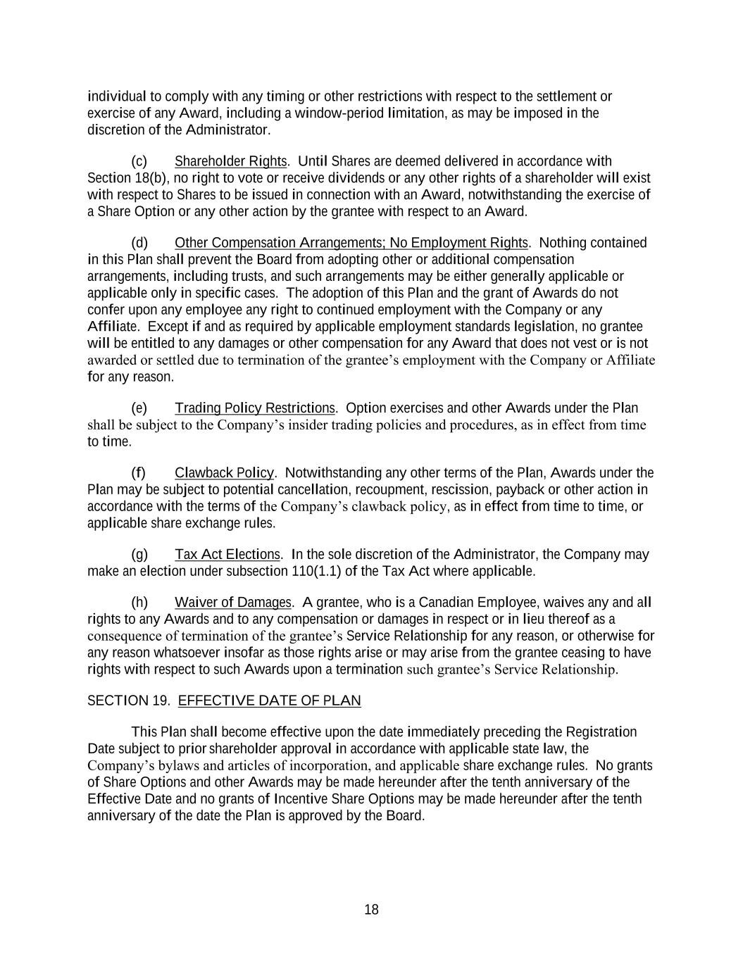 18 individual to comply with any timing or other restrictions with respect to the settlement or exercise of any Award, including a window-period limitation, as may be imposed in the discretion of the Administrator. (c) Shareholder Rights. Until Shares are deemed delivered in accordance with Section 18(b), no right to vote or receive dividends or any other rights of a shareholder will exist with respect to Shares to be issued in connection with an Award, notwithstanding the exercise of a Share Option or any other action by the grantee with respect to an Award. (d) Other Compensation Arrangements; No Employment Rights. Nothing contained in this Plan shall prevent the Board from adopting other or additional compensation arrangements, including trusts, and such arrangements may be either generally applicable or applicable only in specific cases. The adoption of this Plan and the grant of Awards do not confer upon any employee any right to continued employment with the Company or any Affiliate. Except if and as required by applicable employment standards legislation, no grantee will be entitled to any damages or other compensation for any Award that does not vest or is not awarded or settled due to termination of the grantee’s employment with the Company or Affiliate for any reason. (e) Trading Policy Restrictions. Option exercises and other Awards under the Plan shall be subject to the Company’s insider trading policies and procedures, as in effect from time to time. (f) Clawback Policy. Notwithstanding any other terms of the Plan, Awards under the Plan may be subject to potential cancellation, recoupment, rescission, payback or other action in accordance with the terms of the Company’s clawback policy, as in effect from time to time, or applicable share exchange rules. (g) Tax Act Elections. In the sole discretion of the Administrator, the Company may make an election under subsection 110(1.1) of the Tax Act where applicable. (h) Waiver of Damages. A grantee, who is a Canadian Employee, waives any and all rights to any Awards and to any compensation or damages in respect or in lieu thereof as a consequence of termination of the grantee’s Service Relationship for any reason, or otherwise for any reason whatsoever insofar as those rights arise or may arise from the grantee ceasing to have rights with respect to such Awards upon a termination such grantee’s Service Relationship. SECTION 19. EFFECTIVE DATE OF PLAN This Plan shall become effective upon the date immediately preceding the Registration Date subject to prior shareholder approval in accordance with applicable state law, the Company’s bylaws and articles of incorporation, and applicable share exchange rules. No grants of Share Options and other Awards may be made hereunder after the tenth anniversary of the Effective Date and no grants of Incentive Share Options may be made hereunder after the tenth anniversary of the date the Plan is approved by the Board.
