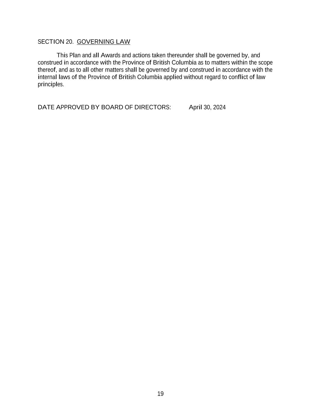 19 SECTION 20. GOVERNING LAW This Plan and all Awards and actions taken thereunder shall be governed by, and construed in accordance with the Province of British Columbia as to matters within the scope thereof, and as to all other matters shall be governed by and construed in accordance with the internal laws of the Province of British Columbia applied without regard to conflict of law principles. DATE APPROVED BY BOARD OF DIRECTORS: April 30, 2024