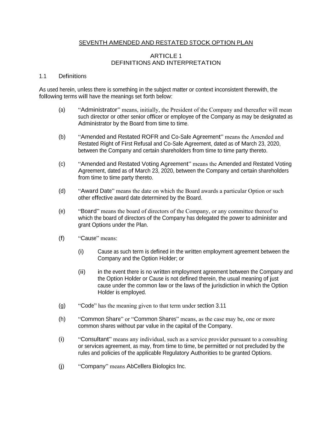 SEVENTH AMENDED AND RESTATED STOCK OPTION PLAN ARTICLE 1 DEFINITIONS AND INTERPRETATION 1.1 Definitions As used herein, unless there is something in the subject matter or context inconsistent therewith, the following terms will have the meanings set forth below: (a) “Administrator” means, initially, the President of the Company and thereafter will mean such director or other senior officer or employee of the Company as may be designated as Administrator by the Board from time to time. (b) “Amended and Restated ROFR and Co-Sale Agreement” means the Amended and Restated Right of First Refusal and Co-Sale Agreement, dated as of March 23, 2020, between the Company and certain shareholders from time to time party thereto. (c) “Amended and Restated Voting Agreement” means the Amended and Restated Voting Agreement, dated as of March 23, 2020, between the Company and certain shareholders from time to time party thereto. (d) “Award Date” means the date on which the Board awards a particular Option or such other effective award date determined by the Board. (e) “Board” means the board of directors of the Company, or any committee thereof to which the board of directors of the Company has delegated the power to administer and grant Options under the Plan. (f) “Cause” means: (i) Cause as such term is defined in the written employment agreement between the Company and the Option Holder; or (ii) in the event there is no written employment agreement between the Company and the Option Holder or Cause is not defined therein, the usual meaning of just cause under the common law or the laws of the jurisdiction in which the Option Holder is employed. (g) “Code” has the meaning given to that term under section 3.11 (h) “Common Share” or “Common Shares” means, as the case may be, one or more common shares without par value in the capital of the Company. (i) “Consultant” means any individual, such as a service provider pursuant to a consulting or services agreement, as may, from time to time, be permitted or not precluded by the rules and policies of the applicable Regulatory Authorities to be granted Options. (j) “Company” means AbCellera Biologics Inc.