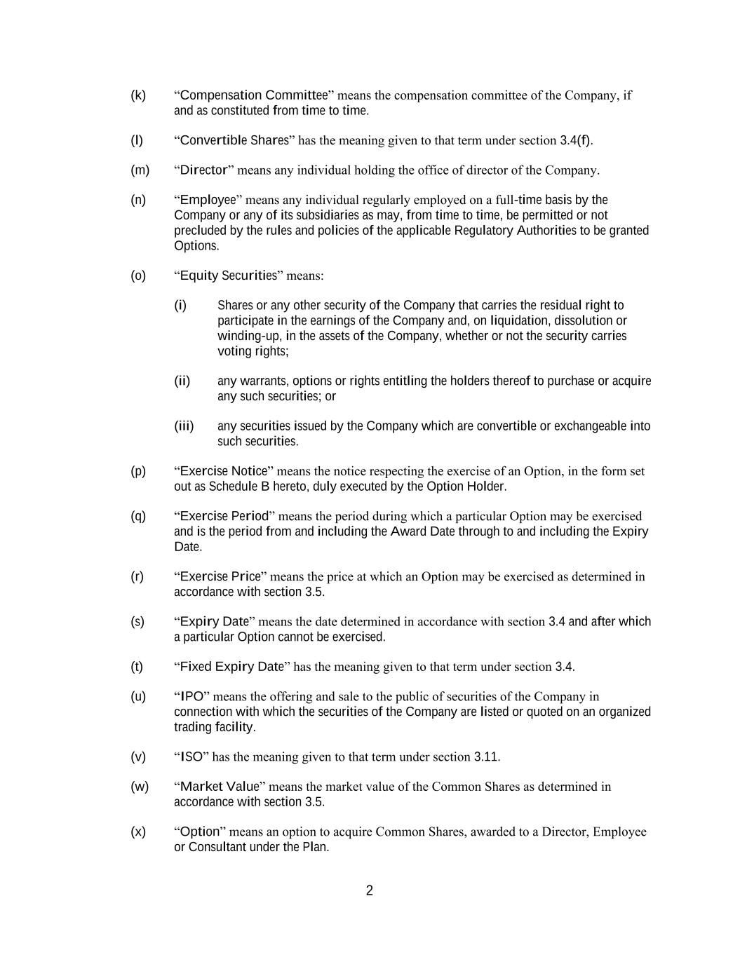 2 (k) “Compensation Committee” means the compensation committee of the Company, if and as constituted from time to time. (l) “Convertible Shares” has the meaning given to that term under section 3.4(f). (m) “Director” means any individual holding the office of director of the Company. (n) “Employee” means any individual regularly employed on a full-time basis by the Company or any of its subsidiaries as may, from time to time, be permitted or not precluded by the rules and policies of the applicable Regulatory Authorities to be granted Options. (o) “Equity Securities” means: (i) Shares or any other security of the Company that carries the residual right to participate in the earnings of the Company and, on liquidation, dissolution or winding-up, in the assets of the Company, whether or not the security carries voting rights; (ii) any warrants, options or rights entitling the holders thereof to purchase or acquire any such securities; or (iii) any securities issued by the Company which are convertible or exchangeable into such securities. (p) “Exercise Notice” means the notice respecting the exercise of an Option, in the form set out as Schedule B hereto, duly executed by the Option Holder. (q) “Exercise Period” means the period during which a particular Option may be exercised and is the period from and including the Award Date through to and including the Expiry Date. (r) “Exercise Price” means the price at which an Option may be exercised as determined in accordance with section 3.5. (s) “Expiry Date” means the date determined in accordance with section 3.4 and after which a particular Option cannot be exercised. (t) “Fixed Expiry Date” has the meaning given to that term under section 3.4. (u) “IPO” means the offering and sale to the public of securities of the Company in connection with which the securities of the Company are listed or quoted on an organized trading facility. (v) “ISO” has the meaning given to that term under section 3.11. (w) “Market Value” means the market value of the Common Shares as determined in accordance with section 3.5. (x) “Option” means an option to acquire Common Shares, awarded to a Director, Employee or Consultant under the Plan.