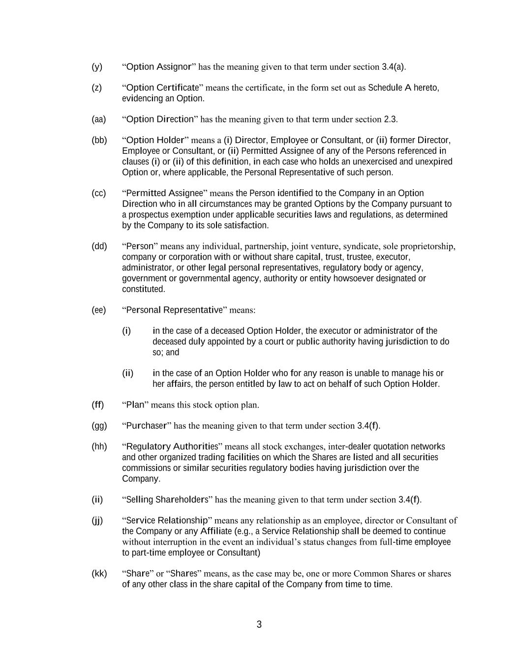 3 (y) “Option Assignor” has the meaning given to that term under section 3.4(a). (z) “Option Certificate” means the certificate, in the form set out as Schedule A hereto, evidencing an Option. (aa) “Option Direction” has the meaning given to that term under section 2.3. (bb) “Option Holder” means a (i) Director, Employee or Consultant, or (ii) former Director, Employee or Consultant, or (ii) Permitted Assignee of any of the Persons referenced in clauses (i) or (ii) of this definition, in each case who holds an unexercised and unexpired Option or, where applicable, the Personal Representative of such person. (cc) “Permitted Assignee” means the Person identified to the Company in an Option Direction who in all circumstances may be granted Options by the Company pursuant to a prospectus exemption under applicable securities laws and regulations, as determined by the Company to its sole satisfaction. (dd) “Person” means any individual, partnership, joint venture, syndicate, sole proprietorship, company or corporation with or without share capital, trust, trustee, executor, administrator, or other legal personal representatives, regulatory body or agency, government or governmental agency, authority or entity howsoever designated or constituted. (ee) “Personal Representative” means: (i) in the case of a deceased Option Holder, the executor or administrator of the deceased duly appointed by a court or public authority having jurisdiction to do so; and (ii) in the case of an Option Holder who for any reason is unable to manage his or her affairs, the person entitled by law to act on behalf of such Option Holder. (ff) “Plan” means this stock option plan. (gg) “Purchaser” has the meaning given to that term under section 3.4(f). (hh) “Regulatory Authorities” means all stock exchanges, inter-dealer quotation networks and other organized trading facilities on which the Shares are listed and all securities commissions or similar securities regulatory bodies having jurisdiction over the Company. (ii) “Selling Shareholders” has the meaning given to that term under section 3.4(f). (jj) “Service Relationship” means any relationship as an employee, director or Consultant of the Company or any Affiliate (e.g., a Service Relationship shall be deemed to continue without interruption in the event an individual’s status changes from full-time employee to part-time employee or Consultant) (kk) “Share” or “Shares” means, as the case may be, one or more Common Shares or shares of any other class in the share capital of the Company from time to time.