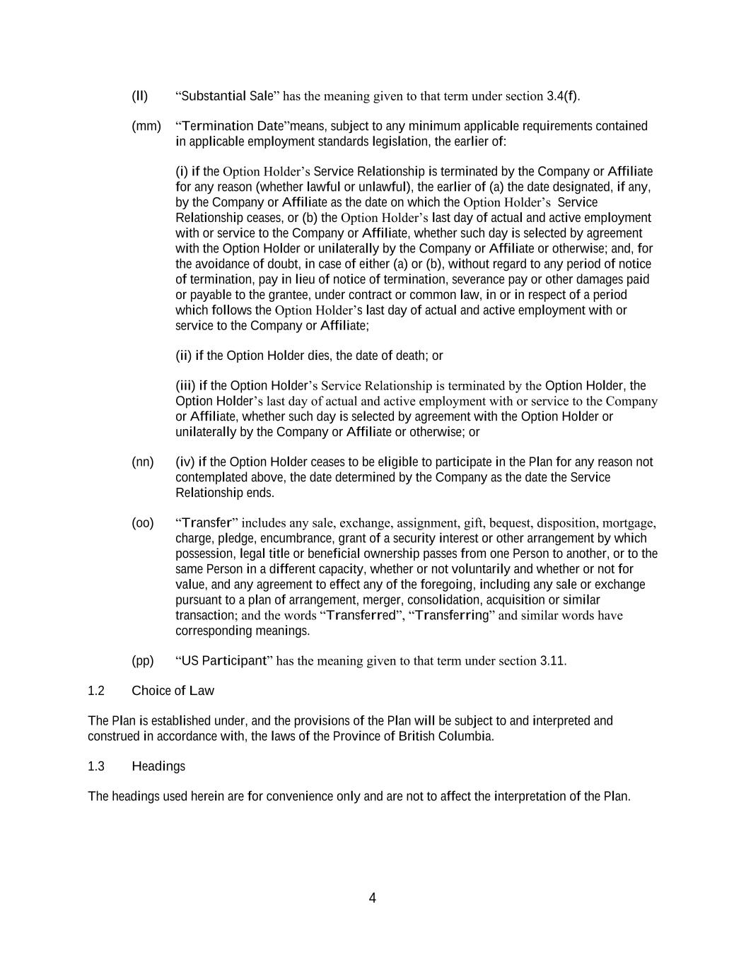 4 (ll) “Substantial Sale” has the meaning given to that term under section 3.4(f). (mm) “Termination Date”means, subject to any minimum applicable requirements contained in applicable employment standards legislation, the earlier of: (i) if the Option Holder’s Service Relationship is terminated by the Company or Affiliate for any reason (whether lawful or unlawful), the earlier of (a) the date designated, if any, by the Company or Affiliate as the date on which the Option Holder’s Service Relationship ceases, or (b) the Option Holder’s last day of actual and active employment with or service to the Company or Affiliate, whether such day is selected by agreement with the Option Holder or unilaterally by the Company or Affiliate or otherwise; and, for the avoidance of doubt, in case of either (a) or (b), without regard to any period of notice of termination, pay in lieu of notice of termination, severance pay or other damages paid or payable to the grantee, under contract or common law, in or in respect of a period which follows the Option Holder’s last day of actual and active employment with or service to the Company or Affiliate; (ii) if the Option Holder dies, the date of death; or (iii) if the Option Holder’s Service Relationship is terminated by the Option Holder, the Option Holder’s last day of actual and active employment with or service to the Company or Affiliate, whether such day is selected by agreement with the Option Holder or unilaterally by the Company or Affiliate or otherwise; or (nn) (iv) if the Option Holder ceases to be eligible to participate in the Plan for any reason not contemplated above, the date determined by the Company as the date the Service Relationship ends. (oo) “Transfer” includes any sale, exchange, assignment, gift, bequest, disposition, mortgage, charge, pledge, encumbrance, grant of a security interest or other arrangement by which possession, legal title or beneficial ownership passes from one Person to another, or to the same Person in a different capacity, whether or not voluntarily and whether or not for value, and any agreement to effect any of the foregoing, including any sale or exchange pursuant to a plan of arrangement, merger, consolidation, acquisition or similar transaction; and the words “Transferred”, “Transferring” and similar words have corresponding meanings. (pp) “US Participant” has the meaning given to that term under section 3.11. 1.2 Choice of Law The Plan is established under, and the provisions of the Plan will be subject to and interpreted and construed in accordance with, the laws of the Province of British Columbia. 1.3 Headings The headings used herein are for convenience only and are not to affect the interpretation of the Plan.