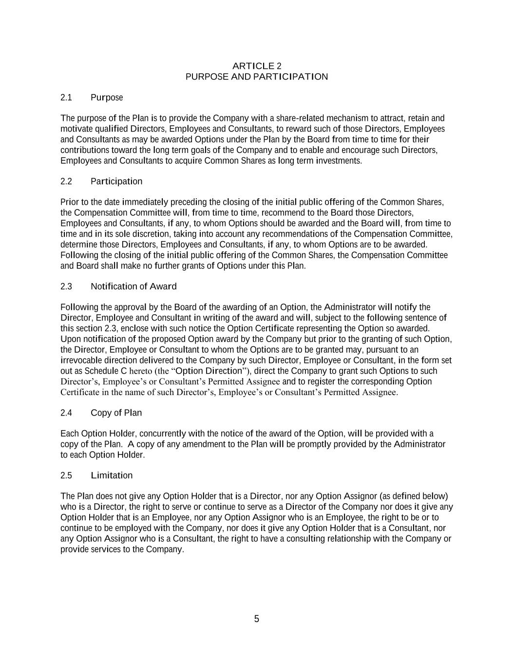 5 ARTICLE 2 PURPOSE AND PARTICIPATION 2.1 Purpose The purpose of the Plan is to provide the Company with a share-related mechanism to attract, retain and motivate qualified Directors, Employees and Consultants, to reward such of those Directors, Employees and Consultants as may be awarded Options under the Plan by the Board from time to time for their contributions toward the long term goals of the Company and to enable and encourage such Directors, Employees and Consultants to acquire Common Shares as long term investments. 2.2 Participation Prior to the date immediately preceding the closing of the initial public offering of the Common Shares, the Compensation Committee will, from time to time, recommend to the Board those Directors, Employees and Consultants, if any, to whom Options should be awarded and the Board will, from time to time and in its sole discretion, taking into account any recommendations of the Compensation Committee, determine those Directors, Employees and Consultants, if any, to whom Options are to be awarded. Following the closing of the initial public offering of the Common Shares, the Compensation Committee and Board shall make no further grants of Options under this Plan. 2.3 Notification of Award Following the approval by the Board of the awarding of an Option, the Administrator will notify the Director, Employee and Consultant in writing of the award and will, subject to the following sentence of this section 2.3, enclose with such notice the Option Certificate representing the Option so awarded. Upon notification of the proposed Option award by the Company but prior to the granting of such Option, the Director, Employee or Consultant to whom the Options are to be granted may, pursuant to an irrevocable direction delivered to the Company by such Director, Employee or Consultant, in the form set out as Schedule C hereto (the “Option Direction”), direct the Company to grant such Options to such Director’s, Employee’s or Consultant’s Permitted Assignee and to register the corresponding Option Certificate in the name of such Director’s, Employee’s or Consultant’s Permitted Assignee. 2.4 Copy of Plan Each Option Holder, concurrently with the notice of the award of the Option, will be provided with a copy of the Plan. A copy of any amendment to the Plan will be promptly provided by the Administrator to each Option Holder. 2.5 Limitation The Plan does not give any Option Holder that is a Director, nor any Option Assignor (as defined below) who is a Director, the right to serve or continue to serve as a Director of the Company nor does it give any Option Holder that is an Employee, nor any Option Assignor who is an Employee, the right to be or to continue to be employed with the Company, nor does it give any Option Holder that is a Consultant, nor any Option Assignor who is a Consultant, the right to have a consulting relationship with the Company or provide services to the Company.