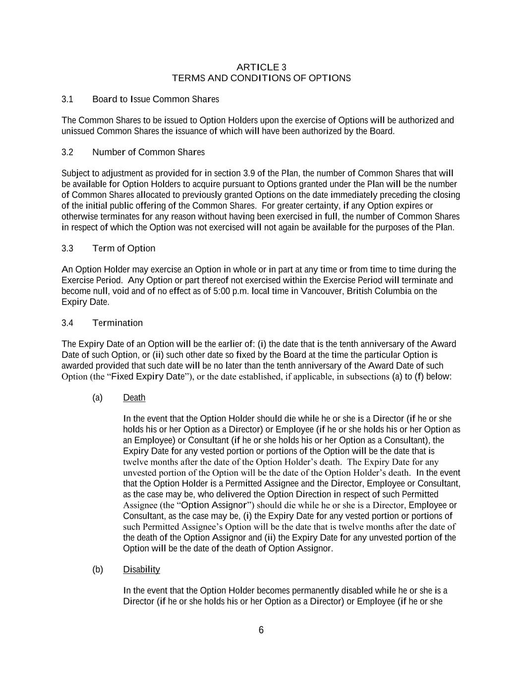 6 ARTICLE 3 TERMS AND CONDITIONS OF OPTIONS 3.1 Board to Issue Common Shares The Common Shares to be issued to Option Holders upon the exercise of Options will be authorized and unissued Common Shares the issuance of which will have been authorized by the Board. 3.2 Number of Common Shares Subject to adjustment as provided for in section 3.9 of the Plan, the number of Common Shares that will be available for Option Holders to acquire pursuant to Options granted under the Plan will be the number of Common Shares allocated to previously granted Options on the date immediately preceding the closing of the initial public offering of the Common Shares. For greater certainty, if any Option expires or otherwise terminates for any reason without having been exercised in full, the number of Common Shares in respect of which the Option was not exercised will not again be available for the purposes of the Plan. 3.3 Term of Option An Option Holder may exercise an Option in whole or in part at any time or from time to time during the Exercise Period. Any Option or part thereof not exercised within the Exercise Period will terminate and become null, void and of no effect as of 5:00 p.m. local time in Vancouver, British Columbia on the Expiry Date. 3.4 Termination The Expiry Date of an Option will be the earlier of: (i) the date that is the tenth anniversary of the Award Date of such Option, or (ii) such other date so fixed by the Board at the time the particular Option is awarded provided that such date will be no later than the tenth anniversary of the Award Date of such Option (the “Fixed Expiry Date”), or the date established, if applicable, in subsections (a) to (f) below: (a) Death In the event that the Option Holder should die while he or she is a Director (if he or she holds his or her Option as a Director) or Employee (if he or she holds his or her Option as an Employee) or Consultant (if he or she holds his or her Option as a Consultant), the Expiry Date for any vested portion or portions of the Option will be the date that is twelve months after the date of the Option Holder’s death. The Expiry Date for any unvested portion of the Option will be the date of the Option Holder’s death. In the event that the Option Holder is a Permitted Assignee and the Director, Employee or Consultant, as the case may be, who delivered the Option Direction in respect of such Permitted Assignee (the “Option Assignor”) should die while he or she is a Director, Employee or Consultant, as the case may be, (i) the Expiry Date for any vested portion or portions of such Permitted Assignee’s Option will be the date that is twelve months after the date of the death of the Option Assignor and (ii) the Expiry Date for any unvested portion of the Option will be the date of the death of Option Assignor. (b) Disability In the event that the Option Holder becomes permanently disabled while he or she is a Director (if he or she holds his or her Option as a Director) or Employee (if he or she