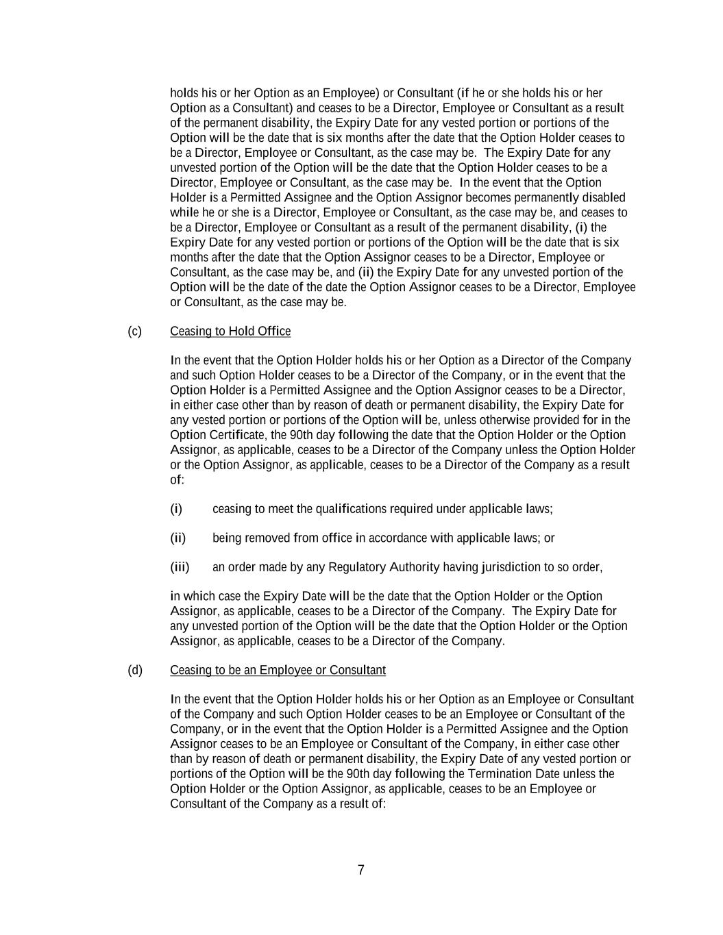 7 holds his or her Option as an Employee) or Consultant (if he or she holds his or her Option as a Consultant) and ceases to be a Director, Employee or Consultant as a result of the permanent disability, the Expiry Date for any vested portion or portions of the Option will be the date that is six months after the date that the Option Holder ceases to be a Director, Employee or Consultant, as the case may be. The Expiry Date for any unvested portion of the Option will be the date that the Option Holder ceases to be a Director, Employee or Consultant, as the case may be. In the event that the Option Holder is a Permitted Assignee and the Option Assignor becomes permanently disabled while he or she is a Director, Employee or Consultant, as the case may be, and ceases to be a Director, Employee or Consultant as a result of the permanent disability, (i) the Expiry Date for any vested portion or portions of the Option will be the date that is six months after the date that the Option Assignor ceases to be a Director, Employee or Consultant, as the case may be, and (ii) the Expiry Date for any unvested portion of the Option will be the date of the date the Option Assignor ceases to be a Director, Employee or Consultant, as the case may be. (c) Ceasing to Hold Office In the event that the Option Holder holds his or her Option as a Director of the Company and such Option Holder ceases to be a Director of the Company, or in the event that the Option Holder is a Permitted Assignee and the Option Assignor ceases to be a Director, in either case other than by reason of death or permanent disability, the Expiry Date for any vested portion or portions of the Option will be, unless otherwise provided for in the Option Certificate, the 90th day following the date that the Option Holder or the Option Assignor, as applicable, ceases to be a Director of the Company unless the Option Holder or the Option Assignor, as applicable, ceases to be a Director of the Company as a result of: (i) ceasing to meet the qualifications required under applicable laws; (ii) being removed from office in accordance with applicable laws; or (iii) an order made by any Regulatory Authority having jurisdiction to so order, in which case the Expiry Date will be the date that the Option Holder or the Option Assignor, as applicable, ceases to be a Director of the Company. The Expiry Date for any unvested portion of the Option will be the date that the Option Holder or the Option Assignor, as applicable, ceases to be a Director of the Company. (d) Ceasing to be an Employee or Consultant In the event that the Option Holder holds his or her Option as an Employee or Consultant of the Company and such Option Holder ceases to be an Employee or Consultant of the Company, or in the event that the Option Holder is a Permitted Assignee and the Option Assignor ceases to be an Employee or Consultant of the Company, in either case other than by reason of death or permanent disability, the Expiry Date of any vested portion or portions of the Option will be the 90th day following the Termination Date unless the Option Holder or the Option Assignor, as applicable, ceases to be an Employee or Consultant of the Company as a result of: