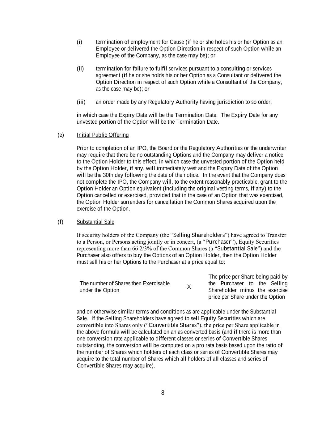 8 (i) termination of employment for Cause (if he or she holds his or her Option as an Employee or delivered the Option Direction in respect of such Option while an Employee of the Company, as the case may be); or (ii) termination for failure to fulfil services pursuant to a consulting or services agreement (if he or she holds his or her Option as a Consultant or delivered the Option Direction in respect of such Option while a Consultant of the Company, as the case may be); or (iii) an order made by any Regulatory Authority having jurisdiction to so order, in which case the Expiry Date will be the Termination Date. The Expiry Date for any unvested portion of the Option will be the Termination Date. (e) Initial Public Offering Prior to completion of an IPO, the Board or the Regulatory Authorities or the underwriter may require that there be no outstanding Options and the Company may deliver a notice to the Option Holder to this effect, in which case the unvested portion of the Option held by the Option Holder, if any, will immediately vest and the Expiry Date of the Option will be the 30th day following the date of the notice. In the event that the Company does not complete the IPO, the Company will, to the extent reasonably practicable, grant to the Option Holder an Option equivalent (including the original vesting terms, if any) to the Option cancelled or exercised, provided that in the case of an Option that was exercised, the Option Holder surrenders for cancellation the Common Shares acquired upon the exercise of the Option. (f) Substantial Sale If security holders of the Company (the “Selling Shareholders”) have agreed to Transfer to a Person, or Persons acting jointly or in concert, (a “Purchaser”), Equity Securities representing more than 66 2/3% of the Common Shares (a “Substantial Sale”) and the Purchaser also offers to buy the Options of an Option Holder, then the Option Holder must sell his or her Options to the Purchaser at a price equal to: The number of Shares then Exercisable under the Option X The price per Share being paid by the Purchaser to the Selling Shareholder minus the exercise price per Share under the Option and on otherwise similar terms and conditions as are applicable under the Substantial Sale. If the Selling Shareholders have agreed to sell Equity Securities which are convertible into Shares only (“Convertible Shares”), the price per Share applicable in the above formula will be calculated on an as converted basis (and if there is more than one conversion rate applicable to different classes or series of Convertible Shares outstanding, the conversion will be computed on a pro rata basis based upon the ratio of the number of Shares which holders of each class or series of Convertible Shares may acquire to the total number of Shares which all holders of all classes and series of Convertible Shares may acquire).
