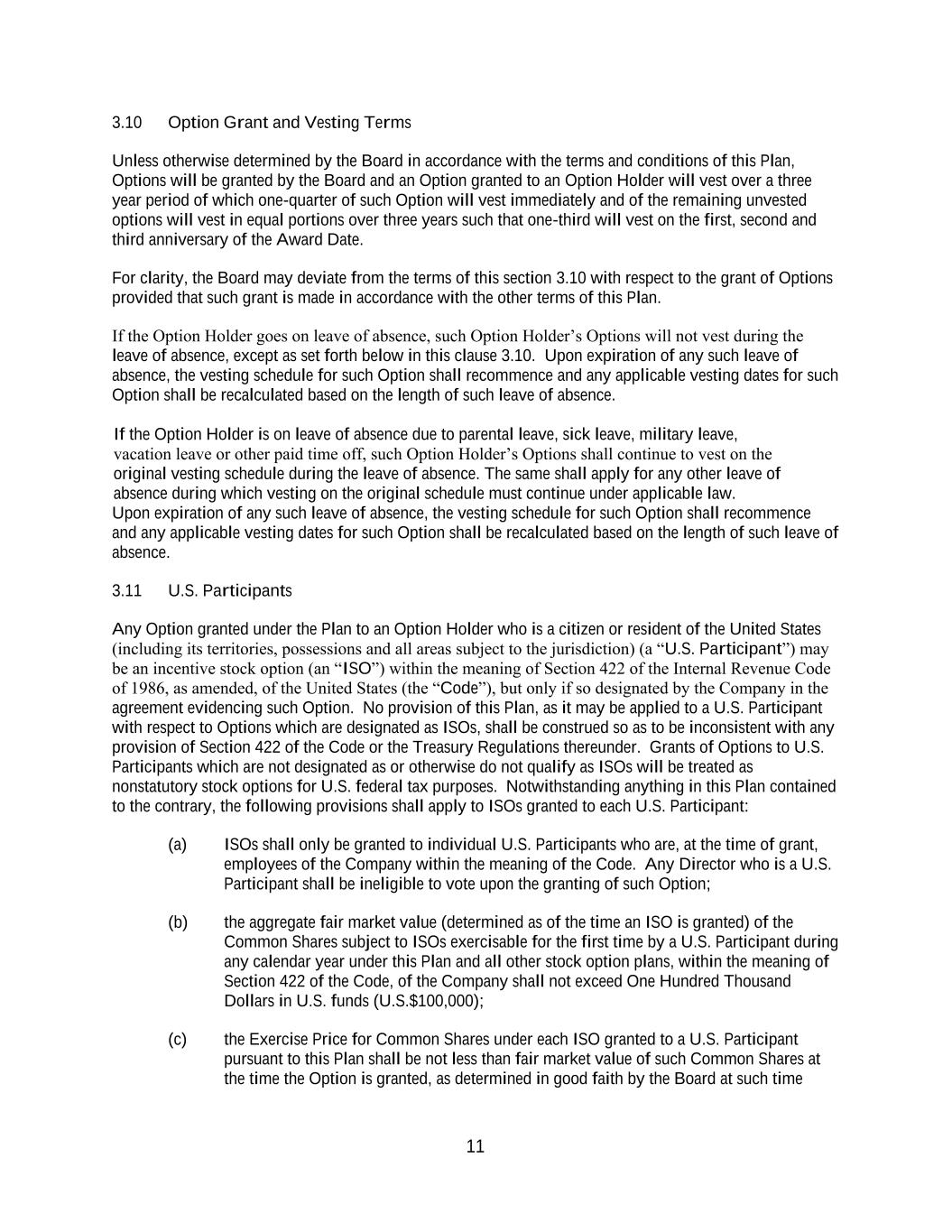 11 3.10 Option Grant and Vesting Terms Unless otherwise determined by the Board in accordance with the terms and conditions of this Plan, Options will be granted by the Board and an Option granted to an Option Holder will vest over a three year period of which one-quarter of such Option will vest immediately and of the remaining unvested options will vest in equal portions over three years such that one-third will vest on the first, second and third anniversary of the Award Date. For clarity, the Board may deviate from the terms of this section 3.10 with respect to the grant of Options provided that such grant is made in accordance with the other terms of this Plan. If the Option Holder goes on leave of absence, such Option Holder’s Options will not vest during the leave of absence, except as set forth below in this clause 3.10. Upon expiration of any such leave of absence, the vesting schedule for such Option shall recommence and any applicable vesting dates for such Option shall be recalculated based on the length of such leave of absence. If the Option Holder is on leave of absence due to parental leave, sick leave, military leave, vacation leave or other paid time off, such Option Holder’s Options shall continue to vest on the original vesting schedule during the leave of absence. The same shall apply for any other leave of absence during which vesting on the original schedule must continue under applicable law. Upon expiration of any such leave of absence, the vesting schedule for such Option shall recommence and any applicable vesting dates for such Option shall be recalculated based on the length of such leave of absence. 3.11 U.S. Participants Any Option granted under the Plan to an Option Holder who is a citizen or resident of the United States (including its territories, possessions and all areas subject to the jurisdiction) (a “U.S. Participant”) may be an incentive stock option (an “ISO”) within the meaning of Section 422 of the Internal Revenue Code of 1986, as amended, of the United States (the “Code”), but only if so designated by the Company in the agreement evidencing such Option. No provision of this Plan, as it may be applied to a U.S. Participant with respect to Options which are designated as ISOs, shall be construed so as to be inconsistent with any provision of Section 422 of the Code or the Treasury Regulations thereunder. Grants of Options to U.S. Participants which are not designated as or otherwise do not qualify as ISOs will be treated as nonstatutory stock options for U.S. federal tax purposes. Notwithstanding anything in this Plan contained to the contrary, the following provisions shall apply to ISOs granted to each U.S. Participant: (a) ISOs shall only be granted to individual U.S. Participants who are, at the time of grant, employees of the Company within the meaning of the Code. Any Director who is a U.S. Participant shall be ineligible to vote upon the granting of such Option; (b) the aggregate fair market value (determined as of the time an ISO is granted) of the Common Shares subject to ISOs exercisable for the first time by a U.S. Participant during any calendar year under this Plan and all other stock option plans, within the meaning of Section 422 of the Code, of the Company shall not exceed One Hundred Thousand Dollars in U.S. funds (U.S.$100,000); (c) the Exercise Price for Common Shares under each ISO granted to a U.S. Participant pursuant to this Plan shall be not less than fair market value of such Common Shares at the time the Option is granted, as determined in good faith by the Board at such time
