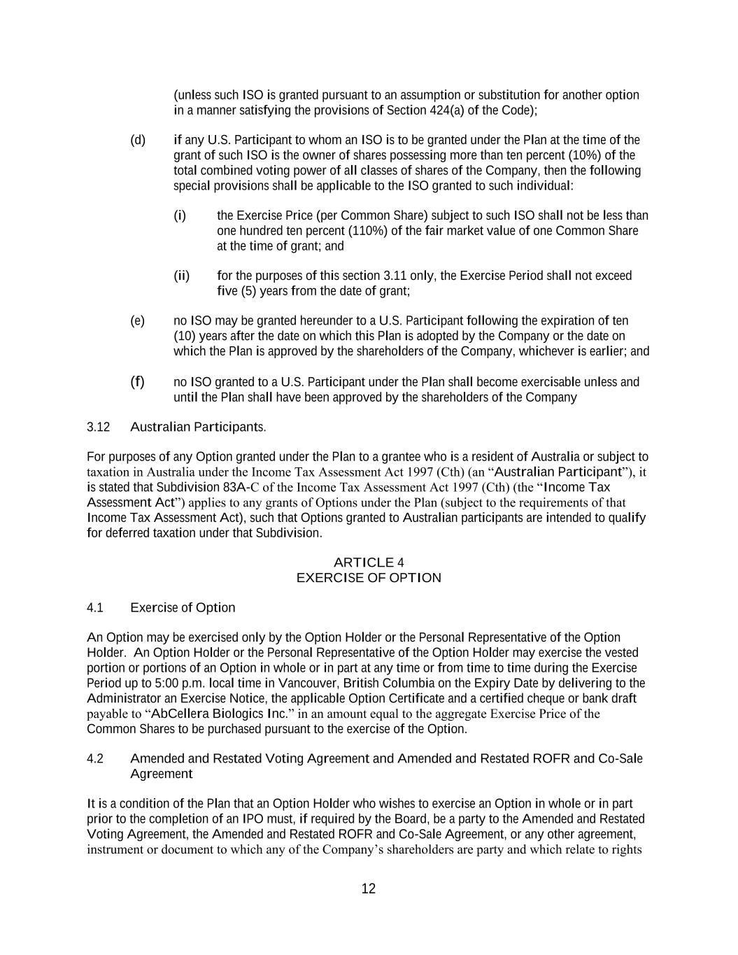 12 (unless such ISO is granted pursuant to an assumption or substitution for another option in a manner satisfying the provisions of Section 424(a) of the Code); (d) if any U.S. Participant to whom an ISO is to be granted under the Plan at the time of the grant of such ISO is the owner of shares possessing more than ten percent (10%) of the total combined voting power of all classes of shares of the Company, then the following special provisions shall be applicable to the ISO granted to such individual: (i) the Exercise Price (per Common Share) subject to such ISO shall not be less than one hundred ten percent (110%) of the fair market value of one Common Share at the time of grant; and (ii) for the purposes of this section 3.11 only, the Exercise Period shall not exceed five (5) years from the date of grant; (e) no ISO may be granted hereunder to a U.S. Participant following the expiration of ten (10) years after the date on which this Plan is adopted by the Company or the date on which the Plan is approved by the shareholders of the Company, whichever is earlier; and (f) no ISO granted to a U.S. Participant under the Plan shall become exercisable unless and until the Plan shall have been approved by the shareholders of the Company 3.12 Australian Participants. For purposes of any Option granted under the Plan to a grantee who is a resident of Australia or subject to taxation in Australia under the Income Tax Assessment Act 1997 (Cth) (an “Australian Participant”), it is stated that Subdivision 83A-C of the Income Tax Assessment Act 1997 (Cth) (the “Income Tax Assessment Act”) applies to any grants of Options under the Plan (subject to the requirements of that Income Tax Assessment Act), such that Options granted to Australian participants are intended to qualify for deferred taxation under that Subdivision. ARTICLE 4 EXERCISE OF OPTION 4.1 Exercise of Option An Option may be exercised only by the Option Holder or the Personal Representative of the Option Holder. An Option Holder or the Personal Representative of the Option Holder may exercise the vested portion or portions of an Option in whole or in part at any time or from time to time during the Exercise Period up to 5:00 p.m. local time in Vancouver, British Columbia on the Expiry Date by delivering to the Administrator an Exercise Notice, the applicable Option Certificate and a certified cheque or bank draft payable to “AbCellera Biologics Inc.” in an amount equal to the aggregate Exercise Price of the Common Shares to be purchased pursuant to the exercise of the Option. 4.2 Amended and Restated Voting Agreement and Amended and Restated ROFR and Co-Sale Agreement It is a condition of the Plan that an Option Holder who wishes to exercise an Option in whole or in part prior to the completion of an IPO must, if required by the Board, be a party to the Amended and Restated Voting Agreement, the Amended and Restated ROFR and Co-Sale Agreement, or any other agreement, instrument or document to which any of the Company’s shareholders are party and which relate to rights