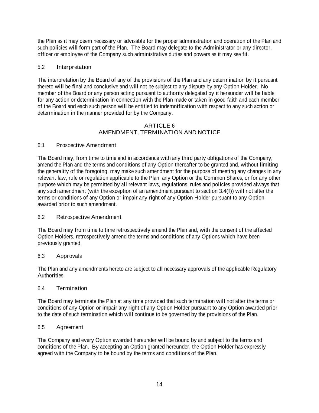 14 the Plan as it may deem necessary or advisable for the proper administration and operation of the Plan and such policies will form part of the Plan. The Board may delegate to the Administrator or any director, officer or employee of the Company such administrative duties and powers as it may see fit. 5.2 Interpretation The interpretation by the Board of any of the provisions of the Plan and any determination by it pursuant thereto will be final and conclusive and will not be subject to any dispute by any Option Holder. No member of the Board or any person acting pursuant to authority delegated by it hereunder will be liable for any action or determination in connection with the Plan made or taken in good faith and each member of the Board and each such person will be entitled to indemnification with respect to any such action or determination in the manner provided for by the Company. ARTICLE 6 AMENDMENT, TERMINATION AND NOTICE 6.1 Prospective Amendment The Board may, from time to time and in accordance with any third party obligations of the Company, amend the Plan and the terms and conditions of any Option thereafter to be granted and, without limiting the generality of the foregoing, may make such amendment for the purpose of meeting any changes in any relevant law, rule or regulation applicable to the Plan, any Option or the Common Shares, or for any other purpose which may be permitted by all relevant laws, regulations, rules and policies provided always that any such amendment (with the exception of an amendment pursuant to section 3.4(f)) will not alter the terms or conditions of any Option or impair any right of any Option Holder pursuant to any Option awarded prior to such amendment. 6.2 Retrospective Amendment The Board may from time to time retrospectively amend the Plan and, with the consent of the affected Option Holders, retrospectively amend the terms and conditions of any Options which have been previously granted. 6.3 Approvals The Plan and any amendments hereto are subject to all necessary approvals of the applicable Regulatory Authorities. 6.4 Termination The Board may terminate the Plan at any time provided that such termination will not alter the terms or conditions of any Option or impair any right of any Option Holder pursuant to any Option awarded prior to the date of such termination which will continue to be governed by the provisions of the Plan. 6.5 Agreement The Company and every Option awarded hereunder will be bound by and subject to the terms and conditions of the Plan. By accepting an Option granted hereunder, the Option Holder has expressly agreed with the Company to be bound by the terms and conditions of the Plan.