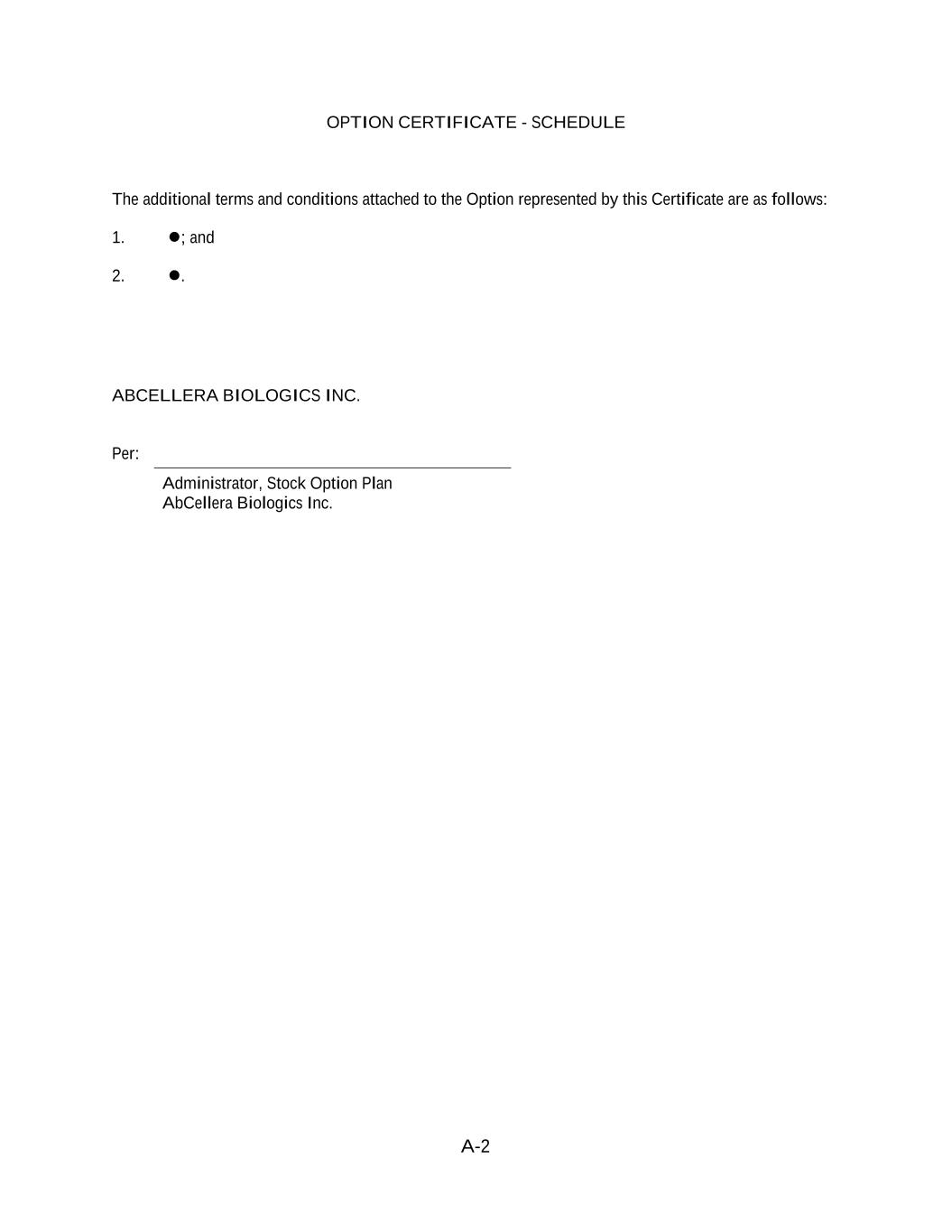 A-2 OPTION CERTIFICATE - SCHEDULE The additional terms and conditions attached to the Option represented by this Certificate are as follows: 1. ⚫; and 2. ⚫. ABCELLERA BIOLOGICS INC. Per: Administrator, Stock Option Plan AbCellera Biologics Inc.