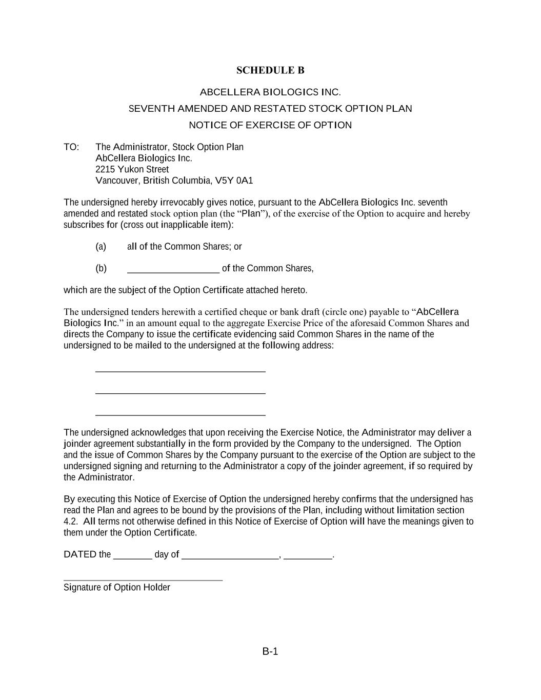 B-1 SCHEDULE B ABCELLERA BIOLOGICS INC. SEVENTH AMENDED AND RESTATED STOCK OPTION PLAN NOTICE OF EXERCISE OF OPTION TO: The Administrator, Stock Option Plan AbCellera Biologics Inc. 2215 Yukon Street Vancouver, British Columbia, V5Y 0A1 The undersigned hereby irrevocably gives notice, pursuant to the AbCellera Biologics Inc. seventh amended and restated stock option plan (the “Plan”), of the exercise of the Option to acquire and hereby subscribes for (cross out inapplicable item): (a) all of the Common Shares; or (b) ___________________ of the Common Shares, which are the subject of the Option Certificate attached hereto. The undersigned tenders herewith a certified cheque or bank draft (circle one) payable to “AbCellera Biologics Inc.” in an amount equal to the aggregate Exercise Price of the aforesaid Common Shares and directs the Company to issue the certificate evidencing said Common Shares in the name of the undersigned to be mailed to the undersigned at the following address: ___________________________________ ___________________________________ ___________________________________ The undersigned acknowledges that upon receiving the Exercise Notice, the Administrator may deliver a joinder agreement substantially in the form provided by the Company to the undersigned. The Option and the issue of Common Shares by the Company pursuant to the exercise of the Option are subject to the undersigned signing and returning to the Administrator a copy of the joinder agreement, if so required by the Administrator. By executing this Notice of Exercise of Option the undersigned hereby confirms that the undersigned has read the Plan and agrees to be bound by the provisions of the Plan, including without limitation section 4.2. All terms not otherwise defined in this Notice of Exercise of Option will have the meanings given to them under the Option Certificate. DATED the ________ day of ____________________, __________. Signature of Option Holder