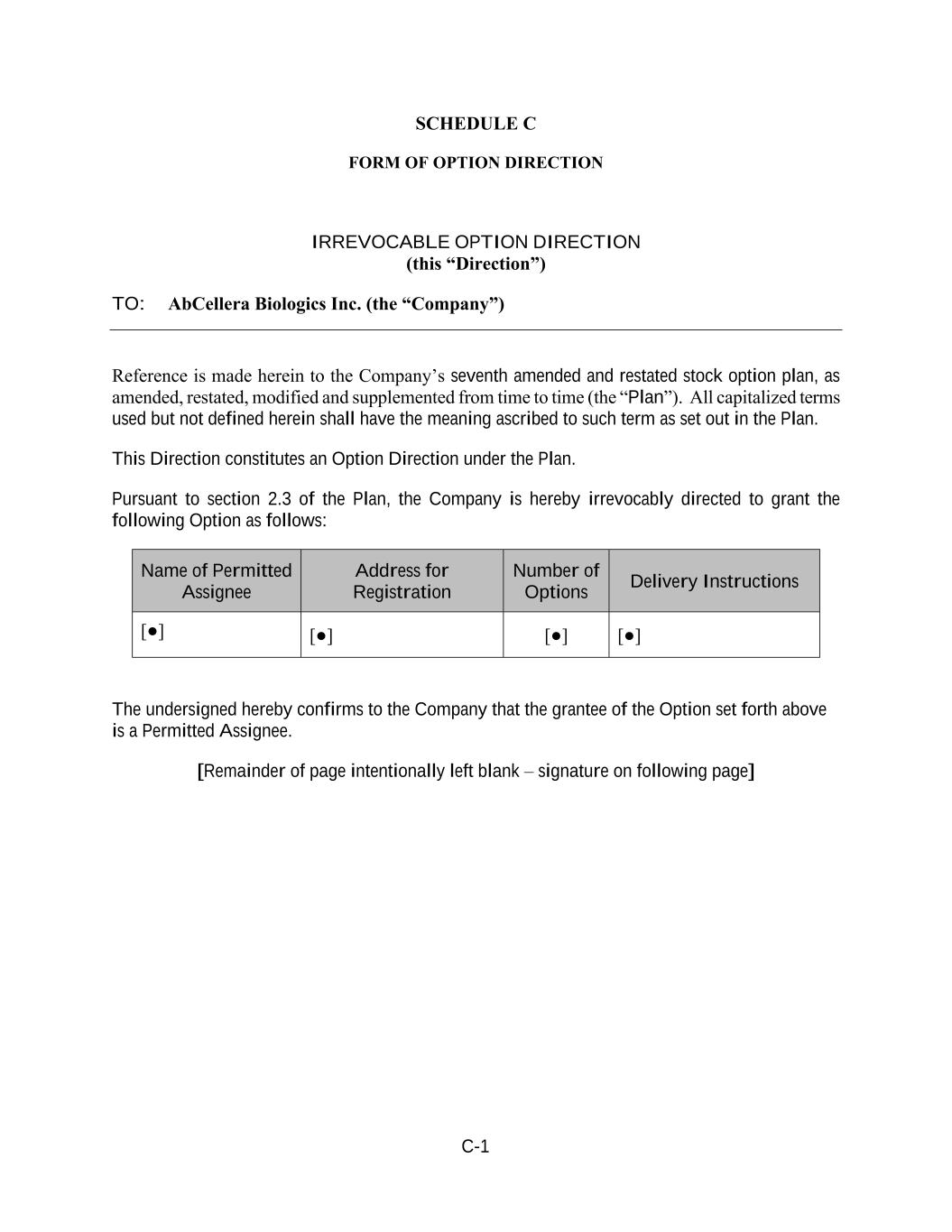 C-1 SCHEDULE C FORM OF OPTION DIRECTION IRREVOCABLE OPTION DIRECTION (this “Direction”) TO: AbCellera Biologics Inc. (the “Company”) Reference is made herein to the Company’s seventh amended and restated stock option plan, as amended, restated, modified and supplemented from time to time (the “Plan”). All capitalized terms used but not defined herein shall have the meaning ascribed to such term as set out in the Plan. This Direction constitutes an Option Direction under the Plan. Pursuant to section 2.3 of the Plan, the Company is hereby irrevocably directed to grant the following Option as follows: Name of Permitted Assignee Address for Registration Number of Options Delivery Instructions [●] [●] [●] [●] The undersigned hereby confirms to the Company that the grantee of the Option set forth above is a Permitted Assignee. [Remainder of page intentionally left blank – signature on following page]