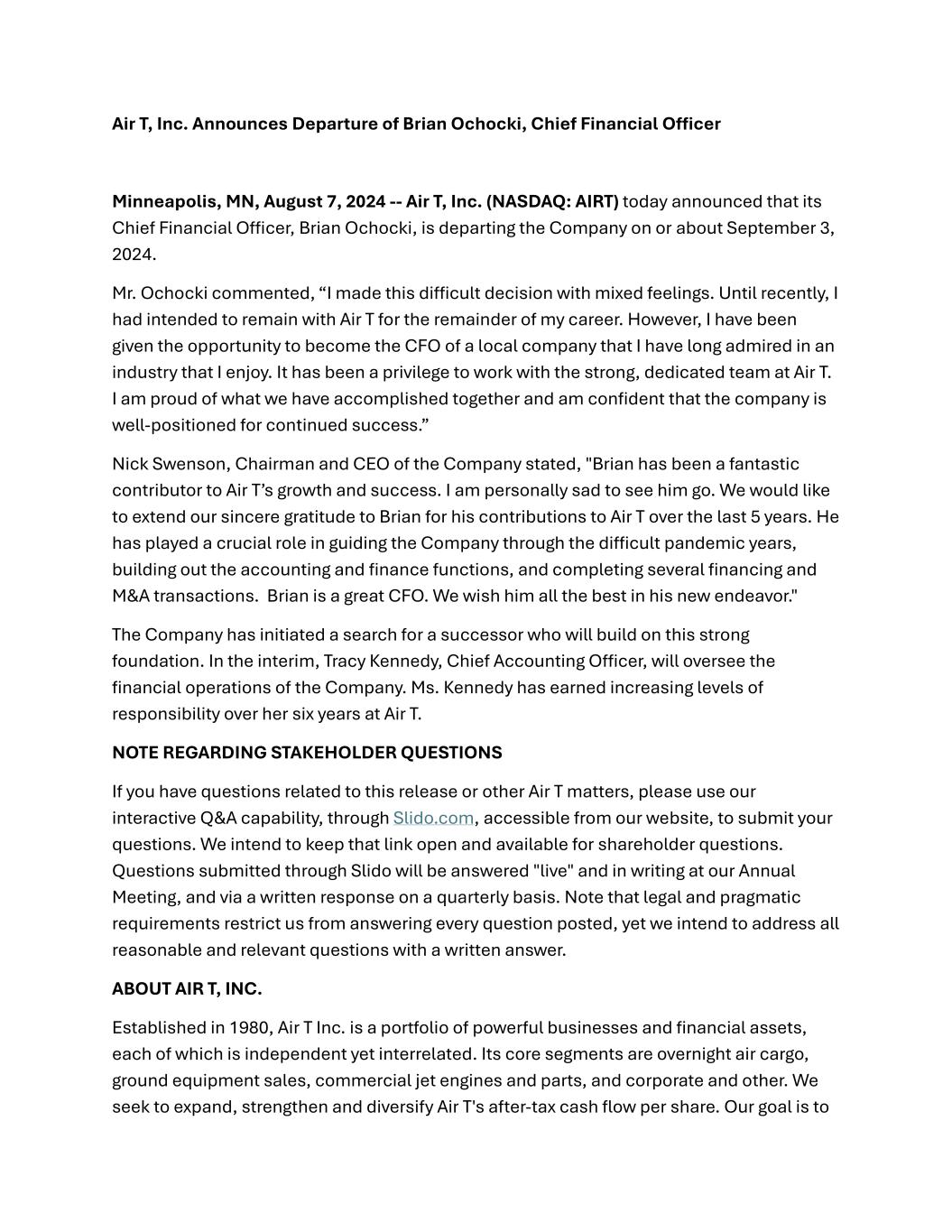 Air T, Inc. Announces Departure of Brian Ochocki, Chief Financial Officer Minneapolis, MN, August 7, 2024 -- Air T, Inc. (NASDAQ: AIRT) today announced that its Chief Financial Officer, Brian Ochocki, is departing the Company on or about September 3, 2024. Mr. Ochocki commented, “I made this difficult decision with mixed feelings. Until recently, I had intended to remain with Air T for the remainder of my career. However, I have been given the opportunity to become the CFO of a local company that I have long admired in an industry that I enjoy. It has been a privilege to work with the strong, dedicated team at Air T. I am proud of what we have accomplished together and am confident that the company is well-positioned for continued success.” Nick Swenson, Chairman and CEO of the Company stated, "Brian has been a fantastic contributor to Air T’s growth and success. I am personally sad to see him go. We would like to extend our sincere gratitude to Brian for his contributions to Air T over the last 5 years. He has played a crucial role in guiding the Company through the difficult pandemic years, building out the accounting and finance functions, and completing several financing and M&A transactions. Brian is a great CFO. We wish him all the best in his new endeavor." The Company has initiated a search for a successor who will build on this strong foundation. In the interim, Tracy Kennedy, Chief Accounting Officer, will oversee the financial operations of the Company. Ms. Kennedy has earned increasing levels of responsibility over her six years at Air T. NOTE REGARDING STAKEHOLDER QUESTIONS If you have questions related to this release or other Air T matters, please use our interactive Q&A capability, through Slido.com, accessible from our website, to submit your questions. We intend to keep that link open and available for shareholder questions. Questions submitted through Slido will be answered "live" and in writing at our Annual Meeting, and via a written response on a quarterly basis. Note that legal and pragmatic requirements restrict us from answering every question posted, yet we intend to address all reasonable and relevant questions with a written answer. ABOUT AIR T, INC. Established in 1980, Air T Inc. is a portfolio of powerful businesses and financial assets, each of which is independent yet interrelated. Its core segments are overnight air cargo, ground equipment sales, commercial jet engines and parts, and corporate and other. We seek to expand, strengthen and diversify Air T's after-tax cash flow per share. Our goal is to