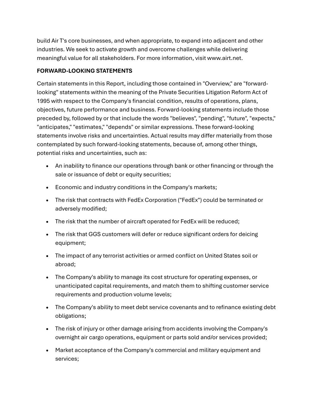 build Air T's core businesses, and when appropriate, to expand into adjacent and other industries. We seek to activate growth and overcome challenges while delivering meaningful value for all stakeholders. For more information, visit www.airt.net. FORWARD-LOOKING STATEMENTS Certain statements in this Report, including those contained in "Overview," are "forward- looking" statements within the meaning of the Private Securities Litigation Reform Act of 1995 with respect to the Company's financial condition, results of operations, plans, objectives, future performance and business. Forward-looking statements include those preceded by, followed by or that include the words "believes", "pending", "future", "expects," "anticipates," "estimates," "depends" or similar expressions. These forward-looking statements involve risks and uncertainties. Actual results may differ materially from those contemplated by such forward-looking statements, because of, among other things, potential risks and uncertainties, such as: • An inability to finance our operations through bank or other financing or through the sale or issuance of debt or equity securities; • Economic and industry conditions in the Company's markets; • The risk that contracts with FedEx Corporation ("FedEx") could be terminated or adversely modified; • The risk that the number of aircraft operated for FedEx will be reduced; • The risk that GGS customers will defer or reduce significant orders for deicing equipment; • The impact of any terrorist activities or armed conflict on United States soil or abroad; • The Company's ability to manage its cost structure for operating expenses, or unanticipated capital requirements, and match them to shifting customer service requirements and production volume levels; • The Company's ability to meet debt service covenants and to refinance existing debt obligations; • The risk of injury or other damage arising from accidents involving the Company's overnight air cargo operations, equipment or parts sold and/or services provided; • Market acceptance of the Company's commercial and military equipment and services;