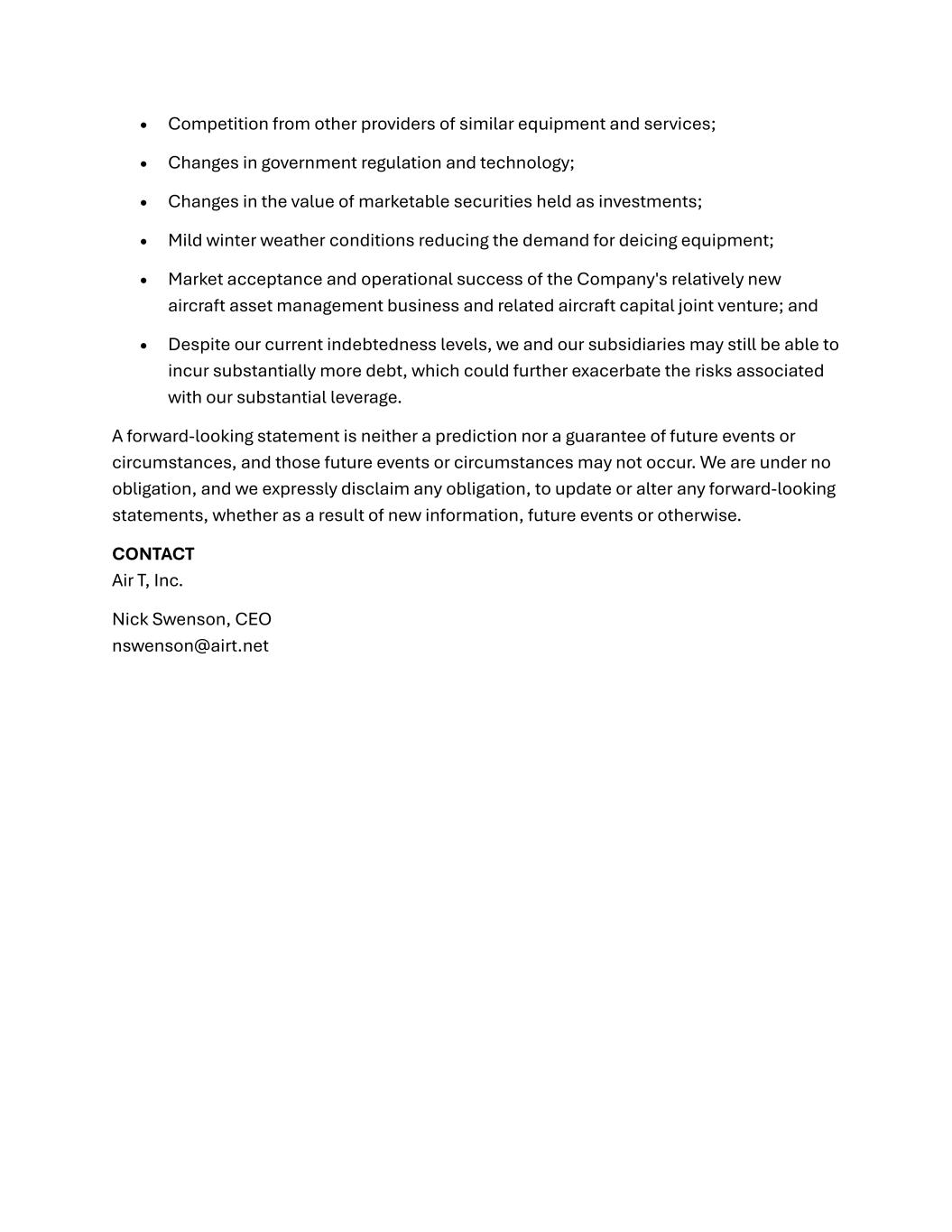 • Competition from other providers of similar equipment and services; • Changes in government regulation and technology; • Changes in the value of marketable securities held as investments; • Mild winter weather conditions reducing the demand for deicing equipment; • Market acceptance and operational success of the Company's relatively new aircraft asset management business and related aircraft capital joint venture; and • Despite our current indebtedness levels, we and our subsidiaries may still be able to incur substantially more debt, which could further exacerbate the risks associated with our substantial leverage. A forward-looking statement is neither a prediction nor a guarantee of future events or circumstances, and those future events or circumstances may not occur. We are under no obligation, and we expressly disclaim any obligation, to update or alter any forward-looking statements, whether as a result of new information, future events or otherwise. CONTACT Air T, Inc. Nick Swenson, CEO nswenson@airt.net