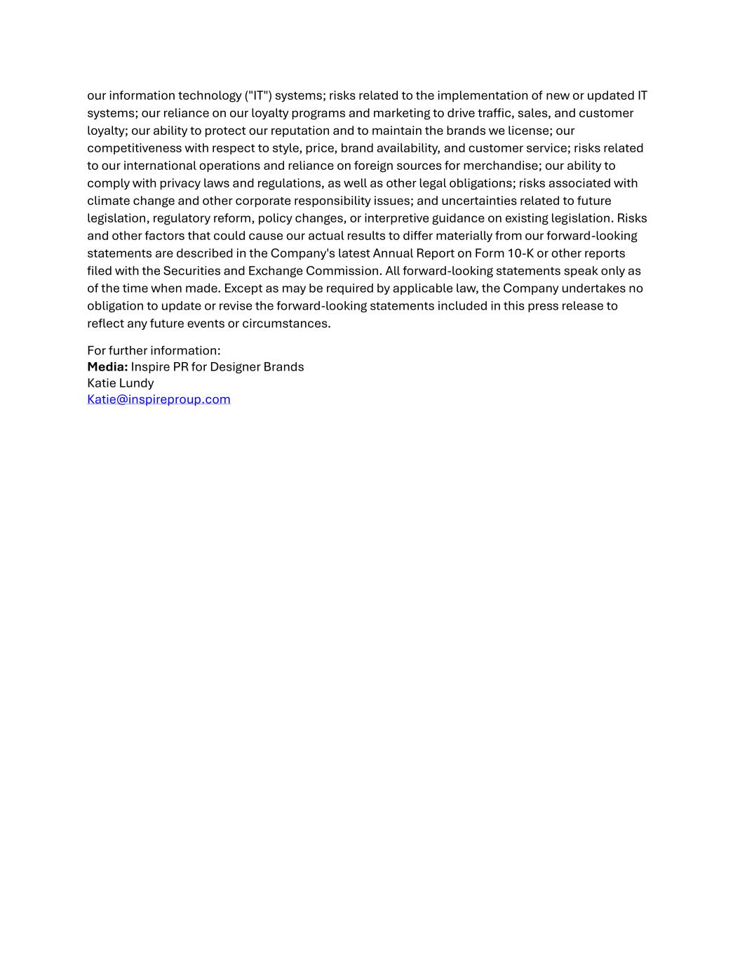 our information technology ("IT") systems; risks related to the implementation of new or updated IT systems; our reliance on our loyalty programs and marketing to drive traffic, sales, and customer loyalty; our ability to protect our reputation and to maintain the brands we license; our competitiveness with respect to style, price, brand availability, and customer service; risks related to our international operations and reliance on foreign sources for merchandise; our ability to comply with privacy laws and regulations, as well as other legal obligations; risks associated with climate change and other corporate responsibility issues; and uncertainties related to future legislation, regulatory reform, policy changes, or interpretive guidance on existing legislation. Risks and other factors that could cause our actual results to differ materially from our forward-looking statements are described in the Company's latest Annual Report on Form 10-K or other reports filed with the Securities and Exchange Commission. All forward-looking statements speak only as of the time when made. Except as may be required by applicable law, the Company undertakes no obligation to update or revise the forward-looking statements included in this press release to reflect any future events or circumstances. For further information: Media: Inspire PR for Designer Brands Katie Lundy Katie@inspireproup.com