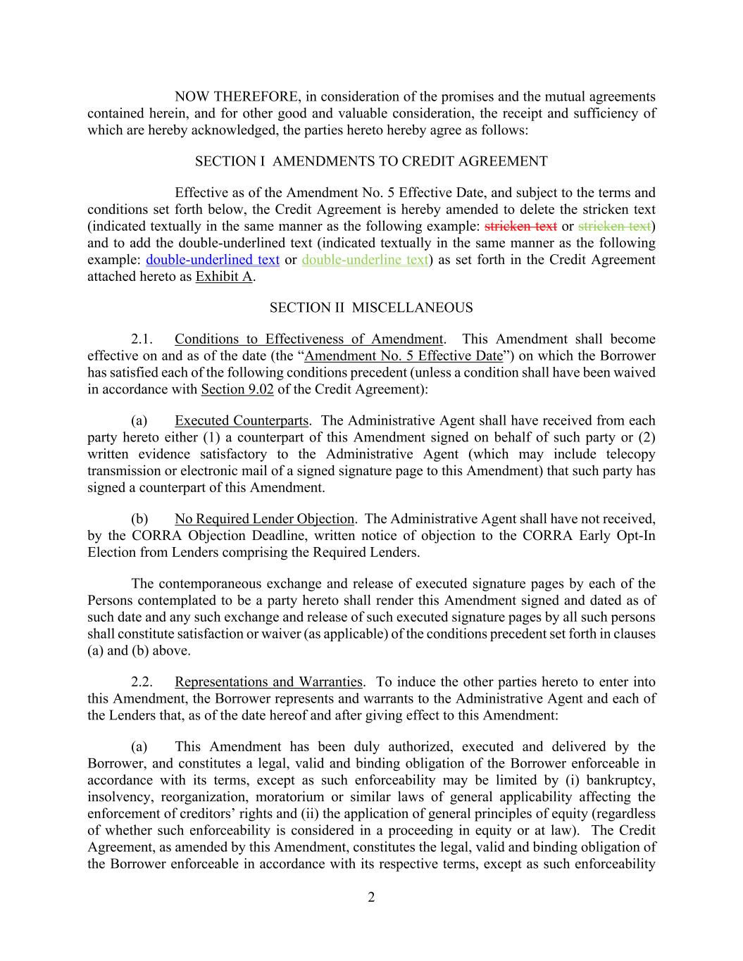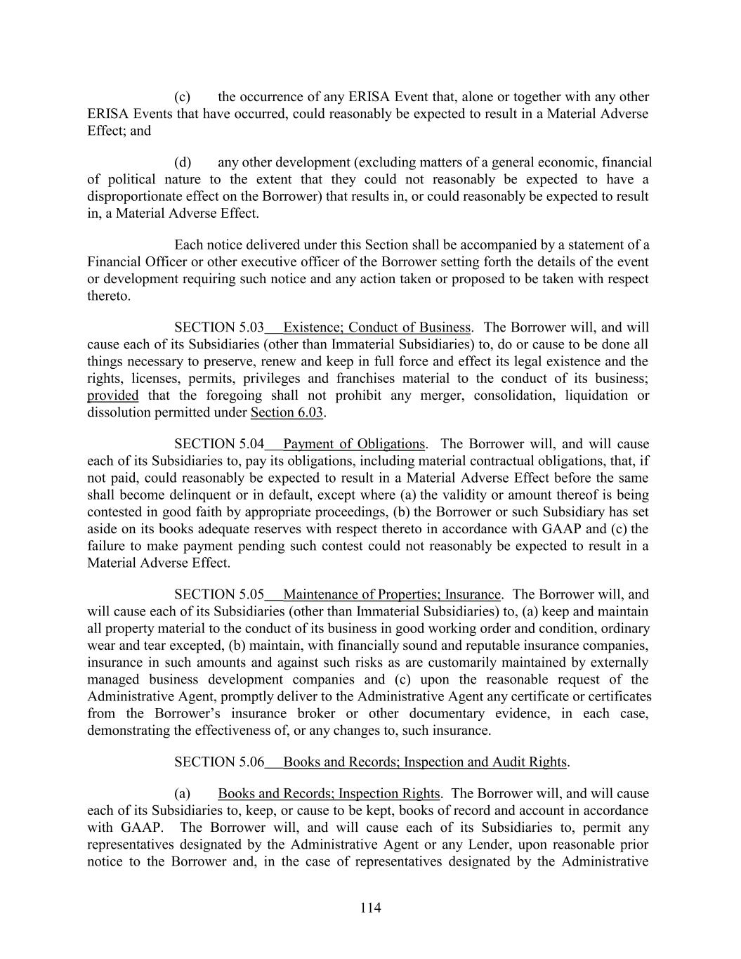 that such materiality qualifier shall not be applicable to any representation or warranty already qualified by materiality or Material Adverse Effect); (d) the Borrower shall fail to observe or perform any covenant, condition or agreement contained in (i) Section 5.01(e), Section 5.03 (with respect to the Borrower’s and its Subsidiaries’ existence only, and not with respect to the Borrower’s and its Subsidiaries’ rights, licenses, permits, privileges or franchises), Sections 5.08(a) or (b), Section 5.09, Section 5.10, Section 5.12(c), Section 5.15 or Article VI or any Obligor shall default in the performance of any of its obligations contained in Section 7 of the Guarantee and Security Agreement or (ii) Section 5.01(f) or Section 5.02 and, in the case of this clause (ii), such failure shall continue unremedied for a period of five (5) or more days after the earlier of (A) notice thereof by the Administrative Agent (given at the request of any Lender) to the Borrower and (B) a Financial Officer of the Borrower’s actual knowledge of such failure; (e) the Borrower or any Obligor, as applicable, shall fail to observe or perform any covenant, condition or agreement contained in this Agreement (other than those specified in clause (a), (b) or (d) of this Article) or any other Loan Document and such failure shall continue unremedied for a period of thirty (30) or more days after the earlier of (A) notice thereof by the Administrative Agent (given at the request of any Lender) to the Borrower and (B) a Financial Officer of the Borrower’s actual knowledge of such failure; (f) the Borrower or any of its Subsidiaries shall fail to make any payment (whether of principal or interest and regardless of amount) in respect of any Material Indebtedness, when and as the same shall become due and payable, taking into account any applicable grace period; (g) any event or condition occurs that (i) results in all or any portion of any Material Indebtedness becoming due prior to its scheduled maturity or (ii) enables or permits (after giving effect to any applicable grace periods) the holder or holders of any Material Indebtedness or any trustee or agent on its or their behalf to cause any Material Indebtedness to become due, or to require the prepayment, repurchase, redemption or defeasance thereof, prior to its scheduled maturity, unless, in the case of this clause (ii), such event or condition is no longer continuing or has been waived in accordance with the terms of such Material Indebtedness such that the holder or holders thereof or any trustee or agent on its or their behalf are no longer enabled or permitted to cause such Material Indebtedness to become due, or to require the prepayment, repurchase, redemption or defeasance thereof, prior to its scheduled maturity; provided that this clause (g) shall not apply to (1) secured Indebtedness that becomes due as a result of the voluntary sale or transfer of the property or assets securing such Indebtedness; or (2) convertible debt that becomes due as a result of a contingent mandatory conversion or redemption event provided such conversion or redemption is effectuated only in capital stock that is not Disqualified Equity Interests (other than interest or expenses or fractional shares, which may be payable in cash); (h) an involuntary proceeding shall be commenced or an involuntary petition shall be filed seeking (i) liquidation, reorganization or other relief in respect of the Borrower or any of its Subsidiaries (other than Immaterial Subsidiaries) or its debts, or of a substantial part of 147