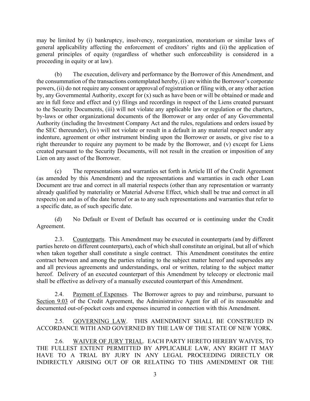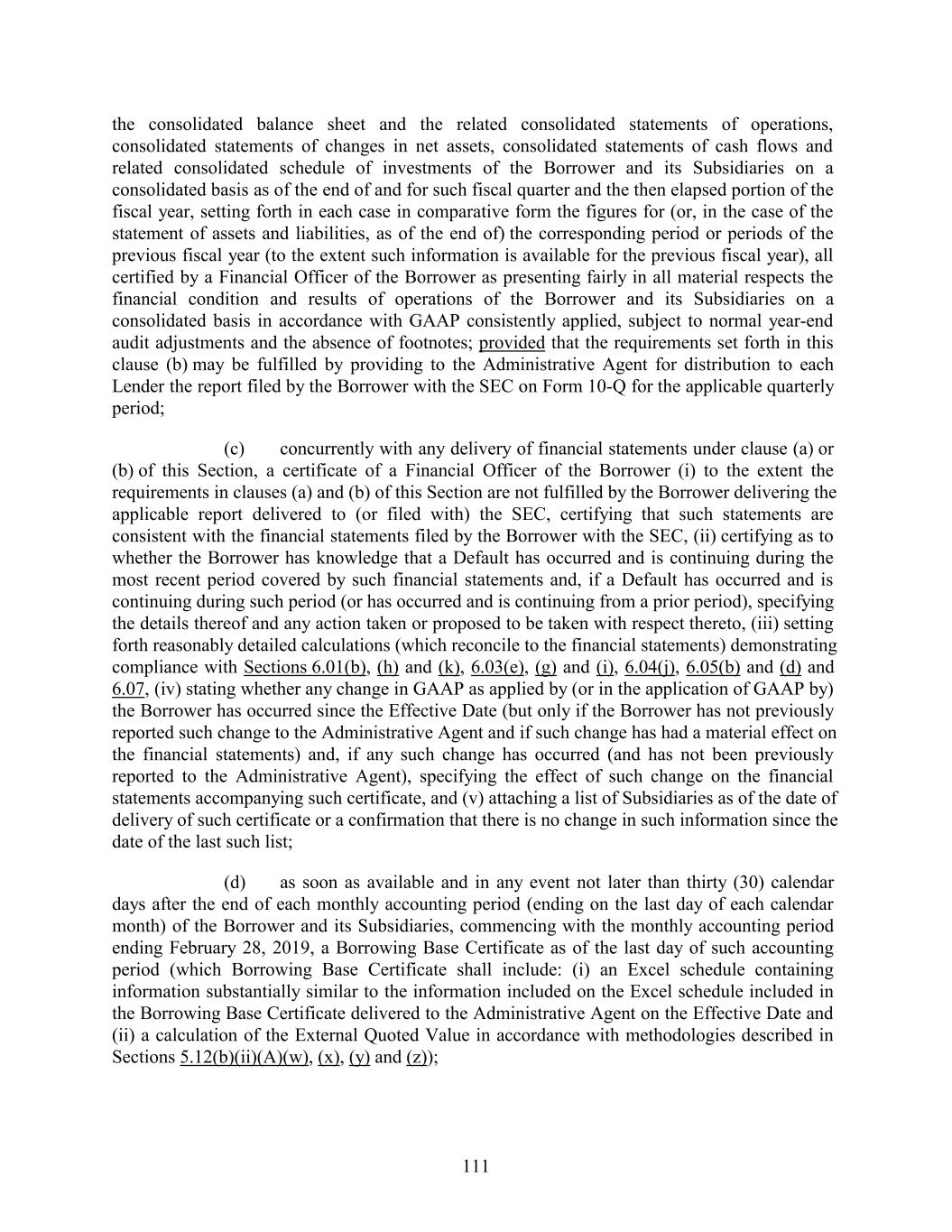 (ii) any indenture, agreement, instrument or other arrangement pertaining to other Indebtedness of the Borrower or its Subsidiaries permitted hereby to the extent any such indenture, agreement, instrument or other arrangement does not prohibit, in each case in any material respect, or impose materially adverse conditions upon, the material requirements applicable to the Borrower and its Subsidiaries under the Loan Documents or (iii) any agreement, instrument or other arrangement pertaining to any lease, sale or other disposition of any asset permitted by this Agreement so long as the applicable restrictions (x) only apply to such assets and (y) do not restrict prior to the consummation of such sale or disposition the creation or existence of the Liens in favor of the Collateral Agent pursuant to the Security Documents or otherwise required by this Agreement, or the incurrence or payment of Indebtedness under this Agreement or the ability of the Borrower and its Subsidiaries to perform any other obligation under any of the Loan Documents) that prohibits, in each case in any material respect, or imposes materially adverse conditions upon, the incurrence or payment of Indebtedness for borrowed money of the Borrower, the granting of Liens by the Borrower, the declaration or payment of dividends by the Borrower, the making of Loans or the making of Investments or the sale, assignment, transfer or other disposition of property, in each case of the Borrower. SECTION 6.07 Certain Financial Covenants. (a) Minimum Stockholders’ Equity. After the Effective Date, the Borrower will not permit Stockholders’ Equity as of the last day of any fiscal quarter of the Borrower to be less than (x) with respect to each fiscal quarter ending on or prior to March 31, 2023, the sum of (i) $394,077,101 plus (ii) 50% of the aggregate net proceeds of all sales of Equity Interests by the Borrower after the Effective Date and (y) with respect to each fiscal quarter ending on or after June 30, 2023, the sum of (i) $900,000,000 plus (ii) 50% of the aggregate net proceeds of all sales of Equity Interests by the Borrower after the Amendment No. 4 Effective Date. (b) Consolidated Asset Coverage Ratio. After the Effective Date, the Borrower will not permit the Consolidated Asset Coverage Ratio to be less than (x) 150% at any time that Portfolio Investments that are Tier One Investments listed on the Investment Schedule represent more than 70% of the total “fair value” of all Investments set forth on such Investment Schedule, (y) 167% at any time that the Portfolio Investments that are Tier One Investments listed on the Investment Schedule represent more than 60% but less than or equal to 70% of the total “fair value” of all Investments set on such Investment Schedule and (z) 200% at any other time (in each case after giving effect to any Exemptive Order granted by the SEC relating to the exclusion of any indebtedness of any SBIC subsidiary from the definition of Senior Securities). For purposes of this clause (b), “Tier One Investments” means Portfolio Investments that are Cash, Cash Equivalents, Long-Term U.S. Government Securities and First Lien Bank Loans and “Investment Schedule” means the consolidated schedule of investments set forth in the financial statements of the Borrower most recently delivered pursuant to Section 5.01(a) or (b) or, following the Effective Date but prior to the first such delivery, the consolidated schedule of investments set forth in the draft financial statements of the Borrower attached to the draft report to be filed by the Borrower with the SEC on Form 10-K for the fiscal year ending December 31, 2018 delivered to the Administrative Agent prior to the Effective Date. 143