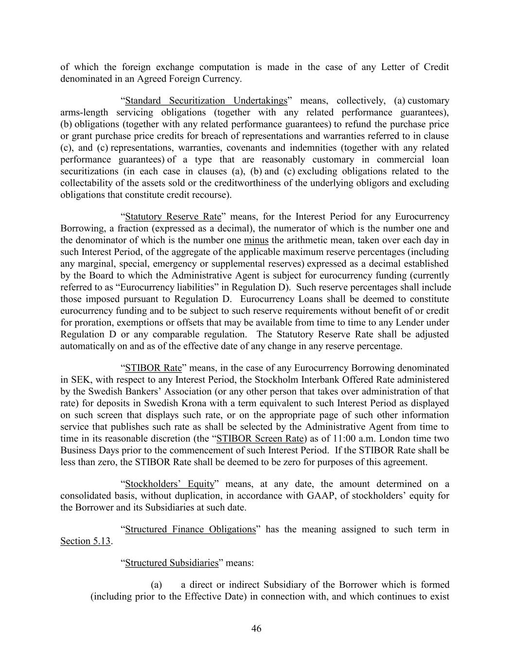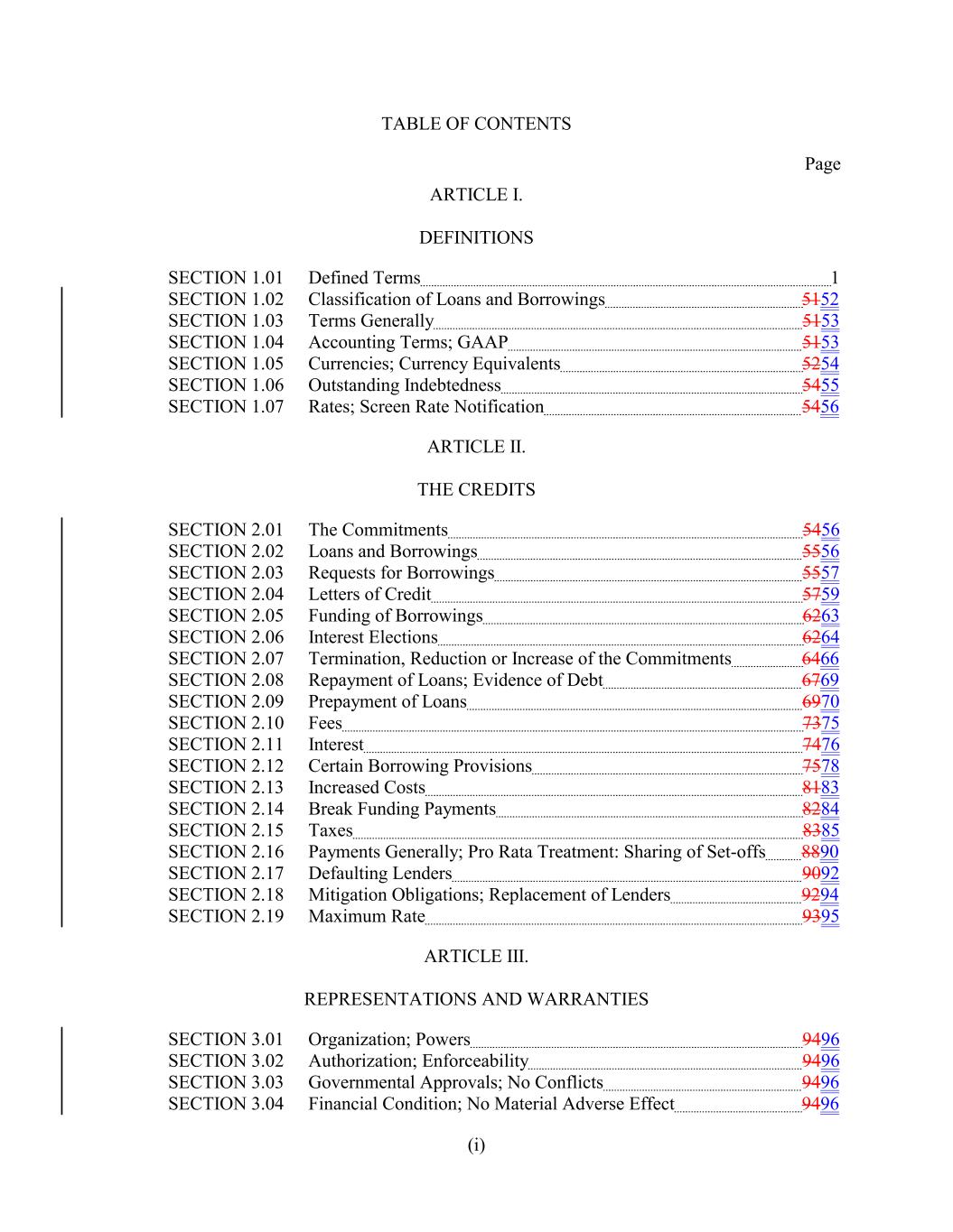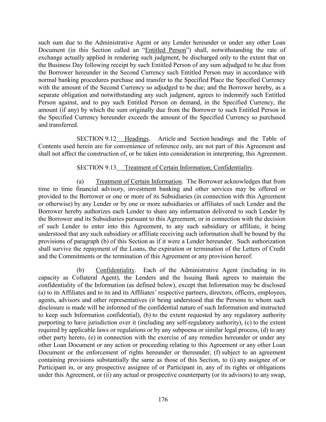 such sum due to the Administrative Agent or any Lender hereunder or under any other Loan Document (in this Section called an “Entitled Person”) shall, notwithstanding the rate of exchange actually applied in rendering such judgment, be discharged only to the extent that on the Business Day following receipt by such Entitled Person of any sum adjudged to be due from the Borrower hereunder in the Second Currency such Entitled Person may in accordance with normal banking procedures purchase and transfer to the Specified Place the Specified Currency with the amount of the Second Currency so adjudged to be due; and the Borrower hereby, as a separate obligation and notwithstanding any such judgment, agrees to indemnify such Entitled Person against, and to pay such Entitled Person on demand, in the Specified Currency, the amount (if any) by which the sum originally due from the Borrower to such Entitled Person in the Specified Currency hereunder exceeds the amount of the Specified Currency so purchased and transferred. SECTION 9.12 Headings. Article and Section headings and the Table of Contents used herein are for convenience of reference only, are not part of this Agreement and shall not affect the construction of, or be taken into consideration in interpreting, this Agreement. SECTION 9.13 Treatment of Certain Information; Confidentiality. (a) Treatment of Certain Information. The Borrower acknowledges that from time to time financial advisory, investment banking and other services may be offered or provided to the Borrower or one or more of its Subsidiaries (in connection with this Agreement or otherwise) by any Lender or by one or more subsidiaries or affiliates of such Lender and the Borrower hereby authorizes each Lender to share any information delivered to such Lender by the Borrower and its Subsidiaries pursuant to this Agreement, or in connection with the decision of such Lender to enter into this Agreement, to any such subsidiary or affiliate, it being understood that any such subsidiary or affiliate receiving such information shall be bound by the provisions of paragraph (b) of this Section as if it were a Lender hereunder. Such authorization shall survive the repayment of the Loans, the expiration or termination of the Letters of Credit and the Commitments or the termination of this Agreement or any provision hereof. (b) Confidentiality. Each of the Administrative Agent (including in its capacity as Collateral Agent), the Lenders and the Issuing Bank agrees to maintain the confidentiality of the Information (as defined below), except that Information may be disclosed (a) to its Affiliates and to its and its Affiliates’ respective partners, directors, officers, employees, agents, advisors and other representatives (it being understood that the Persons to whom such disclosure is made will be informed of the confidential nature of such Information and instructed to keep such Information confidential), (b) to the extent requested by any regulatory authority purporting to have jurisdiction over it (including any self-regulatory authority), (c) to the extent required by applicable laws or regulations or by any subpoena or similar legal process, (d) to any other party hereto, (e) in connection with the exercise of any remedies hereunder or under any other Loan Document or any action or proceeding relating to this Agreement or any other Loan Document or the enforcement of rights hereunder or thereunder, (f) subject to an agreement containing provisions substantially the same as those of this Section, to (i) any assignee of or Participant in, or any prospective assignee of or Participant in, any of its rights or obligations under this Agreement, or (ii) any actual or prospective counterparty (or its advisors) to any swap, 176
