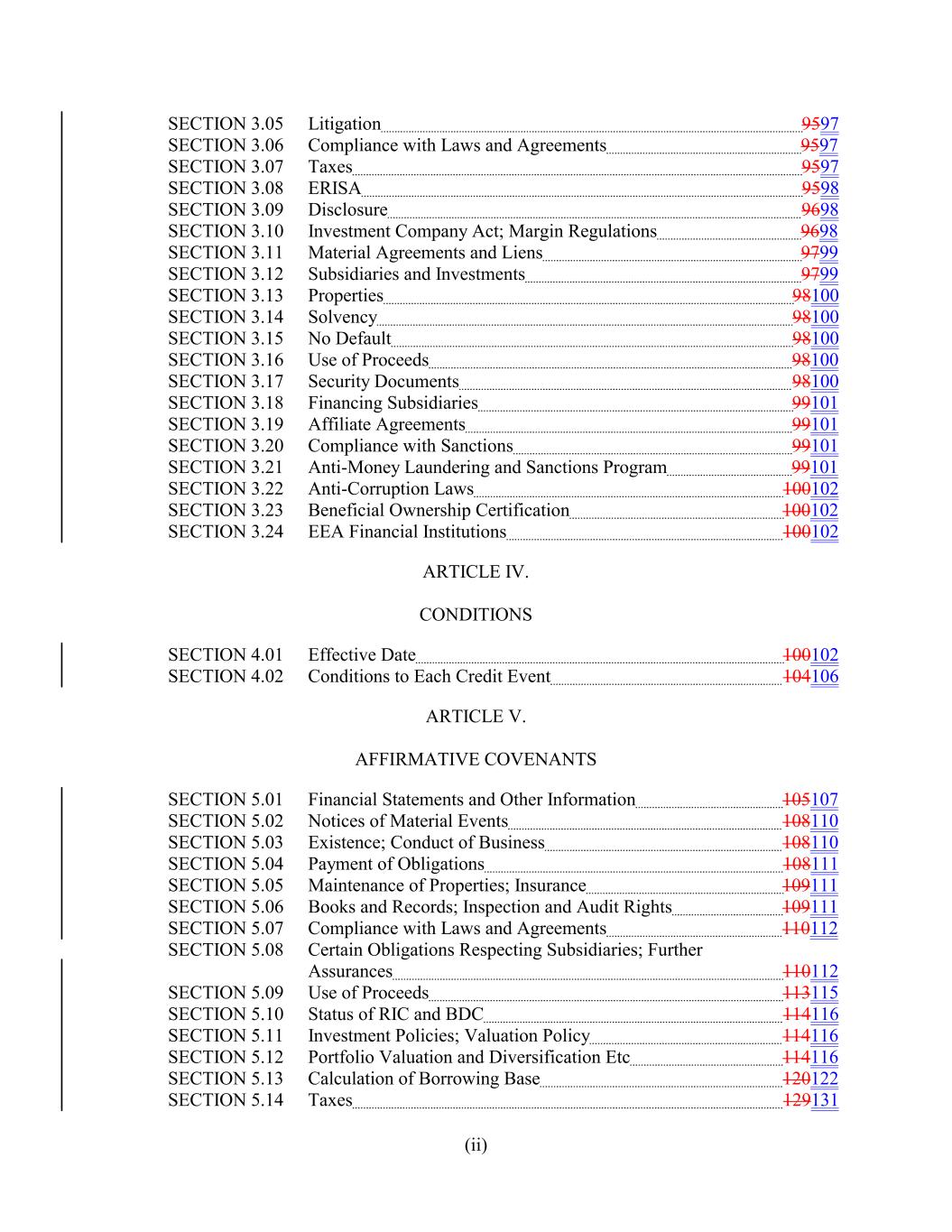 SECTION 6.01 Indebtedness. The Borrower will not nor will it permit any of its Subsidiaries to, create, incur, assume or permit to exist any Indebtedness, except: (a) Indebtedness created under this Agreement; (b) (i) Unsecured Shorter-Term Indebtedness in an aggregate principal amount not to exceed $25,000,000 at any time outstanding, plus, without duplication, from and after the date that is nine months prior to the maturity of any applicable Specified Notes, the outstanding principal amount of such Specified Notes (which, for the avoidance of doubt shall not be in excess of the amounts set forth in the applicable definitions thereof) and (ii) Secured Longer-Term Indebtedness, so long as, in the case of each clause (i) and (ii), (w) no Default or Event of Default exists at the time of the incurrence, refinancing or replacement thereof (or immediately after the incurrence, refinancing or replacement thereof), (x) prior to and immediately after giving effect to the incurrence, refinancing or replacement thereof, the Borrower is in pro forma compliance with each of the covenants set forth in Section 6.07, and on the date of such incurrence, refinancing or replacement the Borrower delivers to the Administrative Agent a certificate of a Financial Officer to such effect, (y) prior to and immediately after giving effect to the incurrence, refinancing or replacement thereof, the Covered Debt Amount does not or would not exceed the Borrowing Base then in effect and (z) on the date of the incurrence, refinancing or replacement thereof, the Borrower delivers to the Administrative Agent and each Lender a Borrowing Base Certificate as at such date demonstrating compliance with subclause (y) after giving effect to such incurrence, refinancing or replacement. For purposes of preparing such Borrowing Base Certificate, (A) the Value of any Quoted Investment shall be the most recent quotation available for such Eligible Portfolio Investment and (B) the Value of any Unquoted Investment shall be the Value set forth in the Borrowing Base Certificate most recently delivered by the Borrower to the Administrative Agent pursuant to Section 5.01(d) or (e) or if an Unquoted Investment is acquired after the delivery of the Borrowing Base Certificate most recently delivered, the Value of such Unquoted Investment shall be equal to the lowest of (i) the Internal Value of such Unquoted Investment as determined by the Borrower pursuant to Section 5.12(b)(ii)(C), (ii) the cost of such Unquoted Investment; and (iii) if such Unquoted Investment is a debt investment, the par or face value of such Unquoted Investment; provided, that the Borrower shall reduce or increase, as applicable, the Value of any Eligible Portfolio Investment referred to in this subclause (B), in a manner consistent with the valuation methodology set forth in Section 5.12, to the extent necessary to take into account any events of which the Borrower has knowledge that adversely or positively, as applicable, affect the value of any Eligible Portfolio Investment; (c) Unsecured Longer-Term Indebtedness, so long as (x) no Default or Event of Default exists at the time of the incurrence, refinancing or replacement thereof (or immediately after the incurrence, refinancing or replacement thereof) and (y) prior to and immediately after giving effect to the incurrence, refinancing or replacement thereof, the Borrower is in pro forma compliance with each of the covenants set forth in Section 6.07 and on the date of such incurrence, refinancing or replacement (or such later date as the Administrative Agent may agree in its sole discretion) the Borrower delivers to the Administrative Agent a certificate of a Financial Officer to such effect; 136