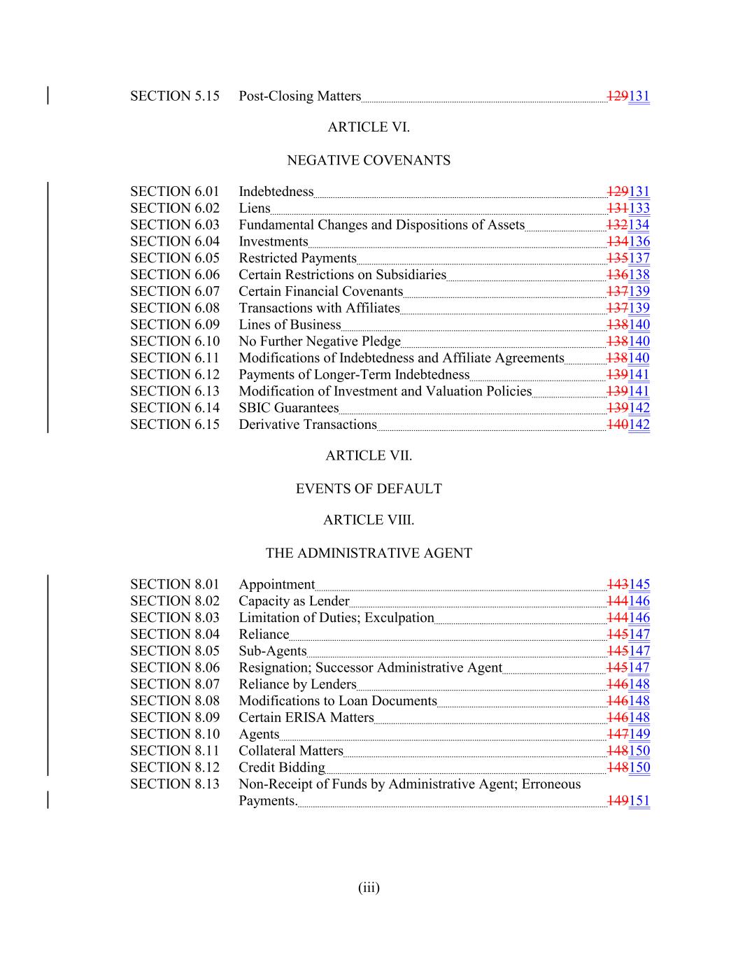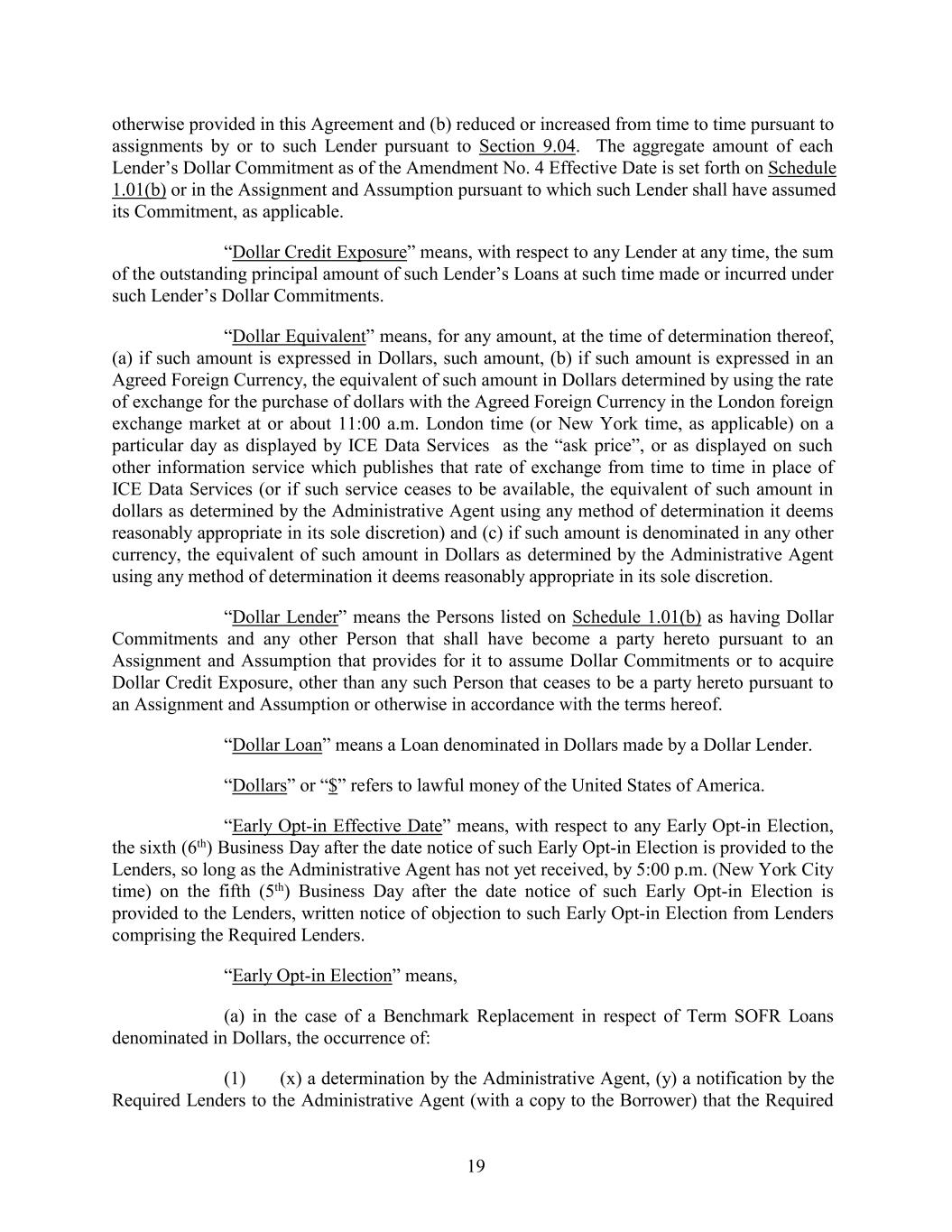 shall apply to their respective activities in connection with the syndication of the credit facilities provided for herein as well as activities as Administrative Agent. SECTION 8.06 Resignation; Successor Administrative Agent. The Administrative Agent may resign at any time by notifying the Lenders, the Issuing Bank and the Borrower. Upon any such resignation, the Required Lenders shall have the right, with the consent of the Borrower not to be unreasonably withheld (provided that no such consent shall be required if an Event of Default has occurred and is continuing), to appoint a successor, which is not a Disqualified Lender. If no successor shall have been so appointed by the Required Lenders and shall have accepted such appointment within 30 days after the retiring Administrative Agent gives notice of its resignation, then the retiring Administrative Agent’s resignation shall nonetheless become effective except that in the case of any collateral security held by the Administrative Agent on behalf of the Lenders or the Issuing Bank under any of the Loan Documents, the retiring or removed Administrative Agent shall continue to hold such collateral security until such time as a successor Administrative Agent is appointed and (1) the retiring Administrative Agent shall be discharged from its duties and obligations hereunder and (2) the Required Lenders shall perform the duties of the Administrative Agent (and all payments and communications provided to be made by, to or through the Administrative Agent shall instead be made by or to each Lender directly) until such time as the Required Lenders appoint a successor agent as provided for above in this paragraph. Upon the acceptance of its appointment as Administrative Agent hereunder by a successor, such successor shall succeed to and become vested with all the rights, powers, privileges and duties of the retiring (or retired) Administrative Agent and the retiring Administrative Agent shall be discharged from its duties and obligations hereunder (if not already discharged therefrom as provided above in this paragraph). The fees payable by the Borrower to a successor Administrative Agent shall be the same as those payable to its predecessor unless otherwise agreed between the Borrower and such successor. After the Administrative Agent’s resignation hereunder, the provisions of this Article VIII and Section 9.03 shall continue in effect for its benefit in respect of any actions taken or omitted to be taken by it while it was acting as Administrative Agent. SECTION 8.07 Reliance by Lenders. Each Lender acknowledges that it has, independently and without reliance upon the Administrative Agent or any other Lender and based on such documents and information as it has deemed appropriate, made its own credit analysis and decision to enter into this Agreement. Each Lender also acknowledges that it will, independently and without reliance upon the Administrative Agent or any other Lender and based on such documents and information as it shall from time to time deem appropriate, continue to make its own decisions in taking or not taking action under or based upon this Agreement, any other Loan Document or any related agreement or any document furnished hereunder or thereunder. SECTION 8.08 Modifications to Loan Documents. Except as otherwise provided in Section 9.02(b) or 9.02(c) with respect to this Agreement, the Administrative Agent may, with the prior consent of the Required Lenders (but not otherwise), consent to any modification, supplement or waiver under any of the Loan Documents; provided that, without the prior consent of each Lender, the Administrative Agent shall not (except as provided herein or in the Security Documents) release all or substantially all of the Collateral or otherwise 152