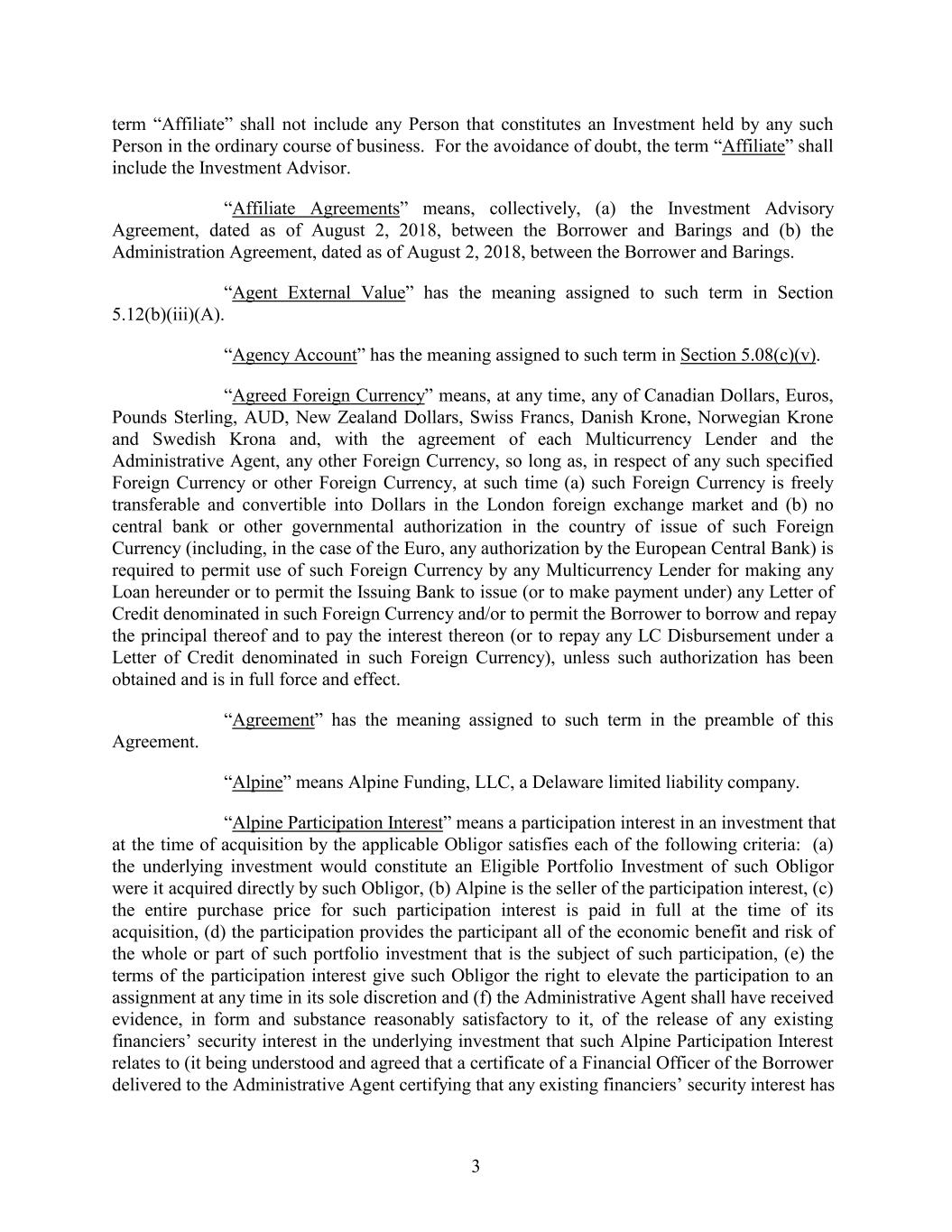 provided that (x) any participation interest that does not satisfy the definition of Alpine Participation Interest shall be zero and (y) the Value of any Alpine Participation Interest from and after the date that is 90 days after Amendment No. 3 Effective Date (or such longer period of time as agreed to by the Administrative Agent) shall be zero, in each case for purposes of this Agreement. SECTION 5.13 Calculation of Borrowing Base. For purposes of this Agreement, the “Borrowing Base” shall be determined, as at any date of determination, as the sum of the products obtained by multiplying (x) the Value of each Eligible Portfolio Investment (excluding any cash held by the Administrative Agent pursuant to Section 2.04(k)) by (y) the applicable Advance Rate; provided that: (a) the Advance Rate applicable to the aggregate Value of all Eligible Portfolio Investments in their entirety shall be 0% at any time when the Borrowing Base is composed entirely of Eligible Portfolio Investments issued by fewer than 20 different issuers; (b) the Advance Rate applicable to that portion of the aggregate Value of the Eligible Portfolio Investments issued by all issuers in a consolidated group of corporations or other entities in accordance with GAAP exceeding (i) 5% of the aggregate Value of all Eligible Portfolio Investments included in the Borrowing Base (for the avoidance of doubt, the calculation of fair value for purposes of this subclause shall be made without taking into account any Advance Rate) (the “Total Eligible Portfolio”), shall be 50% of the otherwise applicable Advance Rate and (ii) the Advance Rate applicable to that portion of the aggregate fair value of Eligible Portfolio Investments of all issuers in a consolidated group of corporations or other entities in accordance with GAAP exceeding 7.5% of the Total Eligible Portfolio shall be 0%; (c) the Advance Rate applicable to that portion of the Total Eligible Portfolio issued by Portfolio Companies in the same Industry Classification Group that exceeds (x) 20% of the Total Eligible Portfolio for each of the Two Largest Industry Classification Groups, and (y) 15% of the Total Eligible Portfolio for any other industry sector, shall be 0%; (d) the Advance Rate applicable to that portion of the aggregate Value of Portfolio Investments that are not Cash, Cash Equivalents, Long-Term U.S. Government Securities or Performing First Lien Bank Loans that exceeds 30% of the Total Eligible Portfolio shall be 0%; (e) the Advance Rate applicable to that portion of the aggregate Value of Portfolio Investments that are Performing Mezzanine Investments, Performing High Yield Securities, Performing PIK Obligations and Performing DIP Loans that exceeds 20% of the Total Eligible Portfolio shall be 0%; (f) the Advance Rate applicable to that portion of the aggregate Value of Portfolio Investments that are Performing PIK Obligations that exceeds 5% of the Total Eligible Portfolio shall be 0%; 126