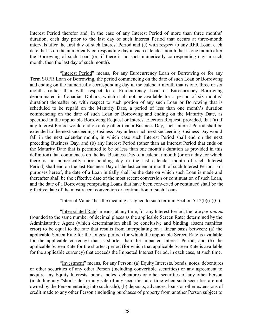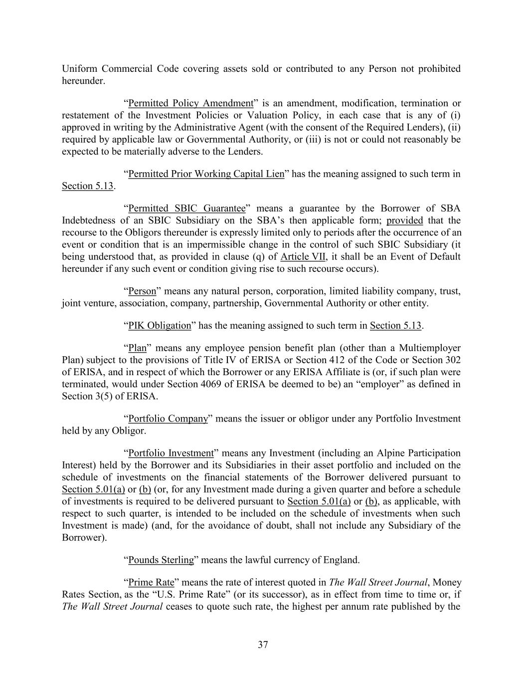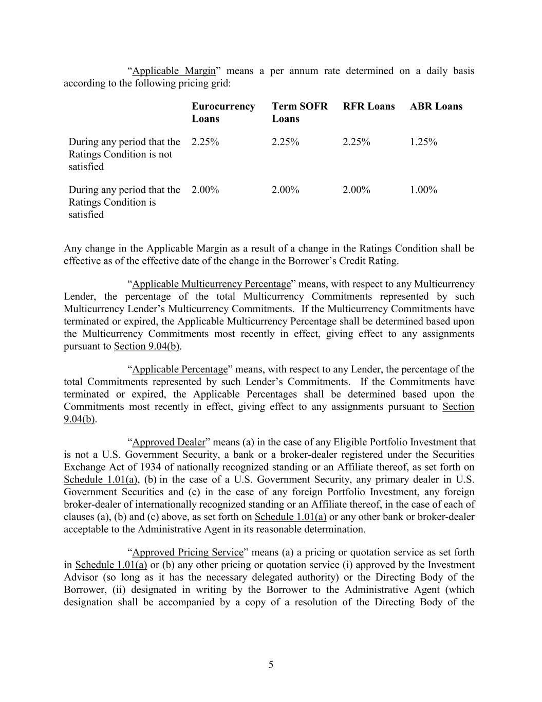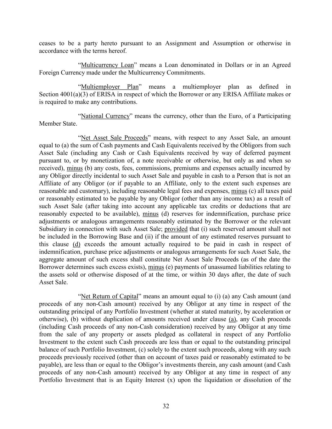 guarantors of such working capital facility; provided that (i) such Bank Loan has a second priority lien on such accounts receivable and/or inventory, as applicable (and all related property and all proceeds thereof), (ii) such working capital facility is not secured by any other assets (other than a second priority lien, subject to the first priority lien of the Bank Loan) and does not benefit from any standstill rights or other agreements (other than customary rights) with respect to any other assets and (iii) the maximum principal amount of such working capital facility is not at any time greater than 15% of the aggregate enterprise value of the Portfolio Company (as determined pursuant to the enterprise value as determined at closing of the transaction, and thereafter an enterprise value for the applicable Portfolio Company determined in a manner consistent with the valuation methodology applied in the valuation for such Portfolio Company as determined by the Investment Advisor (so long as it has the necessary delegated authority) or the Directing Body of the Borrower in a commercially reasonable manner including the use of an Approved Third-Party Appraiser in the case of Unquoted Investments). “PIK Obligation” means an obligation that provides that any portion of the interest accrued for a specified period of time or until the maturity thereof is, or at the option of the obligor may be, added to the principal balance of such obligation or otherwise deferred and accrued rather than being paid in cash, provided that any such obligation shall not constitute a PIK Obligation if it (i) is a fixed rate obligation and requires payment of interest in cash on an at least semi-annual basis at a rate of not less than 8% per annum or (ii) is not a fixed rate obligation and requires payment of interest in cash on an at least semi-annual basis at a rate of not less than 4.5% per annum in excess of the applicable index. “Restructured Investment” means, as of any date of determination, (a) any Portfolio Investment that has been a Defaulted Obligation within the past six months, (b) any Portfolio Investment that has in the past six months been on cash non-accrual, or (c) any Portfolio Investment that has in the past six months been amended or subject to a deferral or waiver if both (i) the effect of such amendment, deferral or waiver is either, among other things, to (1) change the amount of previously required scheduled debt amortization (other than by reason of repayment thereof) or (2) extend the tenor of previously required scheduled debt amortization, in each case such that the remaining weighted average life of such Portfolio Investment is extended by more than 20% and (ii) the reason for such amendment, deferral or waiver is related to the deterioration of the credit profile of the underlying borrower such that, in the absence of such amendment, deferral or waiver, it is reasonably expected by the Borrower that such underlying borrower either (x) will not be able to make any such previously required scheduled debt amortization payment or (y) is anticipated to incur a breach of a material financial covenant. A DIP Loan shall not be deemed to be a Restructured Investment, so long as it does not meet the conditions of the definition of Restructured Investment. An “exit” financing for an obligor that emerges from a case under Chapter 11 of the Bankruptcy Code in accordance with a Chapter 11 plan that has been duly confirmed by the federal bankruptcy court exercising jurisdiction over the obligor pursuant to a final non-appealable order and such “exit” financing has been duly approved by a final non-appealable order of the federal bankruptcy court exercising jurisdiction over the obligor in connection with the confirmed Chapter 11 plan of the obligor shall not be deemed to be a Restructured Investment, so long as such “exit” financing is a 133