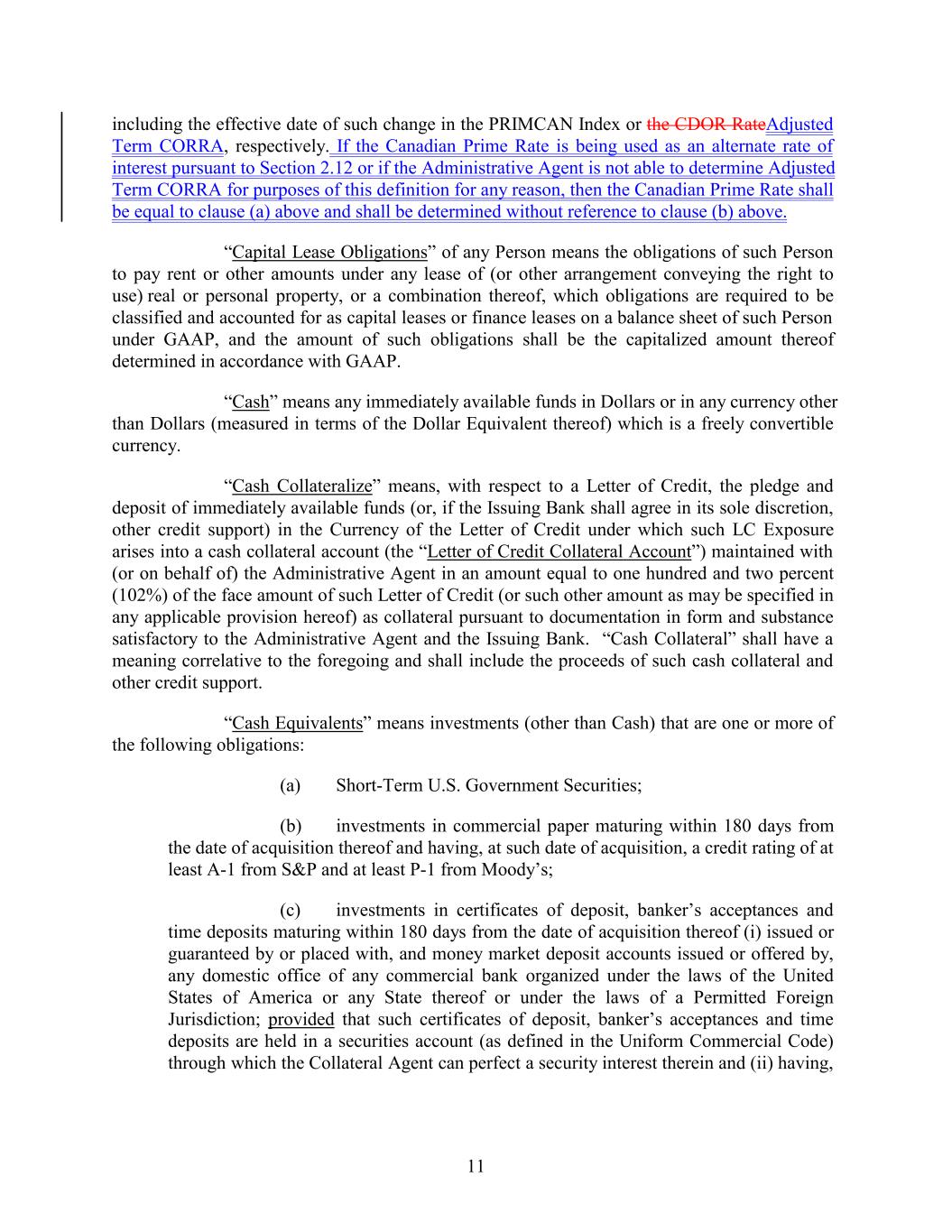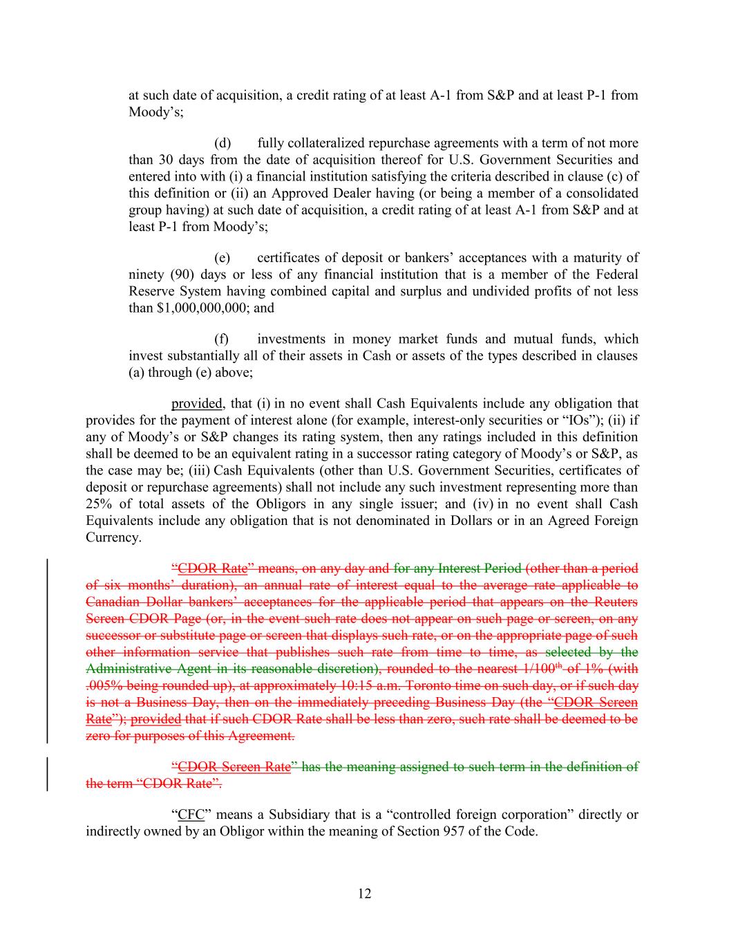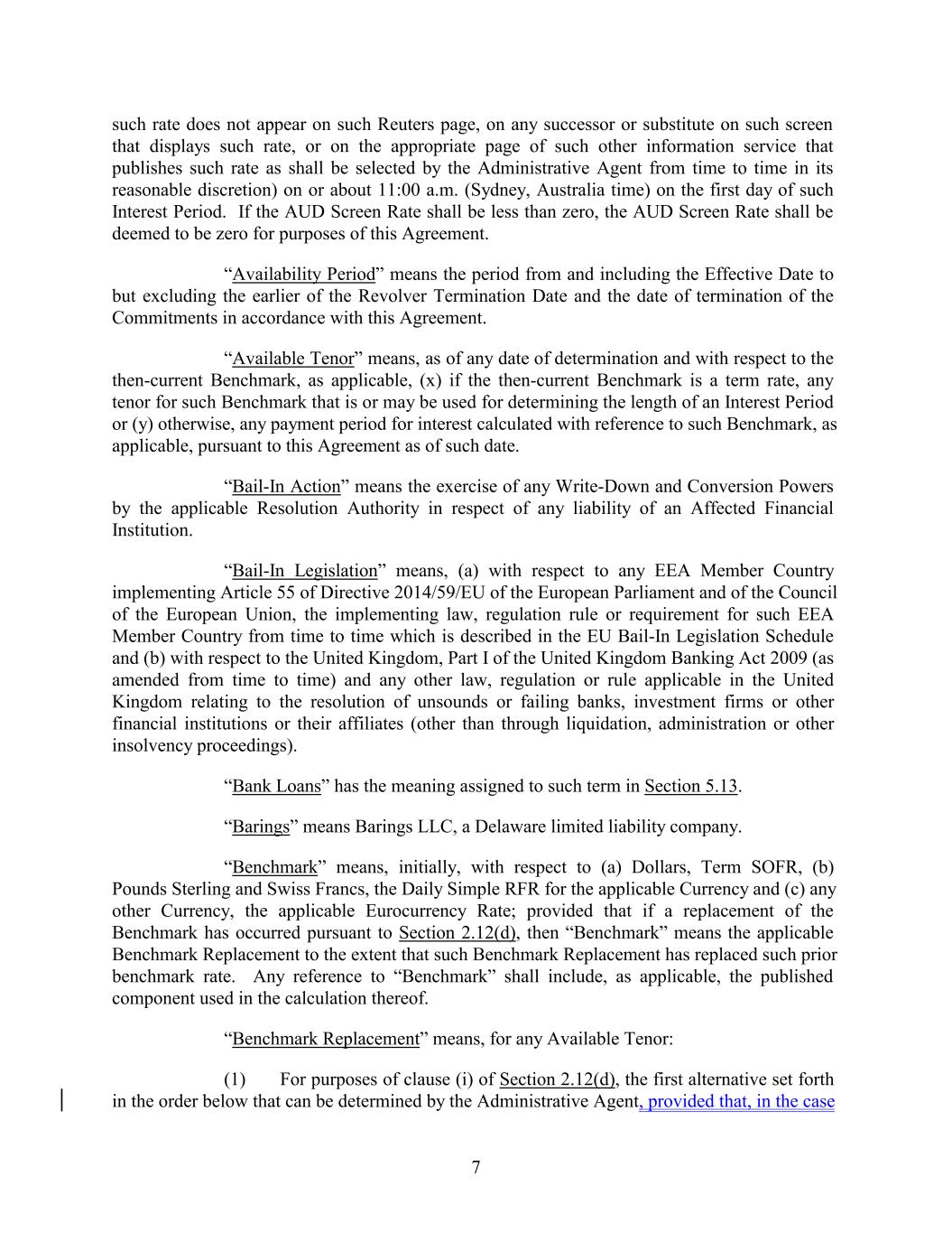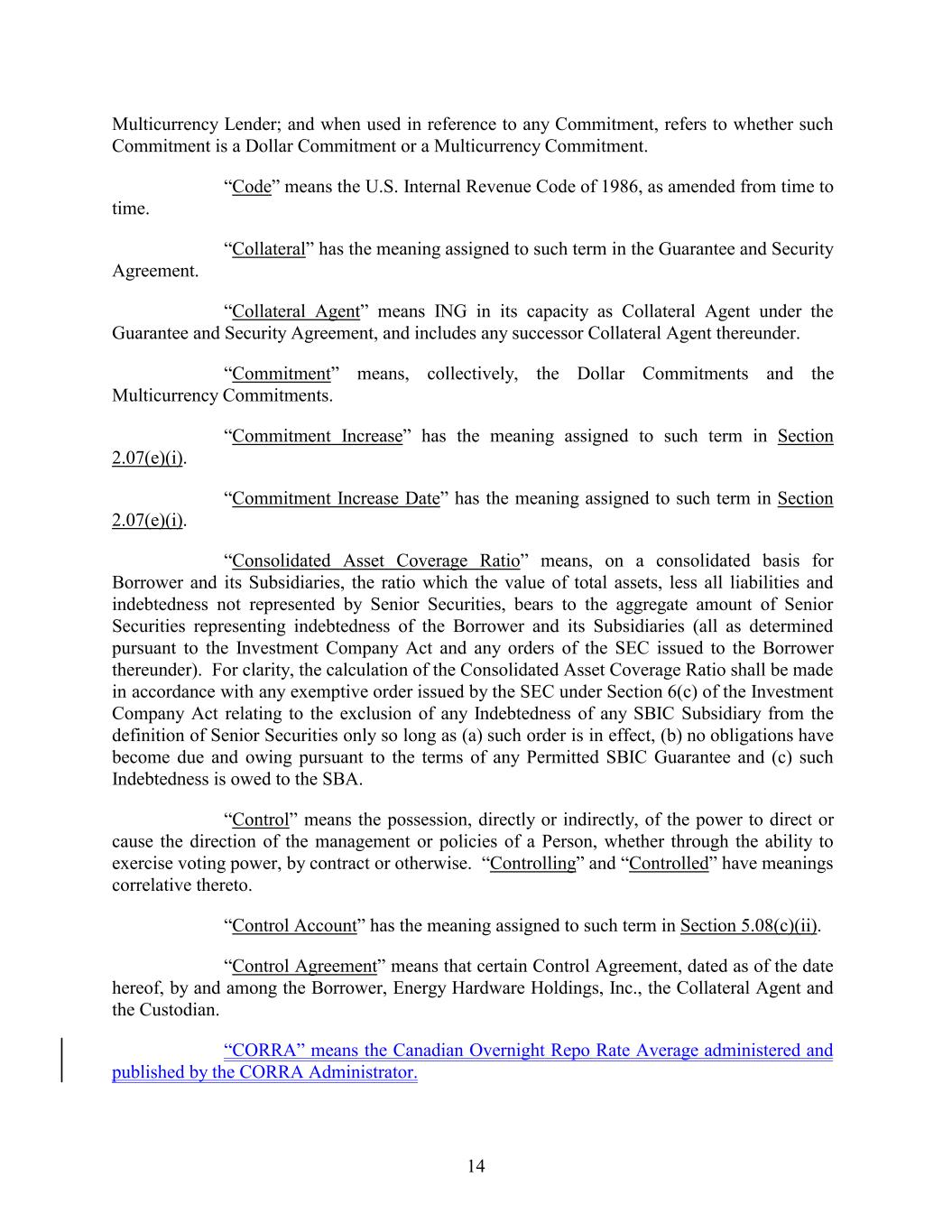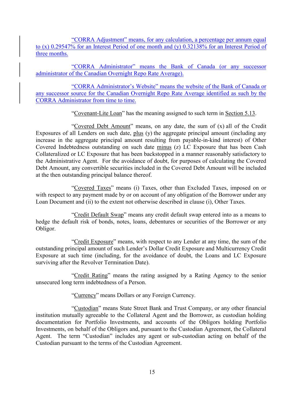 provided, that at any time the Consolidated Asset Coverage Ratio is less than 167% (as reported in the most recently delivered monthly Borrowing Base Certificate pursuant to Section 5.01(d)), every Advance Rate in the table above that is below the line for “Performing First Lien Middle Market Loans” shall be five percentage points less than the applicable rate indicated in the table. For the avoidance of doubt, the categories above are intended to be indicative of the traditional investment types. All determinations of whether a particular Portfolio Investment belongs to one category or another shall be made by the Borrower on a consistent basis with the foregoing. For example, a secured bank loan solely at a holding company, the only assets of which are the shares of an operating company, may constitute Mezzanine Investments, but would not ordinarily constitute a First Lien Bank Loan. “Bank Loans” means debt obligations (including, without limitation, term loans, revolving loans, debtor-in-possession financings, the funded portion of revolving credit lines and letter of credit facilities and other similar loans and investments including interim loans, bridge loans and second lien loans) that are generally provided under a syndicated loan or credit facility or pursuant to any loan agreement or other similar credit facility, whether or not syndicated. “Broadly Syndicated Loan” means any syndicated loan that is widely distributed and (i) that has a tranche size of $250,000,000 or greater, (ii) that is a Performing First Lien Bank Loan, (iii) that is rated by both S&P and Moody’s and is rated at least B- and B3, respectively, for any measurement date, and (iv) that is a Quoted Investment. “Cash” has the meaning assigned to such term in Section 1.01 of this Agreement. “Cash Equivalents” has the meaning assigned to such term in Section 1.01 of this Agreement. “Covenant-Lite Loan” means a Bank Loan (other than a Broadly Syndicated Loan) that does not require the Portfolio Company thereunder to comply with at least one financial maintenance covenant (including, without limitation, any covenant relating to a borrowing base, asset valuation or similar asset-based requirement), in each case, regardless of whether compliance with one or more incurrence covenants is otherwise required by such Bank Loan. “Defaulted Obligation” means any Investment in Indebtedness (a) as to which, (x) a default as to the payment of principal and/or interest has occurred and is continuing for a period of thirty two (32) consecutive days with respect to such Indebtedness (without regard to any grace period applicable thereto, or waiver thereof) or (y) a default not set forth in clause (x) has occurred and the holders of such Indebtedness have accelerated all or a portion of the principal amount thereof as a result of such default; (b) as to which a default as to the payment of principal and/or interest has occurred and is continuing on another material debt obligation of the Portfolio Company under such Indebtedness which is senior or pari passu in right of payment to such Indebtedness; (c) as to which the Portfolio Company under such Indebtedness or others have instituted proceedings to have such Portfolio Company adjudicated bankrupt or insolvent or placed into receivership and such proceedings have not been stayed or dismissed or such 128