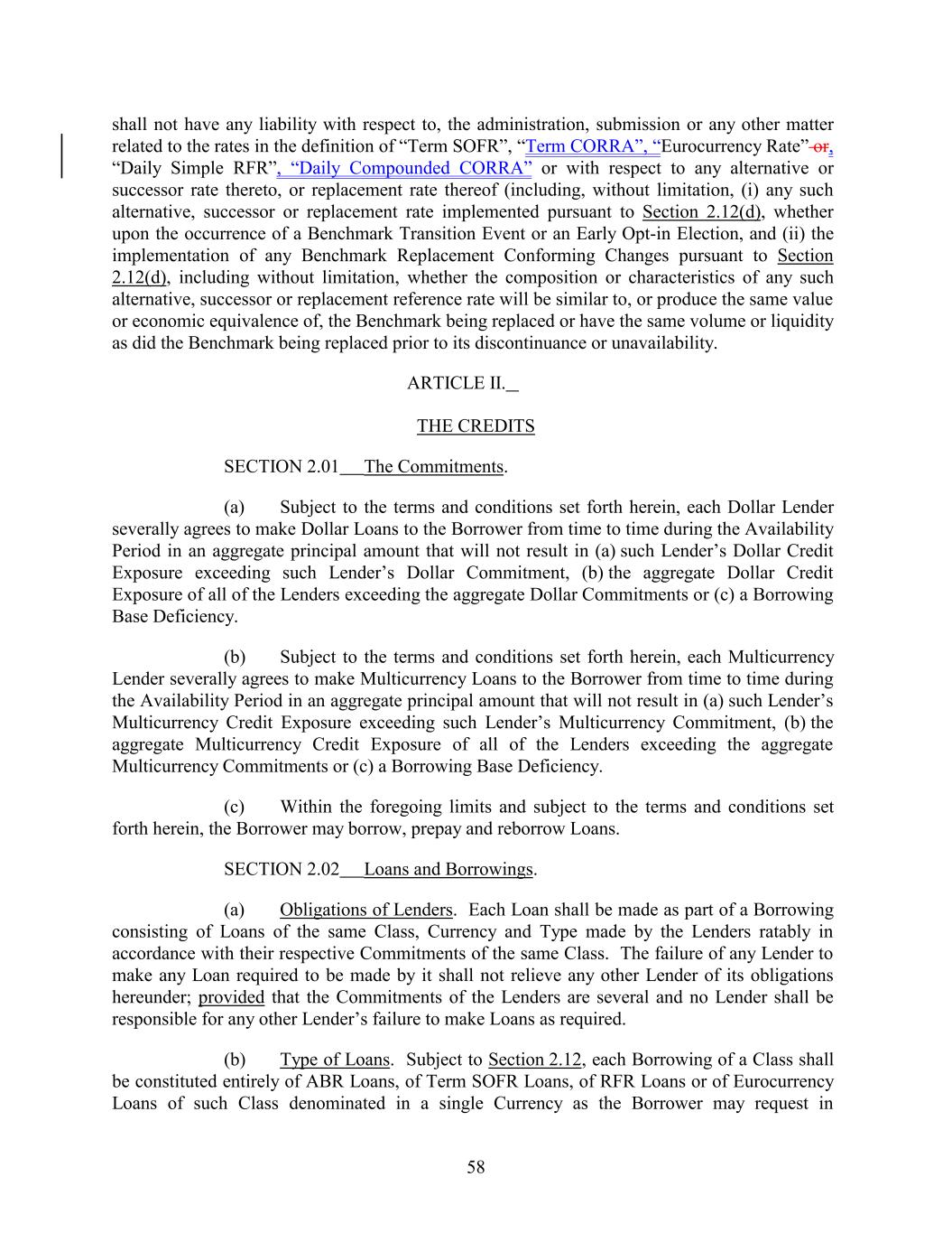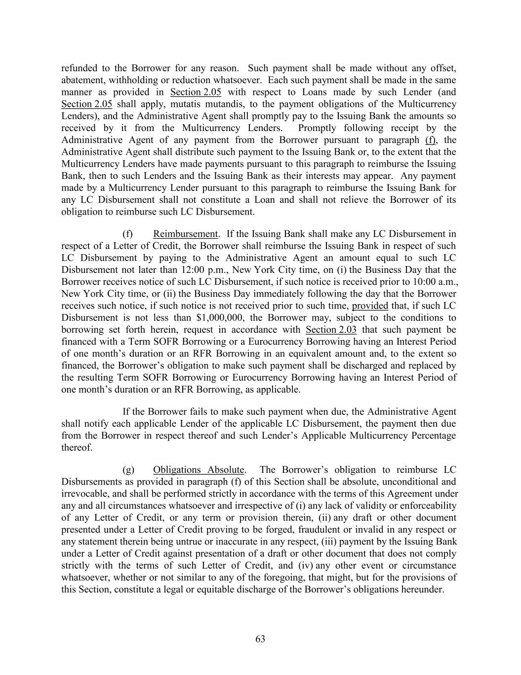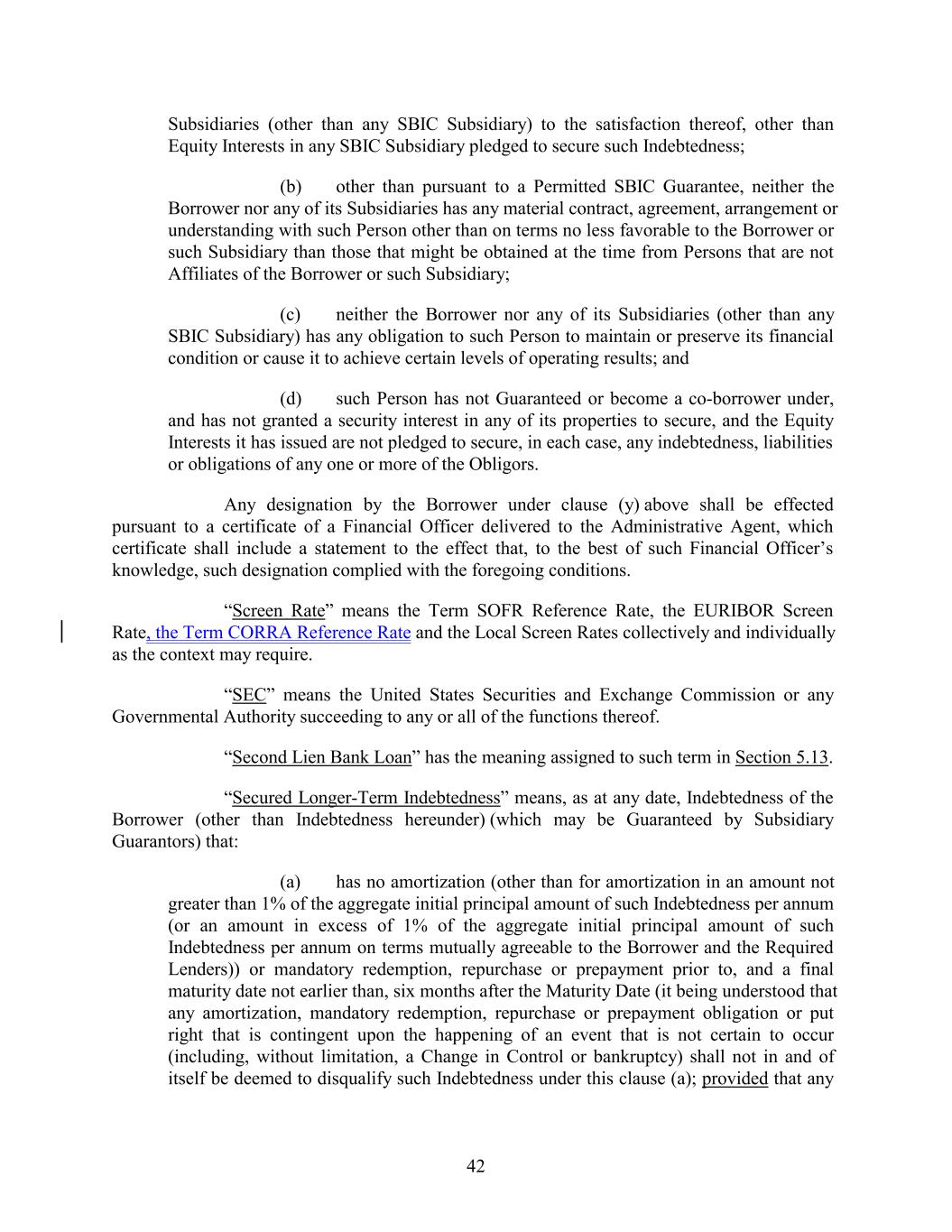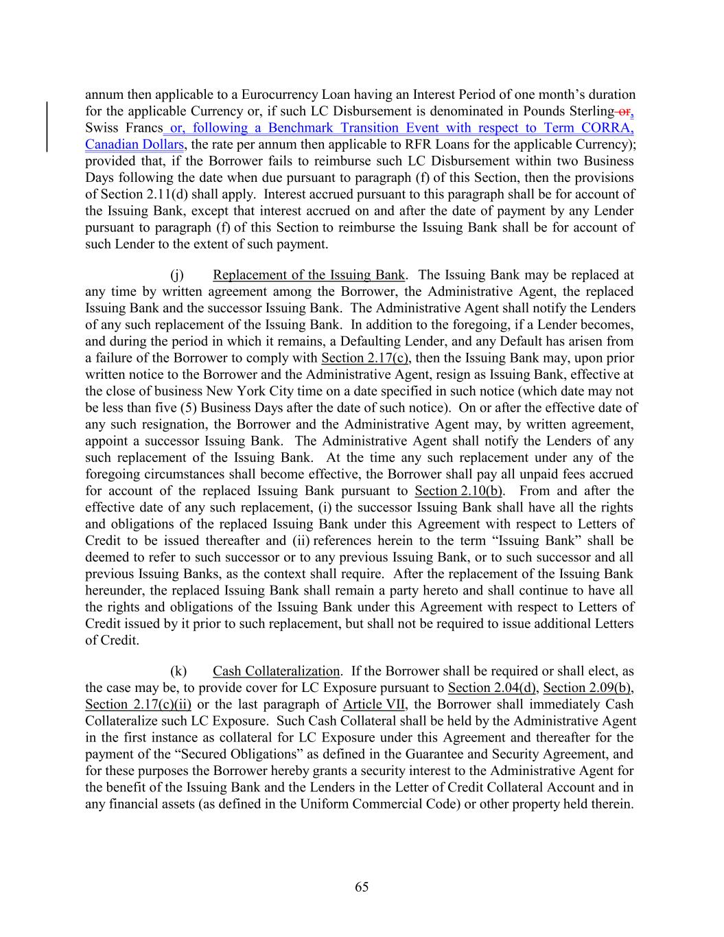 Secured Obligations shall automatically be reassigned to the Secured Parties pro rata with their original interest in such Secured Obligations and the equity interests and/or debt instruments issued by any acquisition vehicle on account of such Secured Obligations shall automatically be cancelled, without the need for any Secured Party or any acquisition vehicle to take any further action. Notwithstanding that the ratable portion of the Secured Obligations of each Secured Party are deemed assigned to the acquisition vehicle or vehicles as set forth in clause (ii) above, each Secured Party shall execute such documents and provide such information regarding the Secured Party (and/or any designee of the Secured Party which will receive interests in or debt instruments issued by such acquisition vehicle) as the Collateral Agent may reasonably request in connection with the formation of any acquisition vehicle, the formulation or submission of any credit bid or the consummation of the transactions contemplated by such credit bid. SECTION 8.13 Non-Receipt of Funds by Administrative Agent; Erroneous Payments. (a) Unless Administrative Agent shall have received notice from a Lender or Borrower (either one as appropriate being the “Payor”) prior to the date on which such Lender is to make payment hereunder to Administrative Agent of the proceeds of a Loan or Borrower is to make payment to Administrative Agent, as the case may be (either such payment being a “Required Payment”), which notice shall be effective upon receipt, that the Payor will not make the Required Payment in full to Administrative Agent, Administrative Agent may assume that the Required Payment has been made in full to Administrative Agent on such date, and Administrative Agent in its sole discretion may, but shall not be obligated to, in reliance upon such assumption, make the amount thereof available to the intended recipient on such date. If and to the extent the Payor shall not have in fact so made the Required Payment in full to Administrative Agent, the recipient of such payment shall repay to Administrative Agent forthwith on demand such amount made available to it together with interest thereon, for each day from the date such amount was so made available by Administrative Agent until the date Administrative Agent recovers such amount, at (i) in the case of such Lender, the greater of the Federal Funds Effective Rate and a rate determined by the Administrative Agent in accordance with banking industry rules on interbank compensation from time to time in effect and (ii) in the case of the Borrower, (x) with respect to Term SOFR Borrowings, the interest rate applicable to Term SOFR Loans having an Interest Period of one month’s duration, (y) with respect to Eurocurrency Borrowings, the interest rate applicable to Eurocurrency Loans having an Interest Period of one month’s duration and (z) with respect to Borrowings denominated in Pounds Sterling or, Swiss Francs or, following a Benchmark Transition Event with respect to Term CORRA, Canadian Dollars, the interest rate applicable to RFR Loans denominated in such Currency, as applicable. (b) (i) Each Lender hereby agrees that (x) if the Administrative Agent notifies such Lender that the Administrative Agent has determined in its sole discretion that any funds received by such Lender from the Administrative Agent or any of its Affiliates (whether as a payment, prepayment or repayment of principal, interest, fees or otherwise; individually and collectively, a “Payment”) were erroneously transmitted to such Lender (whether or not known to such Lender), and demands the return of such Payment (or a portion thereof), such Lender shall promptly, but in no event later than two Business Days thereafter, return to the 156