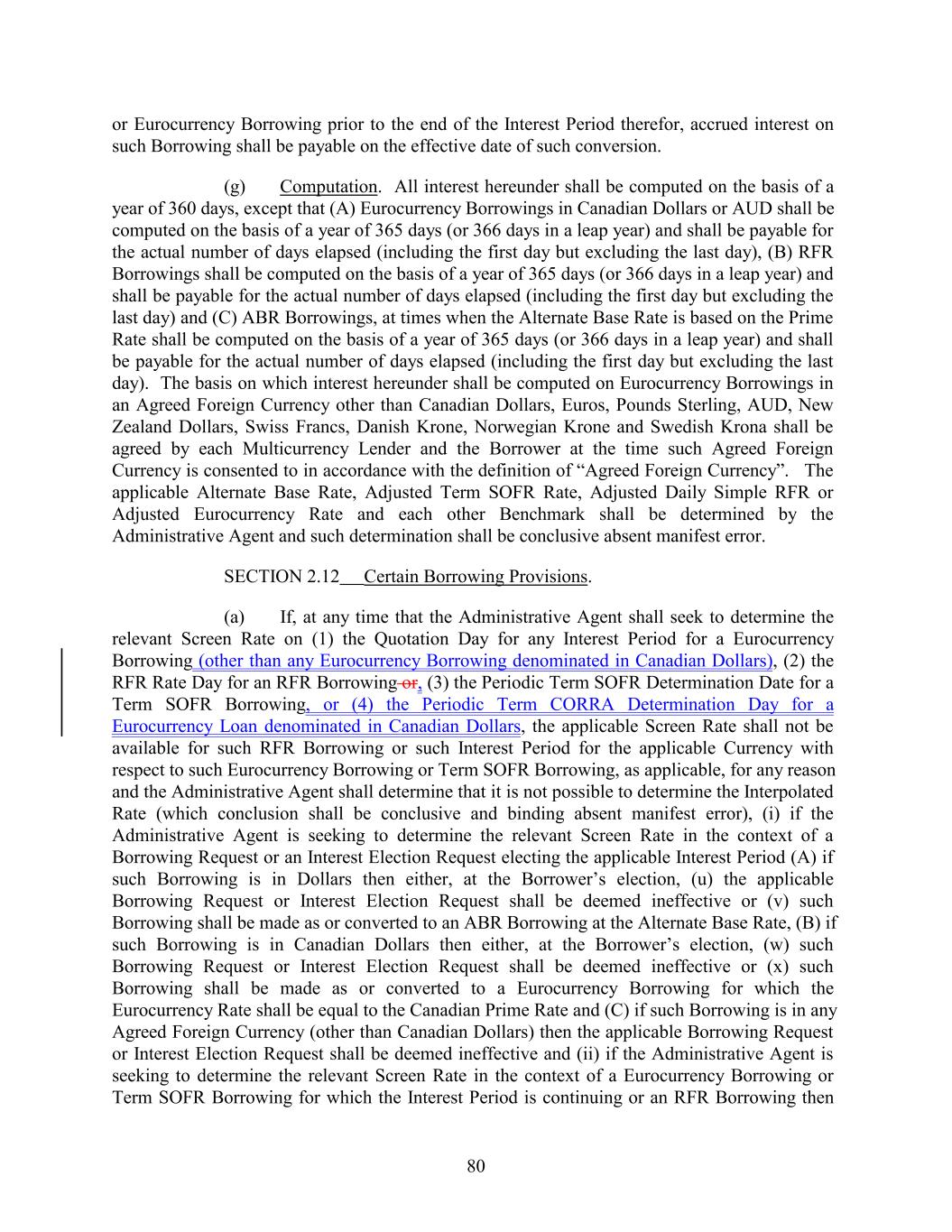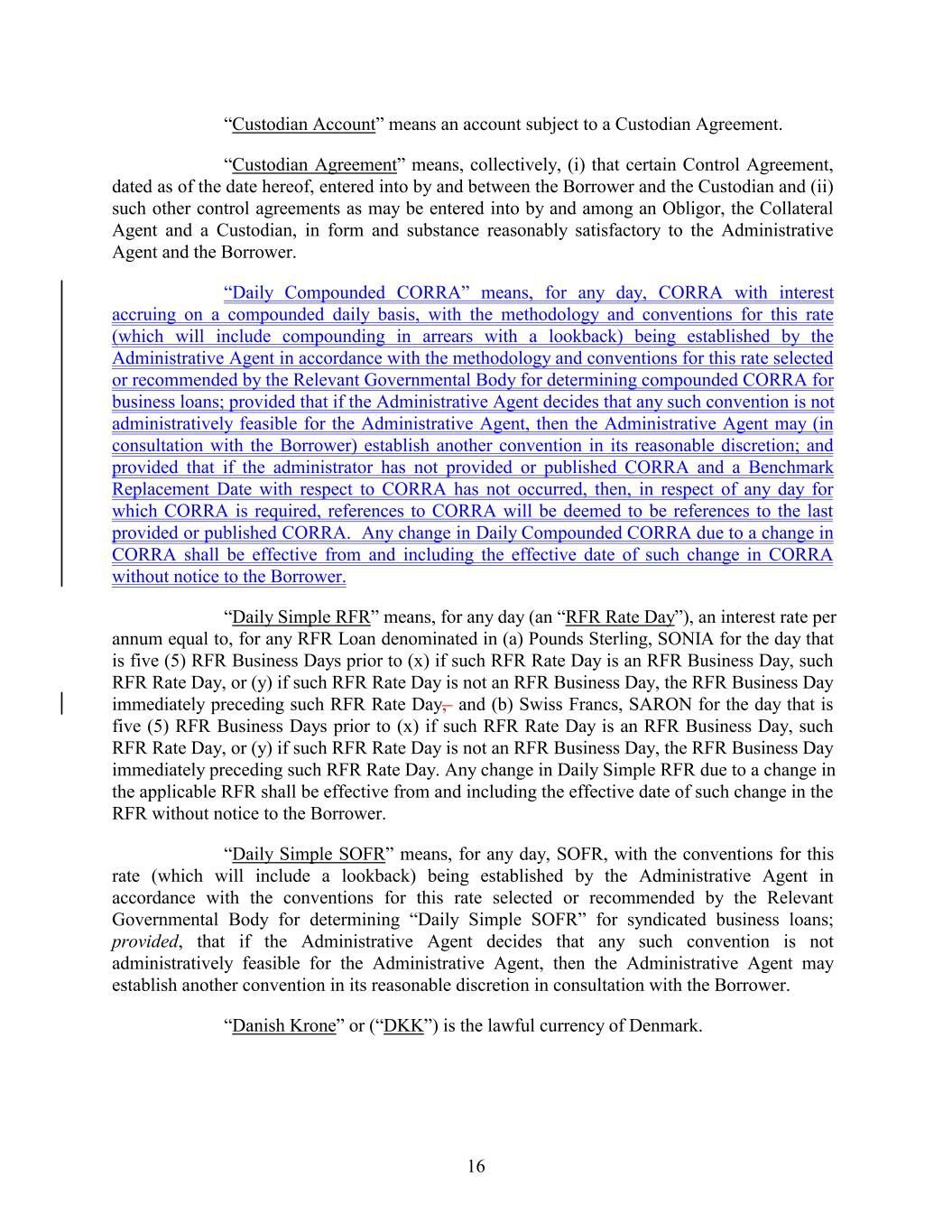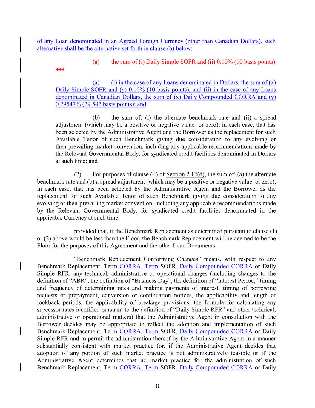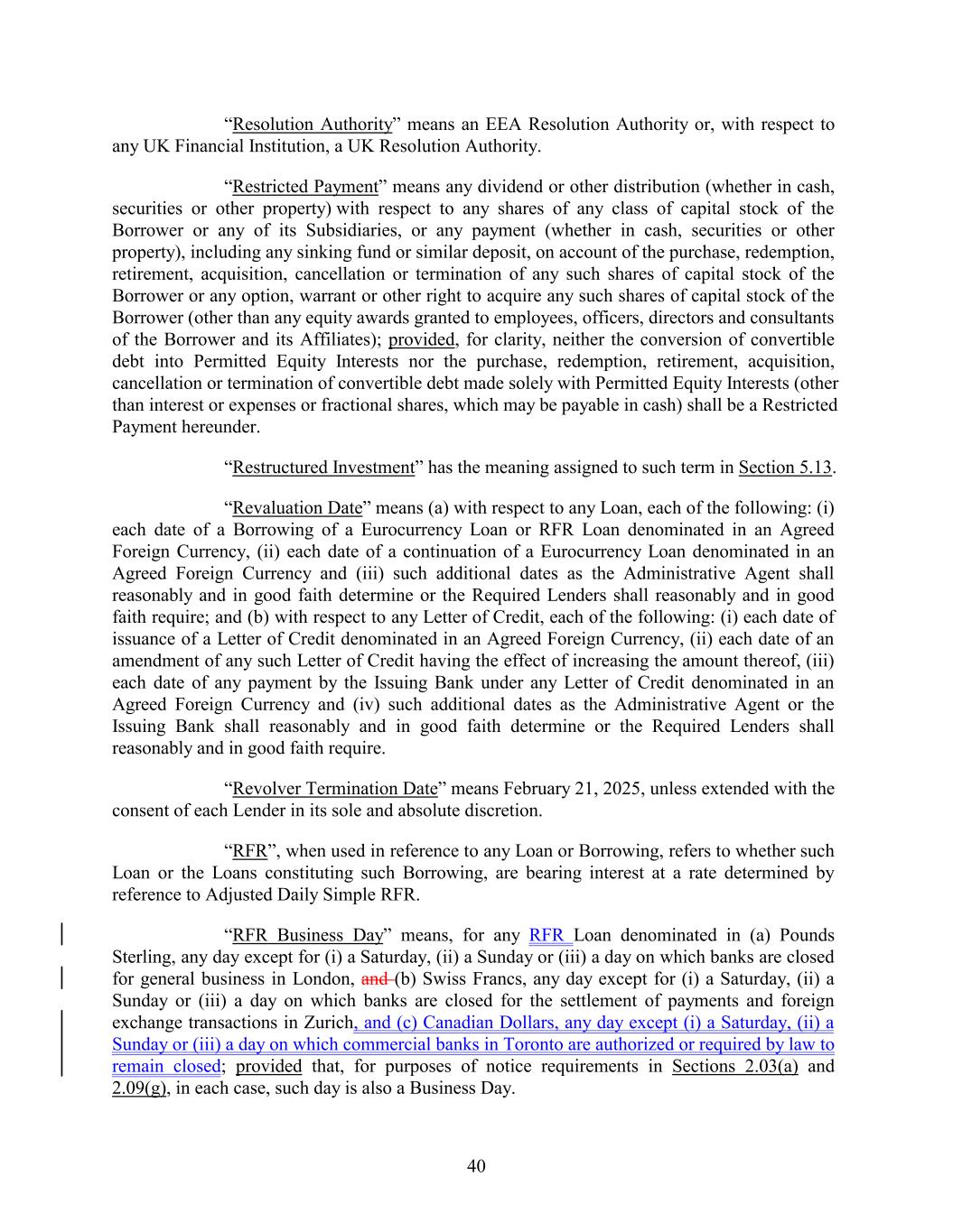 Secured Obligations shall automatically be reassigned to the Secured Parties pro rata with their original interest in such Secured Obligations and the equity interests and/or debt instruments issued by any acquisition vehicle on account of such Secured Obligations shall automatically be cancelled, without the need for any Secured Party or any acquisition vehicle to take any further action. Notwithstanding that the ratable portion of the Secured Obligations of each Secured Party are deemed assigned to the acquisition vehicle or vehicles as set forth in clause (ii) above, each Secured Party shall execute such documents and provide such information regarding the Secured Party (and/or any designee of the Secured Party which will receive interests in or debt instruments issued by such acquisition vehicle) as the Collateral Agent may reasonably request in connection with the formation of any acquisition vehicle, the formulation or submission of any credit bid or the consummation of the transactions contemplated by such credit bid. SECTION 8.13 Non-Receipt of Funds by Administrative Agent; Erroneous Payments. (a) Unless Administrative Agent shall have received notice from a Lender or Borrower (either one as appropriate being the “Payor”) prior to the date on which such Lender is to make payment hereunder to Administrative Agent of the proceeds of a Loan or Borrower is to make payment to Administrative Agent, as the case may be (either such payment being a “Required Payment”), which notice shall be effective upon receipt, that the Payor will not make the Required Payment in full to Administrative Agent, Administrative Agent may assume that the Required Payment has been made in full to Administrative Agent on such date, and Administrative Agent in its sole discretion may, but shall not be obligated to, in reliance upon such assumption, make the amount thereof available to the intended recipient on such date. If and to the extent the Payor shall not have in fact so made the Required Payment in full to Administrative Agent, the recipient of such payment shall repay to Administrative Agent forthwith on demand such amount made available to it together with interest thereon, for each day from the date such amount was so made available by Administrative Agent until the date Administrative Agent recovers such amount, at (i) in the case of such Lender, the greater of the Federal Funds Effective Rate and a rate determined by the Administrative Agent in accordance with banking industry rules on interbank compensation from time to time in effect and (ii) in the case of the Borrower, (x) with respect to Term SOFR Borrowings, the interest rate applicable to Term SOFR Loans having an Interest Period of one month’s duration, (y) with respect to Eurocurrency Borrowings, the interest rate applicable to Eurocurrency Loans having an Interest Period of one month’s duration and (z) with respect to Borrowings denominated in Pounds Sterling or, Swiss Francs or, following a Benchmark Transition Event with respect to Term CORRA, Canadian Dollars, the interest rate applicable to RFR Loans denominated in such Currency, as applicable. (b) (i) Each Lender hereby agrees that (x) if the Administrative Agent notifies such Lender that the Administrative Agent has determined in its sole discretion that any funds received by such Lender from the Administrative Agent or any of its Affiliates (whether as a payment, prepayment or repayment of principal, interest, fees or otherwise; individually and collectively, a “Payment”) were erroneously transmitted to such Lender (whether or not known to such Lender), and demands the return of such Payment (or a portion thereof), such Lender shall promptly, but in no event later than two Business Days thereafter, return to the 156
