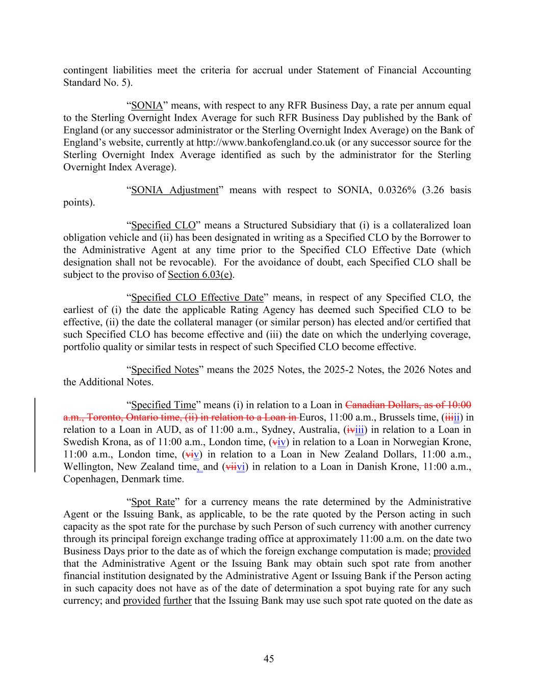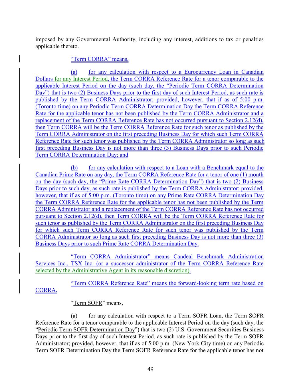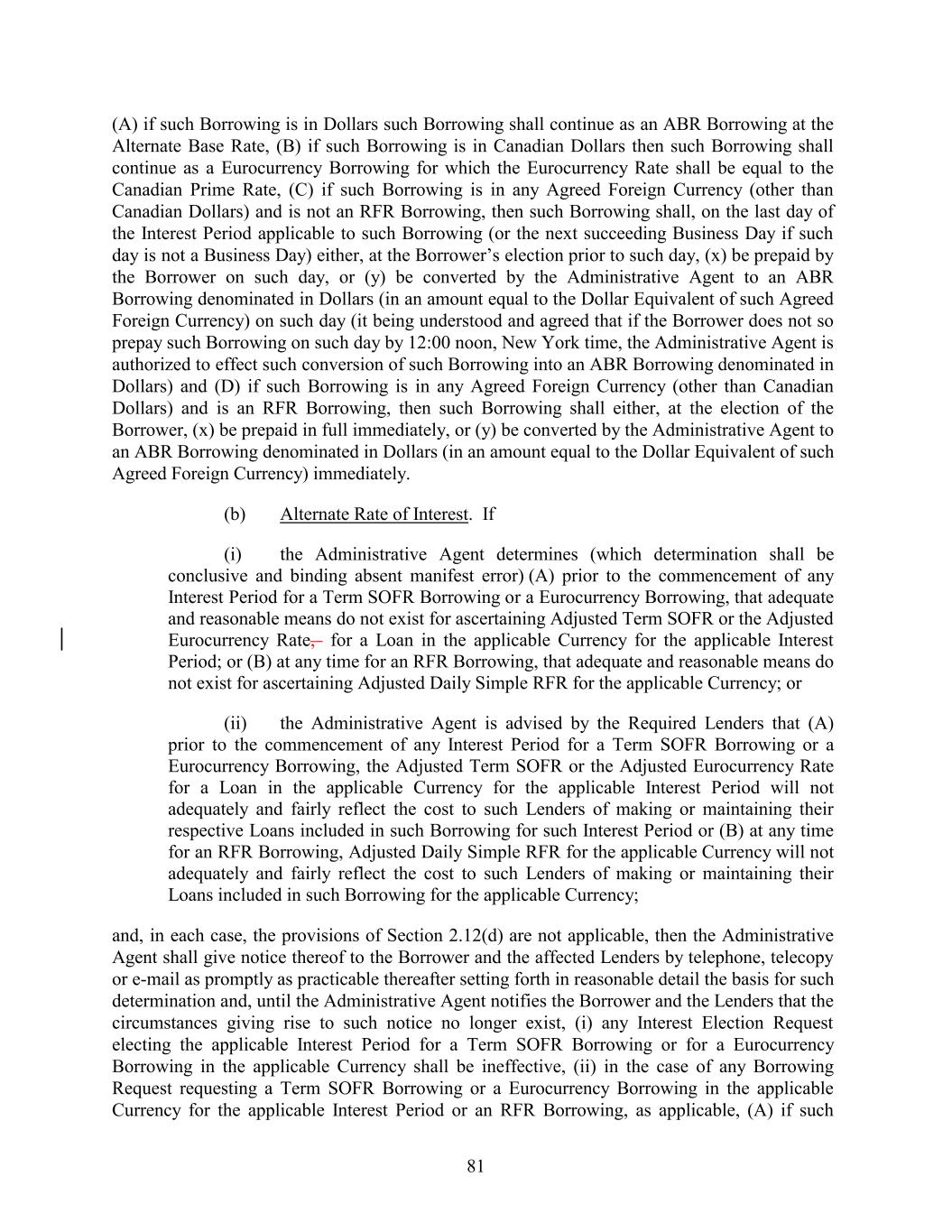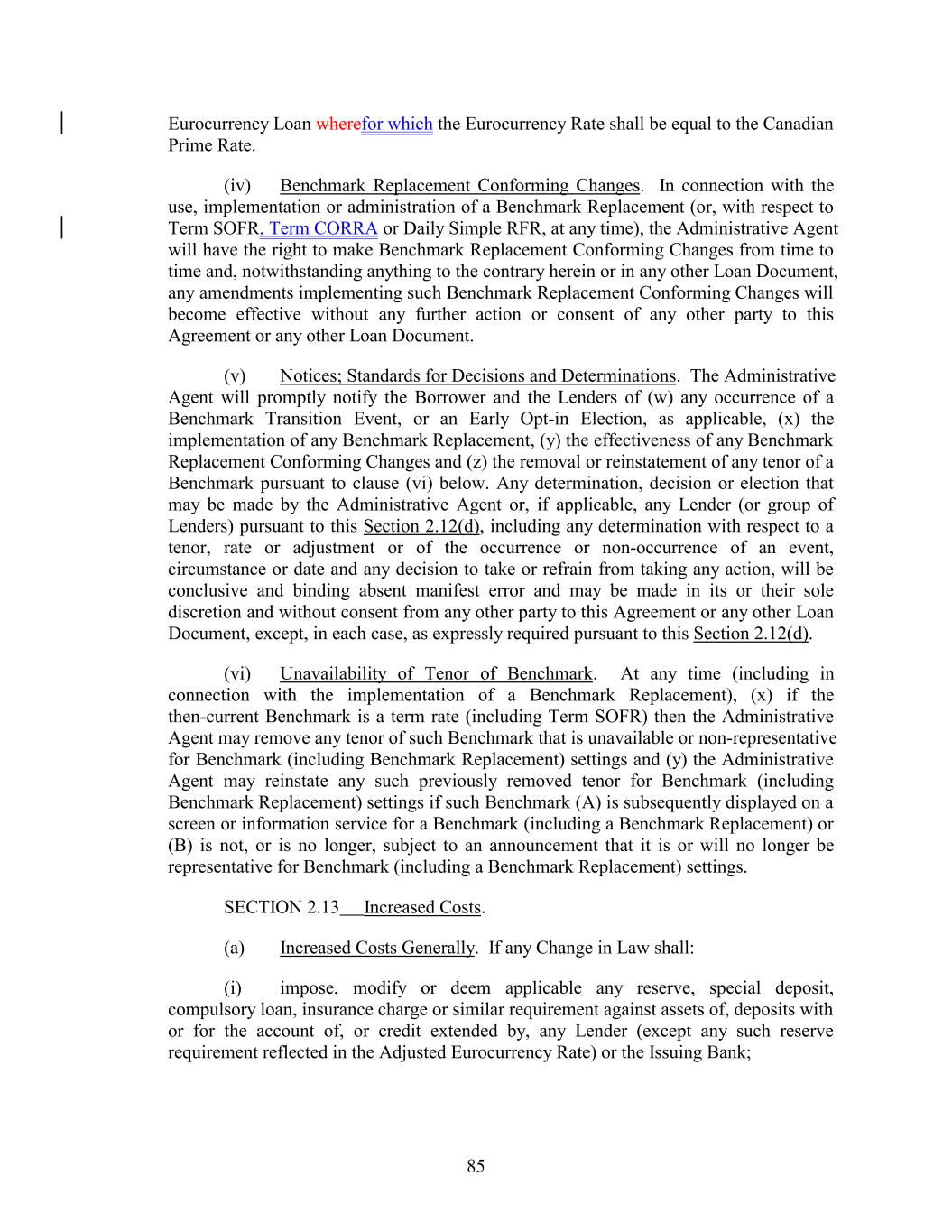 Secured Obligations shall automatically be reassigned to the Secured Parties pro rata with their original interest in such Secured Obligations and the equity interests and/or debt instruments issued by any acquisition vehicle on account of such Secured Obligations shall automatically be cancelled, without the need for any Secured Party or any acquisition vehicle to take any further action. Notwithstanding that the ratable portion of the Secured Obligations of each Secured Party are deemed assigned to the acquisition vehicle or vehicles as set forth in clause (ii) above, each Secured Party shall execute such documents and provide such information regarding the Secured Party (and/or any designee of the Secured Party which will receive interests in or debt instruments issued by such acquisition vehicle) as the Collateral Agent may reasonably request in connection with the formation of any acquisition vehicle, the formulation or submission of any credit bid or the consummation of the transactions contemplated by such credit bid. SECTION 8.13 Non-Receipt of Funds by Administrative Agent; Erroneous Payments. (a) Unless Administrative Agent shall have received notice from a Lender or Borrower (either one as appropriate being the “Payor”) prior to the date on which such Lender is to make payment hereunder to Administrative Agent of the proceeds of a Loan or Borrower is to make payment to Administrative Agent, as the case may be (either such payment being a “Required Payment”), which notice shall be effective upon receipt, that the Payor will not make the Required Payment in full to Administrative Agent, Administrative Agent may assume that the Required Payment has been made in full to Administrative Agent on such date, and Administrative Agent in its sole discretion may, but shall not be obligated to, in reliance upon such assumption, make the amount thereof available to the intended recipient on such date. If and to the extent the Payor shall not have in fact so made the Required Payment in full to Administrative Agent, the recipient of such payment shall repay to Administrative Agent forthwith on demand such amount made available to it together with interest thereon, for each day from the date such amount was so made available by Administrative Agent until the date Administrative Agent recovers such amount, at (i) in the case of such Lender, the greater of the Federal Funds Effective Rate and a rate determined by the Administrative Agent in accordance with banking industry rules on interbank compensation from time to time in effect and (ii) in the case of the Borrower, (x) with respect to Term SOFR Borrowings, the interest rate applicable to Term SOFR Loans having an Interest Period of one month’s duration, (y) with respect to Eurocurrency Borrowings, the interest rate applicable to Eurocurrency Loans having an Interest Period of one month’s duration and (z) with respect to Borrowings denominated in Pounds Sterling or, Swiss Francs or, following a Benchmark Transition Event with respect to Term CORRA, Canadian Dollars, the interest rate applicable to RFR Loans denominated in such Currency, as applicable. (b) (i) Each Lender hereby agrees that (x) if the Administrative Agent notifies such Lender that the Administrative Agent has determined in its sole discretion that any funds received by such Lender from the Administrative Agent or any of its Affiliates (whether as a payment, prepayment or repayment of principal, interest, fees or otherwise; individually and collectively, a “Payment”) were erroneously transmitted to such Lender (whether or not known to such Lender), and demands the return of such Payment (or a portion thereof), such Lender shall promptly, but in no event later than two Business Days thereafter, return to the 156