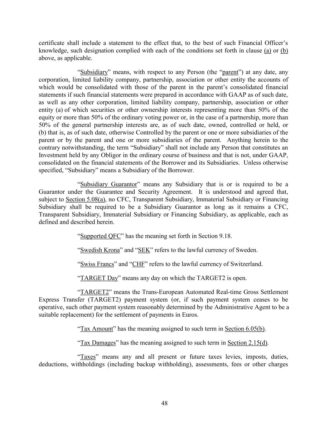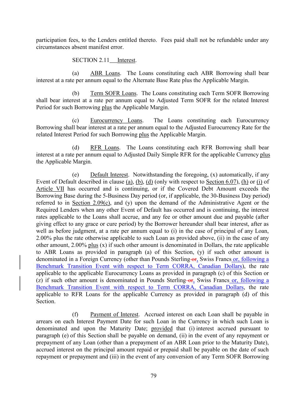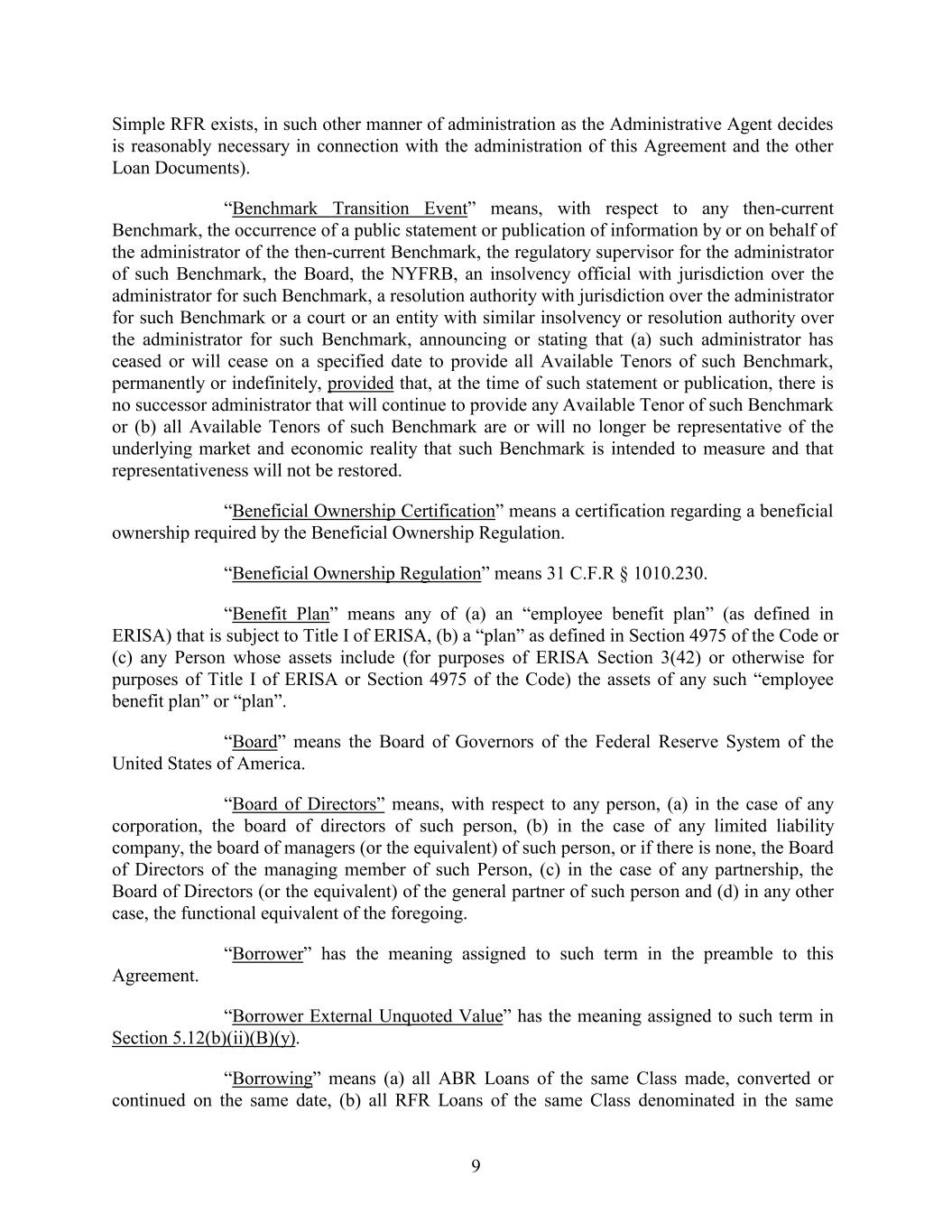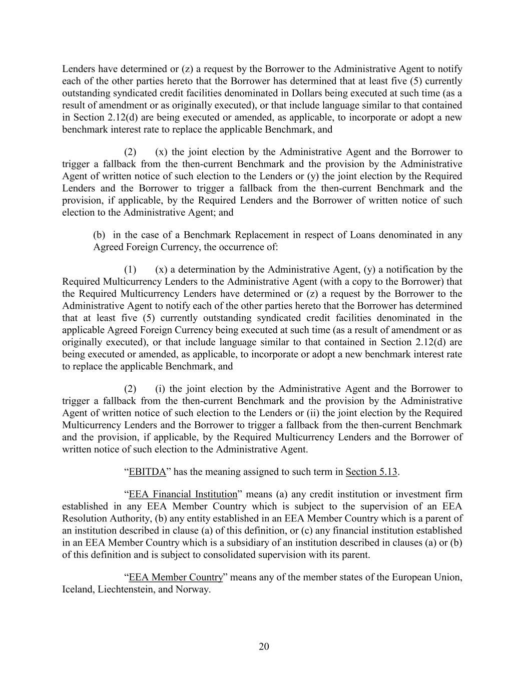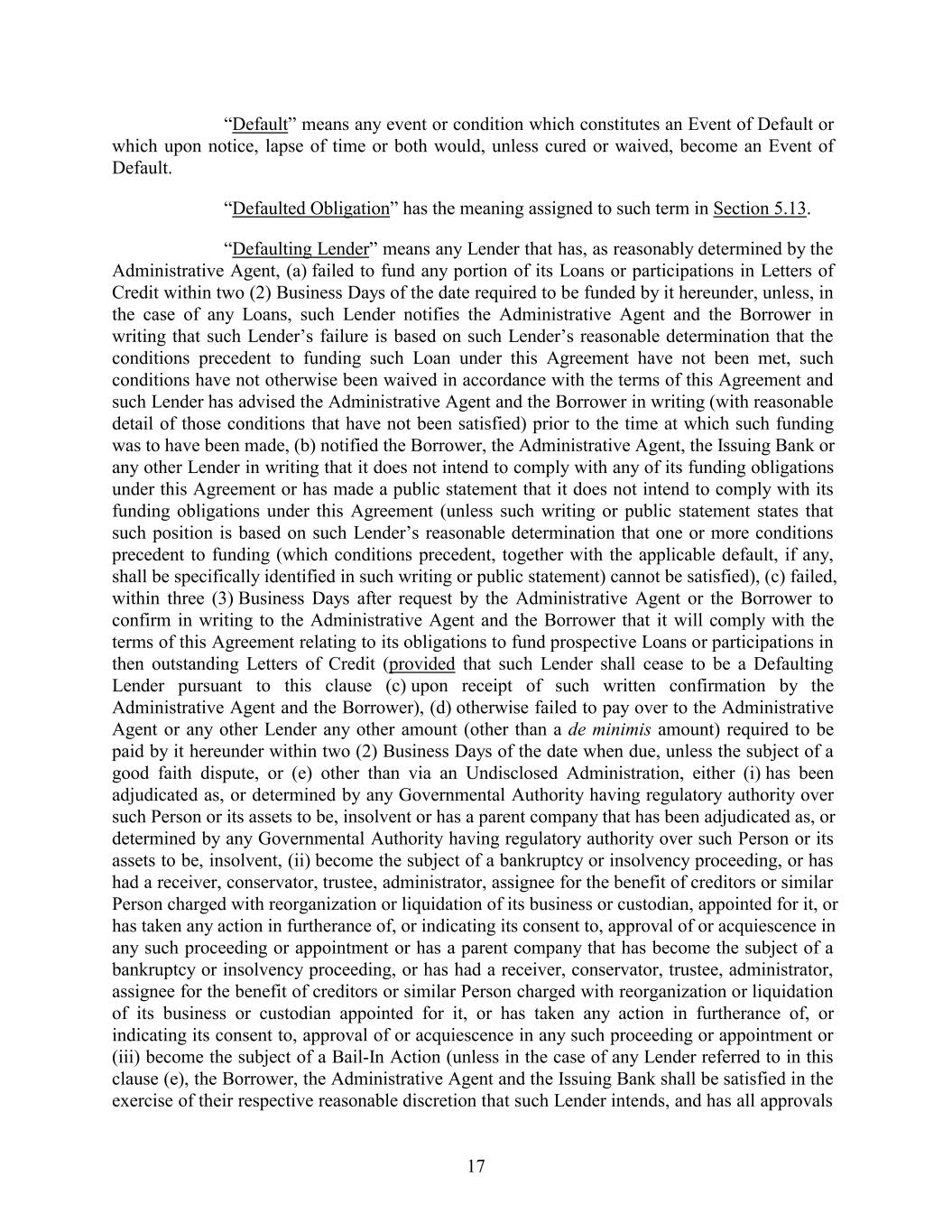 agreement, arrangement or understanding among any such parties, each party hereto acknowledges that any liability of any Affected Financial Institution arising under any Loan Document, to the extent such liability is unsecured, may be subject to the write-down and conversion powers of the applicable Resolution Authority and agrees and consents to, and acknowledges and agrees to be bound by: (a) the application of any Write-Down and Conversion Powers by the applicable Resolution Authority to any such liabilities arising hereunder which may be payable to it by any party hereto that is an Affected Financial Institution; and (b) the effects of any Bail-In Action on any such liability, including, if applicable: (i) a reduction in full or in part or cancellation of any such liability; (ii) a conversion of all, or a portion of, such liability into shares or other instruments of ownership in such Affected Financial Institution, its parent entity, or a bridge institution that may be issued to it or otherwise conferred on it, and that such shares or other instruments of ownership will be accepted by it in lieu of any rights with respect to any such liability under this Agreement or any other Loan Document; or (iii) the variation of the terms of such liability in connection with the exercise of the write-down and conversion powers of the applicable Resolution Authority. SECTION 9.17 Interest Rate Limitation. Notwithstanding anything to the contrary contained in any Loan Document, the interest paid or agreed to be paid under the Loan Documents shall not exceed the Maximum Rate. If Administrative Agent or any Lender shall receive interest in an amount that exceeds the Maximum Rate, the excess interest shall be applied to the principal of the Loans or, if it exceeds such unpaid principal, refunded to Borrower. In determining whether the interest contracted for, charged, or received by Administrative Agent or a Lender exceeds the Maximum Rate, such Person may, to the extent permitted by applicable law, (a) characterize any payment that is not principal as an expense, fee, or premium rather than interest, (b) exclude voluntary prepayments and the effects thereof, and (c) amortize, prorate, allocate, and spread in equal or unequal parts the total amount of interest throughout the contemplated term of the Secured Obligations hereunder. SECTION 9.18 Acknowledgement Regarding any Supported QFCs To the extent that the Loan Documents provide support, through a guarantee or otherwise, for Hedging Agreements or any other agreements or instrument that is a QFC (such support, “QFC Credit Support”) and each such QFC a “Supported QFC”), the parties acknowledge and agree as follows with respect to the resolution power of the Federal Deposit Insurance Corporation under the Federal Deposit Insurance Act and Title II of the Dodd-Frank Wall Street Reform and Consumer Protection Act (together with the regulations promulgated thereunder, the “U.S. Special Resolution Regimes”) in respect of such Supported QFC and QFC Credit Support (with the provisions below applicable notwithstanding that the Loan Documents and any Supported 178