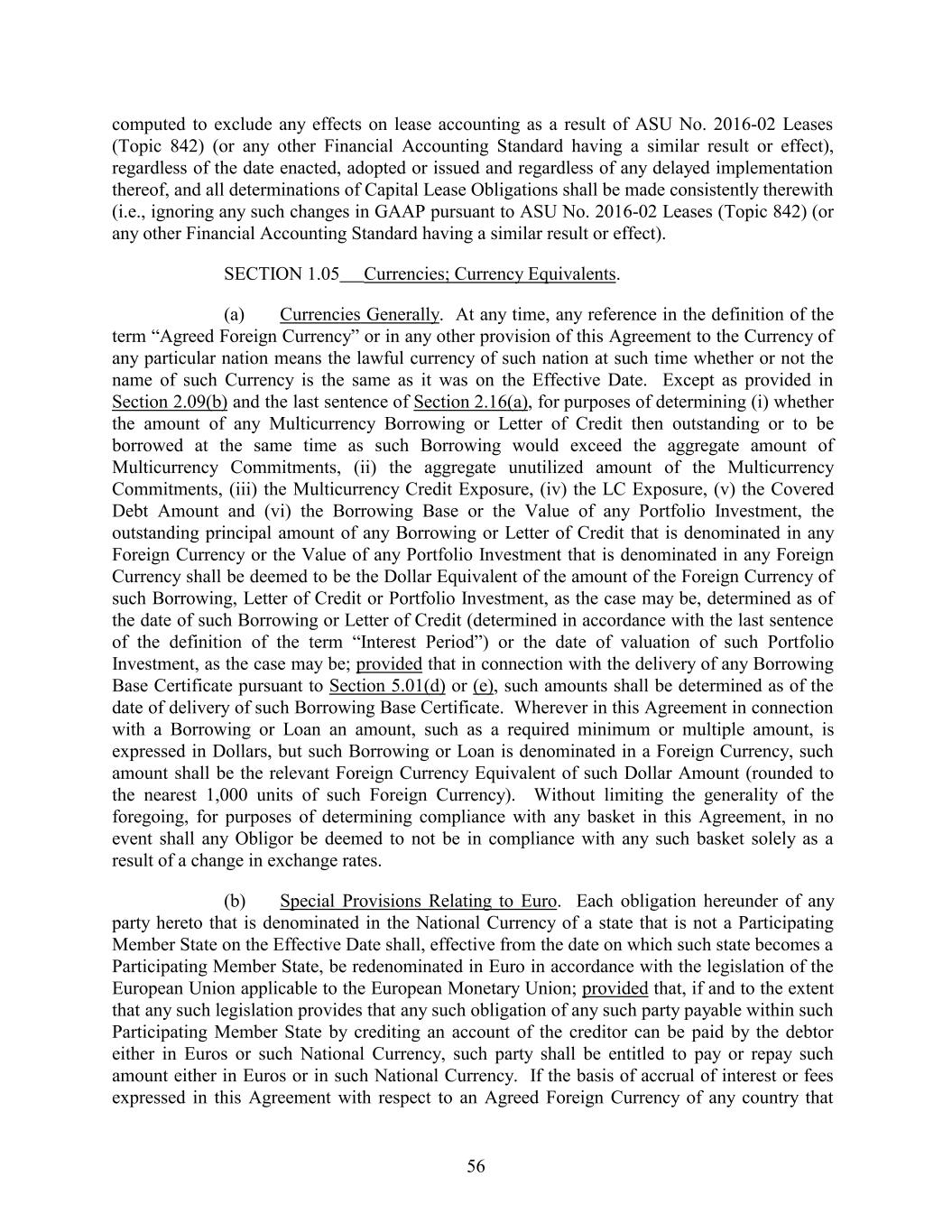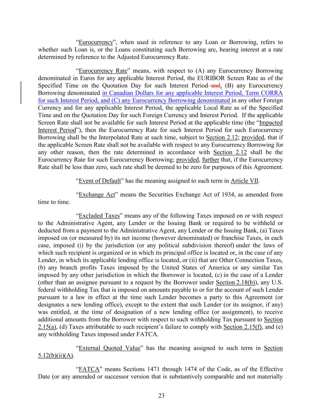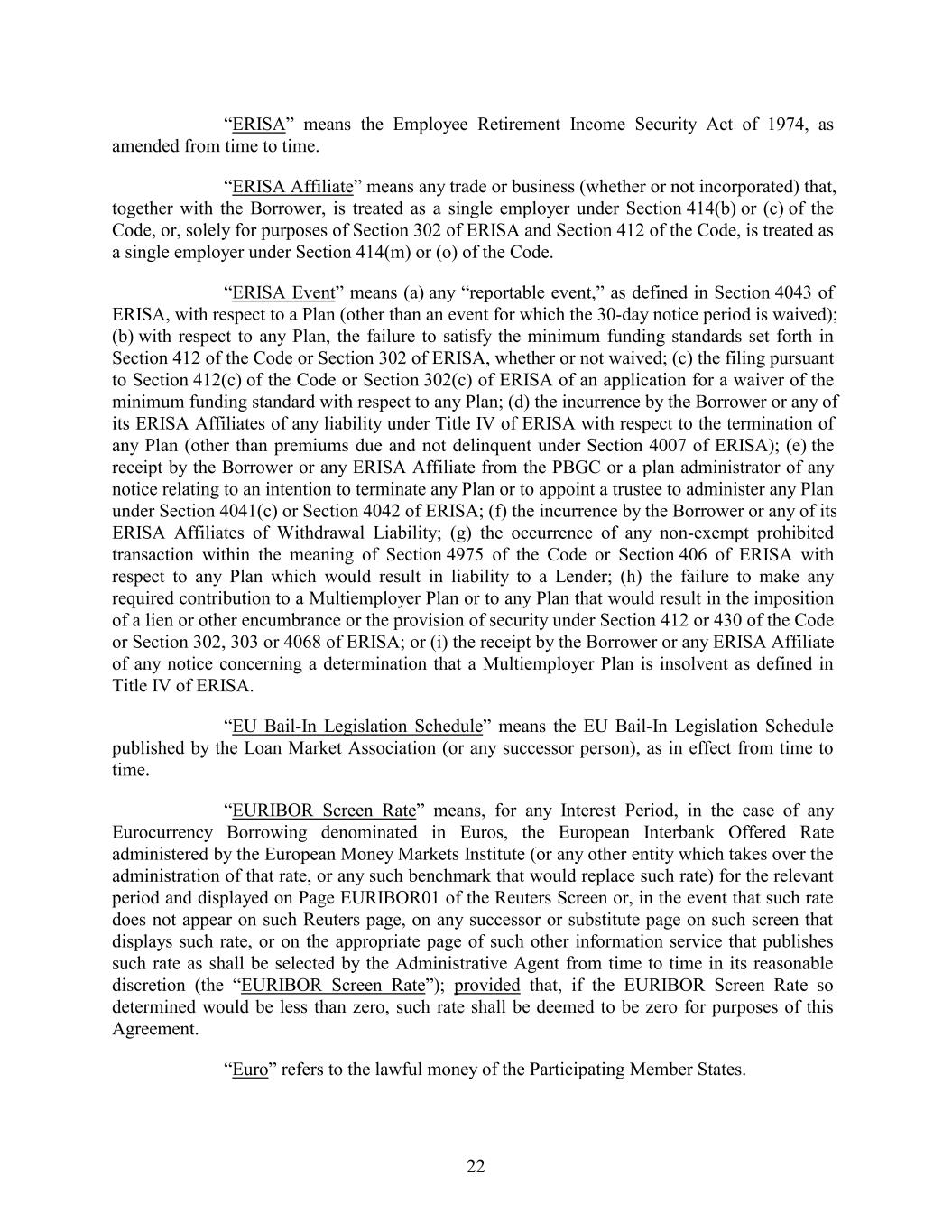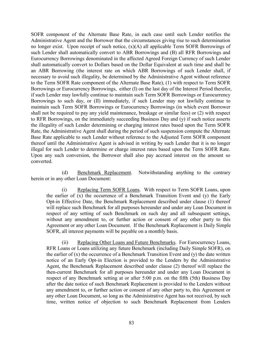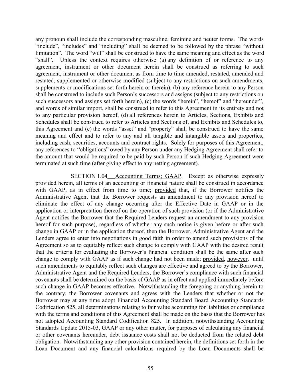 agreement, arrangement or understanding among any such parties, each party hereto acknowledges that any liability of any Affected Financial Institution arising under any Loan Document, to the extent such liability is unsecured, may be subject to the write-down and conversion powers of the applicable Resolution Authority and agrees and consents to, and acknowledges and agrees to be bound by: (a) the application of any Write-Down and Conversion Powers by the applicable Resolution Authority to any such liabilities arising hereunder which may be payable to it by any party hereto that is an Affected Financial Institution; and (b) the effects of any Bail-In Action on any such liability, including, if applicable: (i) a reduction in full or in part or cancellation of any such liability; (ii) a conversion of all, or a portion of, such liability into shares or other instruments of ownership in such Affected Financial Institution, its parent entity, or a bridge institution that may be issued to it or otherwise conferred on it, and that such shares or other instruments of ownership will be accepted by it in lieu of any rights with respect to any such liability under this Agreement or any other Loan Document; or (iii) the variation of the terms of such liability in connection with the exercise of the write-down and conversion powers of the applicable Resolution Authority. SECTION 9.17 Interest Rate Limitation. Notwithstanding anything to the contrary contained in any Loan Document, the interest paid or agreed to be paid under the Loan Documents shall not exceed the Maximum Rate. If Administrative Agent or any Lender shall receive interest in an amount that exceeds the Maximum Rate, the excess interest shall be applied to the principal of the Loans or, if it exceeds such unpaid principal, refunded to Borrower. In determining whether the interest contracted for, charged, or received by Administrative Agent or a Lender exceeds the Maximum Rate, such Person may, to the extent permitted by applicable law, (a) characterize any payment that is not principal as an expense, fee, or premium rather than interest, (b) exclude voluntary prepayments and the effects thereof, and (c) amortize, prorate, allocate, and spread in equal or unequal parts the total amount of interest throughout the contemplated term of the Secured Obligations hereunder. SECTION 9.18 Acknowledgement Regarding any Supported QFCs To the extent that the Loan Documents provide support, through a guarantee or otherwise, for Hedging Agreements or any other agreements or instrument that is a QFC (such support, “QFC Credit Support”) and each such QFC a “Supported QFC”), the parties acknowledge and agree as follows with respect to the resolution power of the Federal Deposit Insurance Corporation under the Federal Deposit Insurance Act and Title II of the Dodd-Frank Wall Street Reform and Consumer Protection Act (together with the regulations promulgated thereunder, the “U.S. Special Resolution Regimes”) in respect of such Supported QFC and QFC Credit Support (with the provisions below applicable notwithstanding that the Loan Documents and any Supported 178