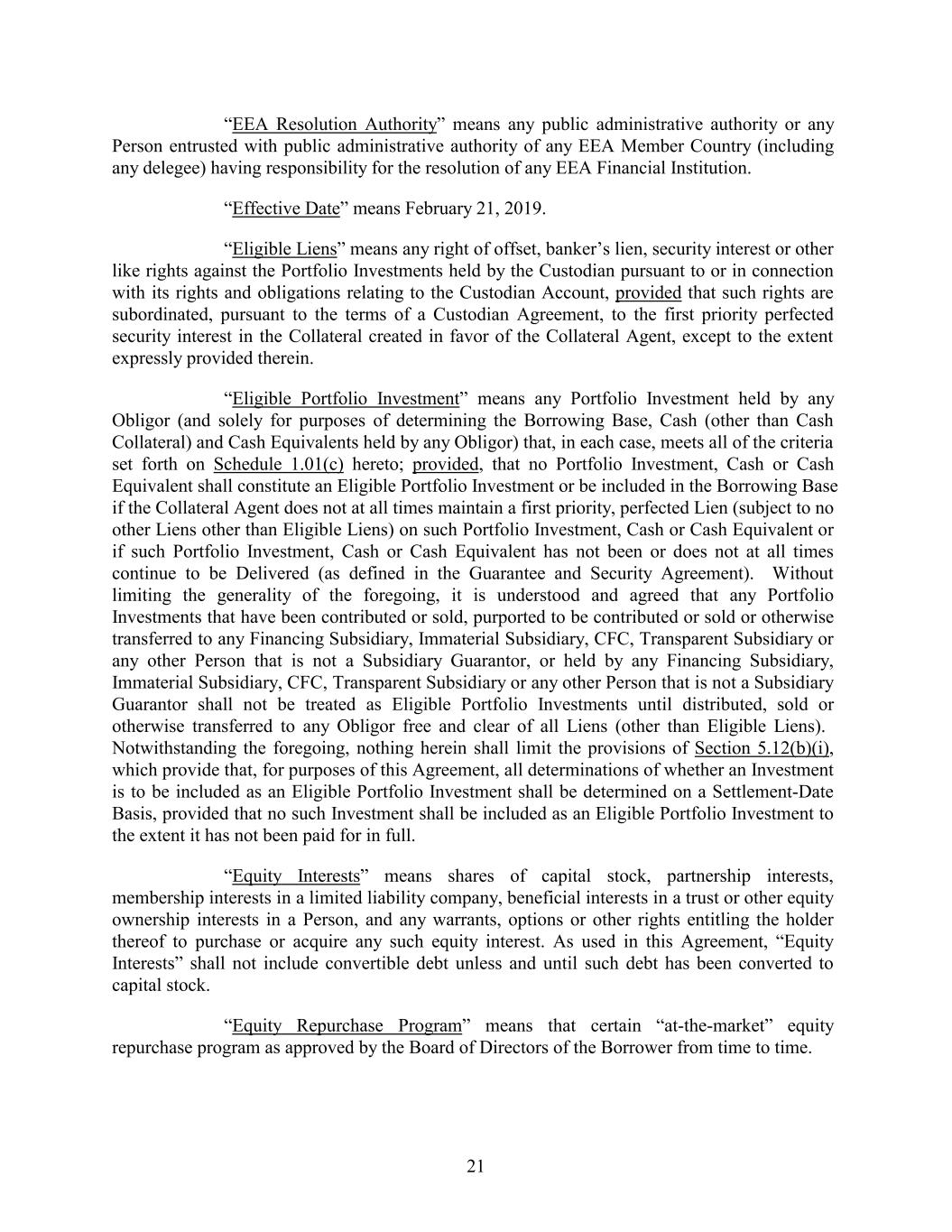 duplication, the following to the extent deducted in calculating such consolidated net income in the relevant agreement relating to the applicable Eligible Portfolio Investment for such period: (i) consolidated interest charges for such period, (ii) the provision for Federal, state, local and foreign income taxes payable for such period, (iii) depreciation and amortization expense for such period, and (iv) such other adjustments included in the definition of “EBITDA” (or similar defined term used for the purposes contemplated herein) in the relevant agreement relating to the applicable Eligible Portfolio Investment, provided that such adjustments are usual and customary and substantially comparable to market terms for substantially similar debt of other similarly situated borrowers at the time such relevant agreements are entered into as reasonably determined in good faith by the Borrower. “Eligible Liens” has the meaning assigned to such term in Section 1.01 of this Agreement. “Eligible Portfolio Investment” has the meaning assigned to such term in Section 1.01 of this Agreement. “First Lien Bank Loan” means a Bank Loan that is entitled to the benefit of a first lien and first priority perfected security interest on all or substantially all of the assets of the respective borrower and guarantors obligated in respect thereof, and which has the most senior pre-petition priority in any bankruptcy, reorganization, arrangement, insolvency, or liquidation proceedings; provided, however, that, in the case of accounts receivable and inventory (and the proceeds thereof), such lien and security interest may be second in priority to a Permitted Prior Working Capital Lien; and further provided that any portion of such a Bank Loan (other than a Broadly Syndicated Loan) which has a total debt to EBITDA ratio above 4.50 to 1.00 will, in each case, have the advance rates of a Second Lien Bank Loan applied to such portion and such portion of such Bank Loan which has a total debt to EBITDA ratio above 6.00 to 1.00 will, in each case, have the advance rates of a Mezzanine Investment applied to such portion. For the avoidance of doubt, in no event shall a First Lien Bank Loan include a Last Out Loan. “High Yield Securities” means debt Securities, in each case (a) issued by public or private issuers, (b) issued pursuant to an effective registration statement or pursuant to Rule 144A under the Securities Act (or any successor provision thereunder) and (c) that are not Cash Equivalents, Mezzanine Investments (described under clause (i) of the definition thereof) or Bank Loans. “Last Out Loan” means, with respect to any loan that would otherwise qualify as a First Lien Bank Loan but is a term loan structured in a first out tranche and a last out tranche (with the first out tranche entitled to a lower interest rate but priority with respect to payments), that portion of such Bank Loan that is the last out tranche; provided that: (a) such last out tranche is entitled (along with the first out tranche) to the benefit of a first lien and first priority perfected security interest on all or substantially all of the assets of the respective borrower and guarantors obligated in respect thereof (subject to customary exceptions), and which has the most senior pre-petition priority in any bankruptcy, reorganization, arrangement, insolvency, or liquidation proceedings (taking into account the 130