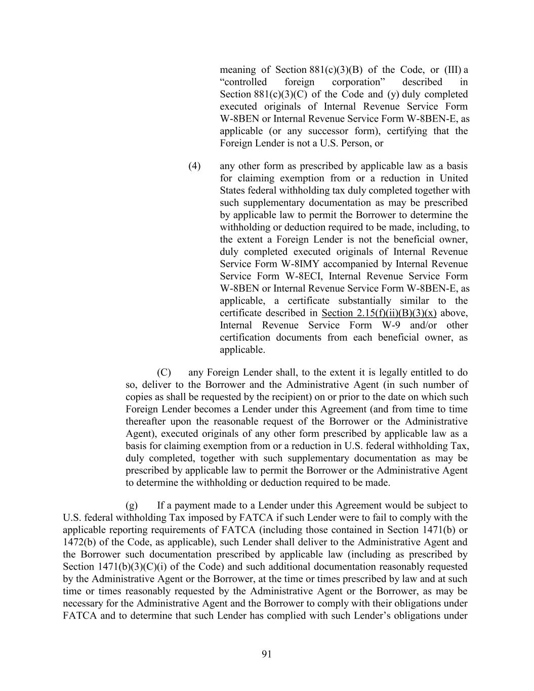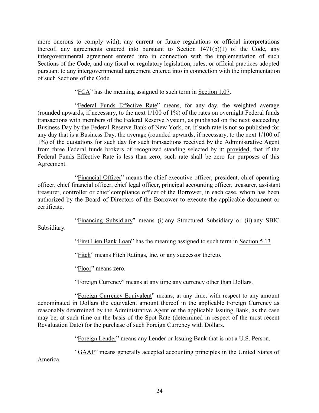 QFC may in fact be stated to be governed by the laws of the State of New York and/or of the United States or any other state of the United States) (a) In the event a Covered Entity that is party to a Supported QFC (each, a “Covered Party”) becomes subject to a proceeding under a U.S. Special Resolution Regime, the transfer of such Supported QFC and the benefit of such QFC Credit Support (and any interest and obligation in or under such Supported QFC and such QFC Credit Support, and any rights in property securing such Supported QFC or such QFC Credit Support) from such Covered Party will be effective to the same extent as the transfer would be effective under the U.S. Special Resolution Regime if the Supported QFC and such QFC Credit Support (and any such interest, obligation and rights in property) were governed by the laws of the United States or a state of the United States. In the event a Covered Party or a BHC Act Affiliate of a Covered Party becomes subject to a proceeding under a U.S. Special Resolution Regime, Default Rights under the Loan Documents that might otherwise apply to such Supported QFC or any QFC Credit Support that may be exercised against such Covered Party are permitted to be exercised to no greater extent than such Default Rights could be exercised under the U.S. Special Resolution Regime if the Supported QFC and the Loan Documents were governed by the laws of the United States or a state of the United States. Without limitation of the foregoing, it is understood and agreed that rights and remedies of the parties with respect to a Defaulting Lender shall in no event affect the rights of any Covered Party with respect to a Supported QFC or any QFC Credit Support. (b) As used in this Section 9.18, the following terms have the following meanings: (i) “BHC Act Affiliate” of a party means an “affiliate” (as such term is defined under, and interpreted in accordance with, 12 U.S.C. § 1841(k)) of such party. (ii) “Covered Entity” means any of the following: (A) a “covered entity” as that term is defined in, and interpreted in accordance with, 12 C.F.R.§ 252.82(b); (B) a “covered bank” as that term is defined in, and interpreted in accordance with, 12 C.F.R.§ 47.3(b); or (C) a “covered FSI” as that term is defined in, and interpreted in accordance with, 12 C.F.R.§ 382.2(b). (iii) “Default Right” has the meaning assigned to that term in, and shall be interpreted in accordance with, §§ 12 C.F.R.§ 252.82(b), 47.2 or 382.1, as applicable. (iv) “QFC” has the meaning assigned to the term “qualified financial contract” in, and shall be interpreted in accordance with, 12 U.S.C. § 5390(c)(8)(D). [Remainder of Page Intentionally Left Blank] 179
