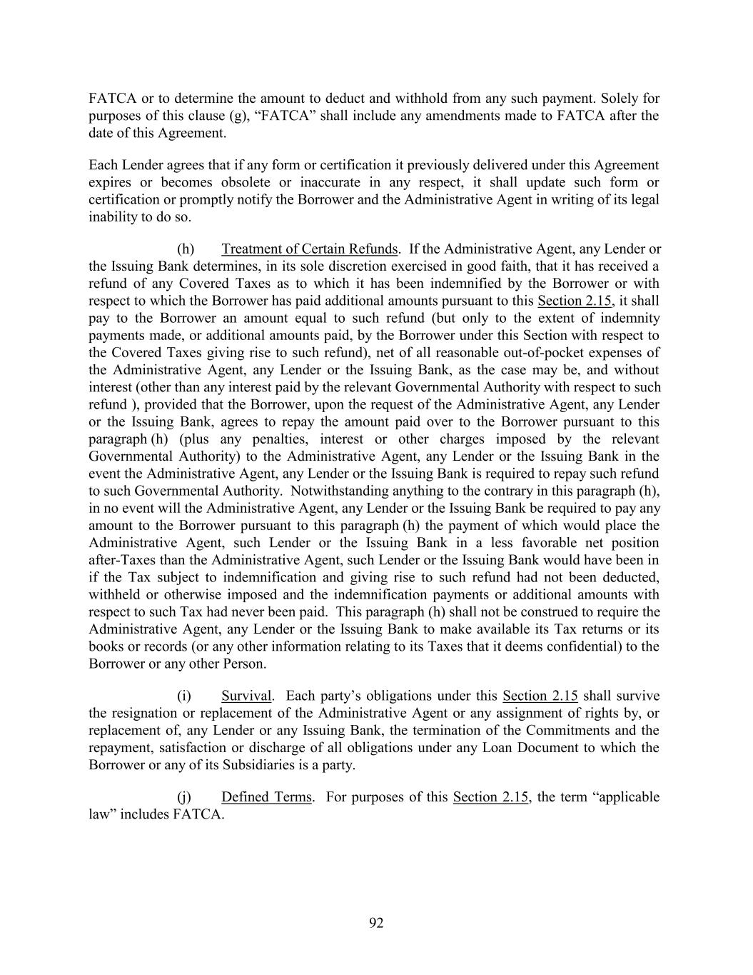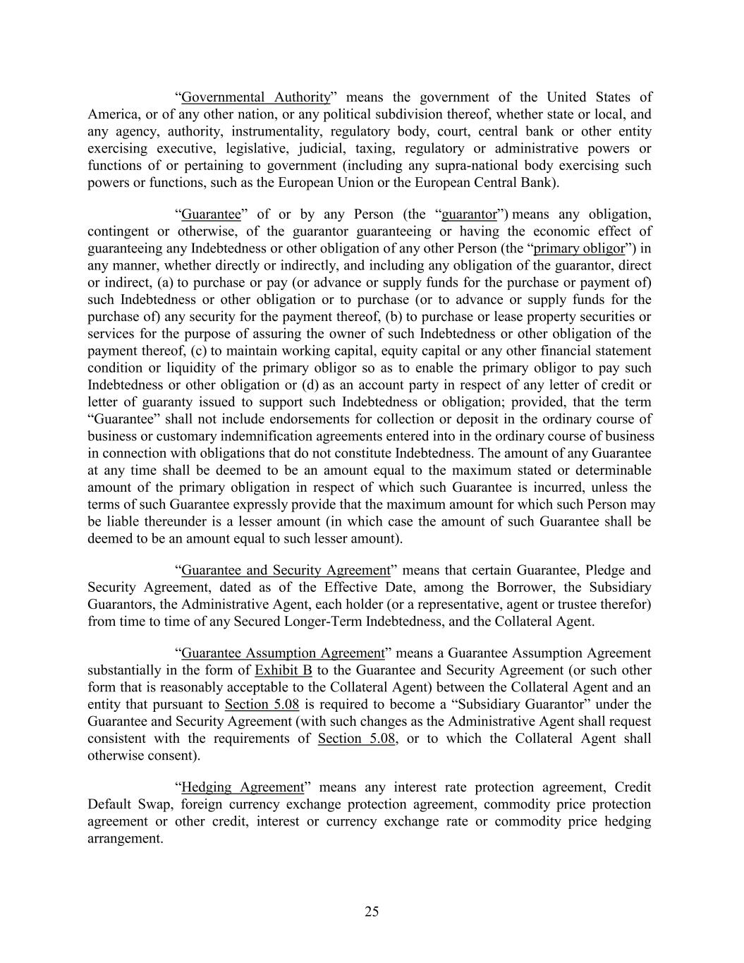 demanding the deposit of Cash Collateral pursuant to this paragraph, the Borrower shall immediately Cash Collateralize such LC Exposure plus any accrued and unpaid interest thereon; provided that the obligation to Cash Collateralize such LC Exposure shall become effective immediately, and such deposit shall become immediately due and payable, without demand or other notice of any kind, upon the occurrence of any Event of Default described in clause (h), (i) or (j) of this Article. ARTICLE VIII. THE ADMINISTRATIVE AGENT SECTION 8.01 Appointment. (a) Appointment of the Administrative Agent. Each of the Lenders and the Issuing Bank hereby irrevocably appoints the Administrative Agent as its agent hereunder and under the other Loan Documents and authorizes the Administrative Agent to take such actions on its behalf and to exercise such powers as are delegated to the Administrative Agent by the terms hereof or thereof, together with such actions and powers as are reasonably incidental thereto. (b) Appointment of the Collateral Agent. Each of the Lenders and the Issuing Bank hereby irrevocably appoints the Collateral Agent as its collateral agent hereunder and under the other Loan Documents and authorizes the Collateral Agent to have all the rights and benefits hereunder and thereunder (including Section 9 of the Guarantee and Security Agreement), and to take such actions on its behalf and to exercise such powers as are delegated to the Collateral Agent by the terms hereof or thereof, together with such actions and powers as are reasonably incidental thereto. In addition to the rights, privileges and immunities in the Guarantee and Security Agreement, the Collateral Agent shall be entitled to all rights, privileges, immunities, exculpations and indemnities of the Administrative Agent for such purpose and each reference to the Administrative Agent in this Article VIII shall be deemed to include the Collateral Agent. SECTION 8.02 Capacity as Lender. The Person serving as the Administrative Agent hereunder shall have the same rights and powers in its capacity as a Lender as any other Lender and may exercise the same as though it were not the Administrative Agent, and such Person and its Affiliates may (without having to account therefor to any other Lender) accept deposits from, lend money to, make investments in and generally engage in any kind of business with the Borrower or any Subsidiary or other Affiliate thereof as if it were not the Administrative Agent hereunder, and such Person and its Affiliates may accept fees and other consideration from the Borrower or any Subsidiary or other Affiliate thereof for services in connection with this Agreement or otherwise without having to account for the same to the other Lenders. SECTION 8.03 Limitation of Duties; Exculpation. The Administrative Agent shall not have any duties or obligations except those expressly set forth herein and in the other Loan Documents. Without limiting the generality of the foregoing, (a) the Administrative Agent shall not be subject to any fiduciary or other implied duties, regardless of whether a Default or Event of Default has occurred and is continuing, (b) the Administrative Agent shall not have any duty to take any discretionary action or exercise any discretionary powers, except discretionary 150