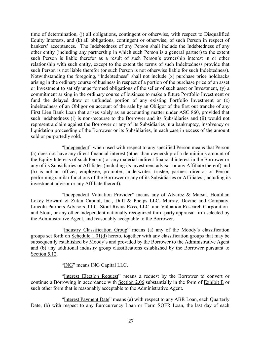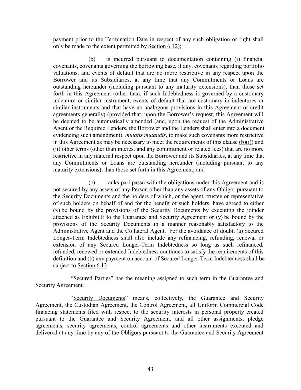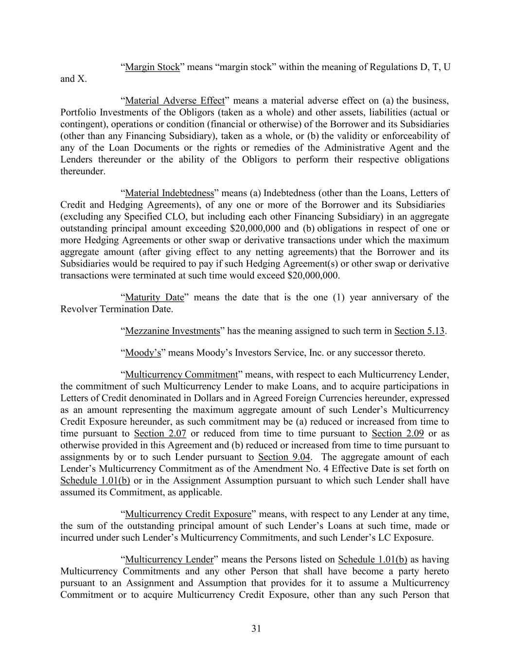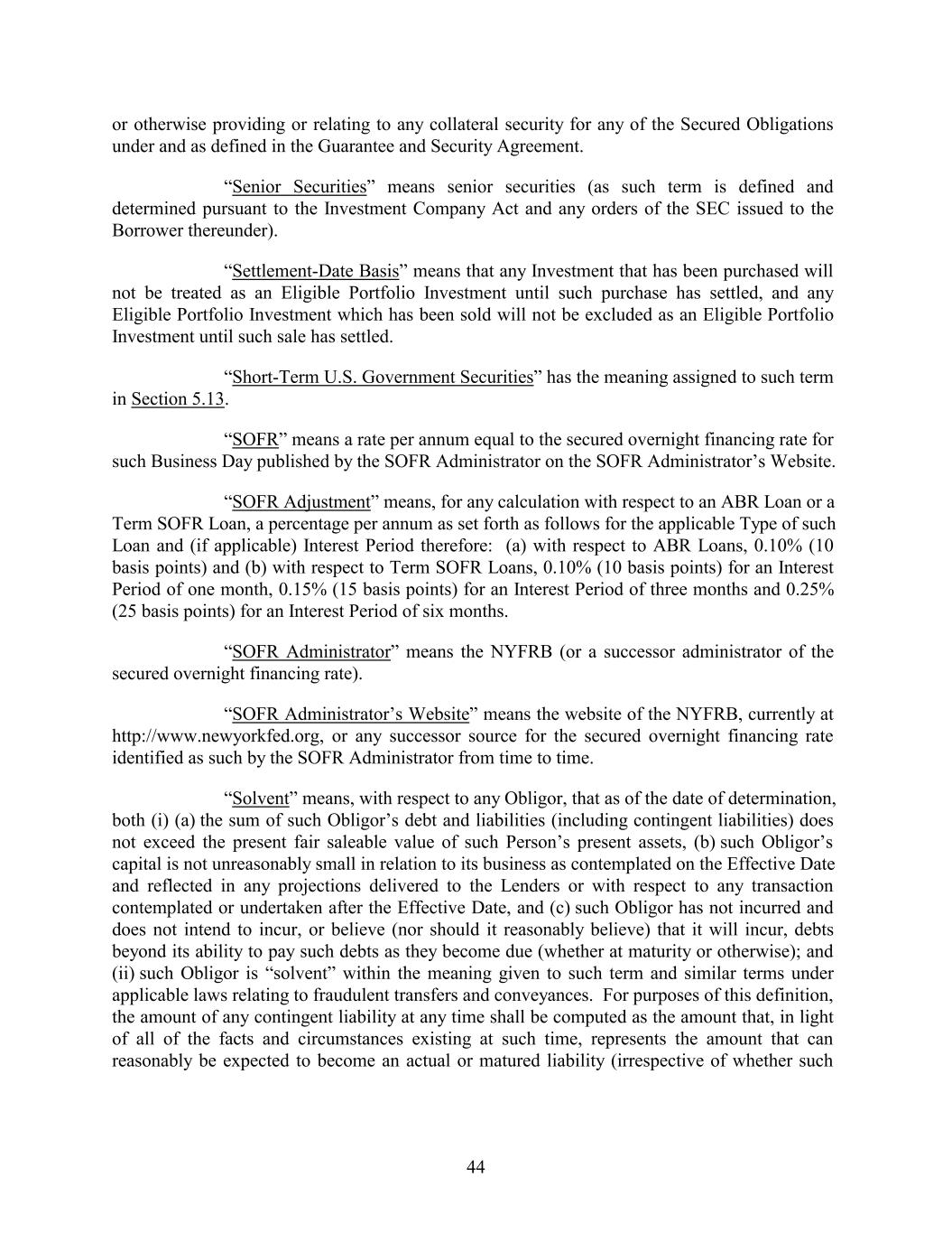 new facility and does not otherwise meet the conditions of the definition of Restructured Investment. “Second Lien Bank Loan” means a Bank Loan (other than a First Lien Bank Loan and a Last Out Loan) that is entitled to the benefit of a first and/or second lien and first and/or second priority perfected security interest on all or substantially all of the assets of the respective borrower and guarantors obligated in respect thereof; and provided further that any portion of such Bank Loan which has a total debt to EBITDA ratio above 6.00x will, in each case, have the advance rates of a Mezzanine Investment applied to such portion. “Securities” means common and preferred stock, units and participations, member interests in limited liability companies, partnership interests in partnerships, notes, bonds, debentures, trust receipts and other obligations, instruments or evidences of indebtedness, including debt instruments of public and private issuers and tax-exempt securities (including warrants, rights, put and call options and other options relating thereto, representing rights, or any combination thereof) and other property or interests commonly regarded as securities or any form of interest or participation therein, but not including Bank Loans. “Securities Act” means the United States Securities Act of 1933, as amended. “Short-Term U.S. Government Securities” means U.S. Government Securities maturing within three months of the applicable date of determination. “Structured Finance Obligation” means any obligation issued by a special purpose vehicle (or any similar obligor in the principal business of offering, originating or financing pools of receivables or other financial assets) and secured directly by, referenced to, or representing ownership of or investment in, a pool of receivables or other financial assets of any obligor, including collateralized loan obligations, collateralized debt obligations and mortgage-backed securities, or any finance lease. For the avoidance of doubt, if an obligation satisfies this definition of “Structured Finance Obligation”, such obligation (a) shall not qualify as any other category of Portfolio Investment and (b) shall not be included in the Borrowing Base. “Third Party Finance Company” means a Person that is (i) an operating company with employees, officers and directors and (ii) in the primary business of originating loans or factoring or financing receivables, inventory or other current assets. “Transferable” means: (i) the applicable Obligor may create a security interest in or pledge all of its rights under and interest in such Portfolio Investment to secure its obligations under this Agreement or any other Loan Document, and that such pledge or security interest may be enforced in any manner permitted under applicable law; and (ii) such Portfolio Investment (and all documents related thereto) contains no provision that directly or indirectly restricts the assignment of such Obligor’s, or any assignee of such Obligor’s, rights under such Portfolio Investment (including any requirement that the Borrower maintain a minimum ownership percentage of such Portfolio Investment); provided that, such Portfolio Investment may contain the following restrictions on customary and market based terms: (a) restrictions pursuant to which assignments may be subject to the consent of the obligor or issuer or agent under the 134