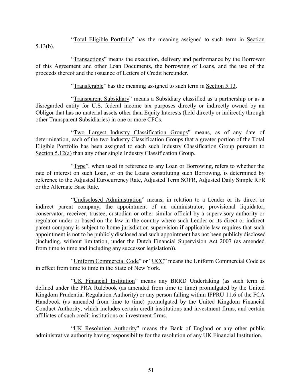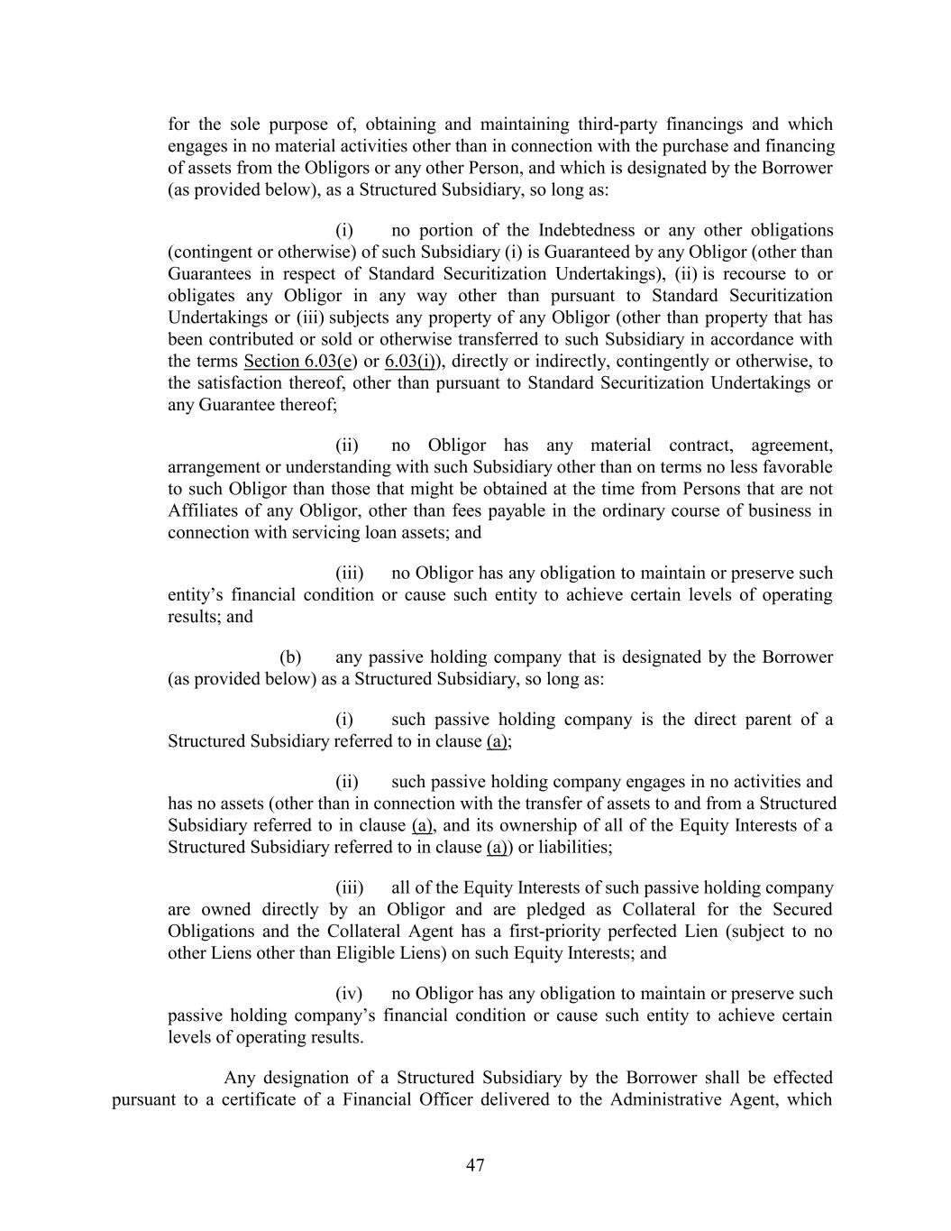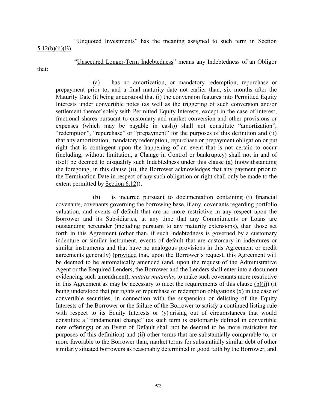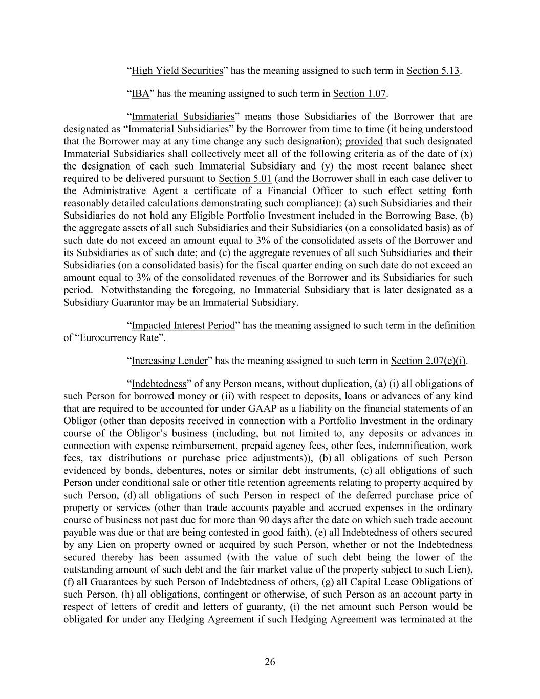 new facility and does not otherwise meet the conditions of the definition of Restructured Investment. “Second Lien Bank Loan” means a Bank Loan (other than a First Lien Bank Loan and a Last Out Loan) that is entitled to the benefit of a first and/or second lien and first and/or second priority perfected security interest on all or substantially all of the assets of the respective borrower and guarantors obligated in respect thereof; and provided further that any portion of such Bank Loan which has a total debt to EBITDA ratio above 6.00x will, in each case, have the advance rates of a Mezzanine Investment applied to such portion. “Securities” means common and preferred stock, units and participations, member interests in limited liability companies, partnership interests in partnerships, notes, bonds, debentures, trust receipts and other obligations, instruments or evidences of indebtedness, including debt instruments of public and private issuers and tax-exempt securities (including warrants, rights, put and call options and other options relating thereto, representing rights, or any combination thereof) and other property or interests commonly regarded as securities or any form of interest or participation therein, but not including Bank Loans. “Securities Act” means the United States Securities Act of 1933, as amended. “Short-Term U.S. Government Securities” means U.S. Government Securities maturing within three months of the applicable date of determination. “Structured Finance Obligation” means any obligation issued by a special purpose vehicle (or any similar obligor in the principal business of offering, originating or financing pools of receivables or other financial assets) and secured directly by, referenced to, or representing ownership of or investment in, a pool of receivables or other financial assets of any obligor, including collateralized loan obligations, collateralized debt obligations and mortgage-backed securities, or any finance lease. For the avoidance of doubt, if an obligation satisfies this definition of “Structured Finance Obligation”, such obligation (a) shall not qualify as any other category of Portfolio Investment and (b) shall not be included in the Borrowing Base. “Third Party Finance Company” means a Person that is (i) an operating company with employees, officers and directors and (ii) in the primary business of originating loans or factoring or financing receivables, inventory or other current assets. “Transferable” means: (i) the applicable Obligor may create a security interest in or pledge all of its rights under and interest in such Portfolio Investment to secure its obligations under this Agreement or any other Loan Document, and that such pledge or security interest may be enforced in any manner permitted under applicable law; and (ii) such Portfolio Investment (and all documents related thereto) contains no provision that directly or indirectly restricts the assignment of such Obligor’s, or any assignee of such Obligor’s, rights under such Portfolio Investment (including any requirement that the Borrower maintain a minimum ownership percentage of such Portfolio Investment); provided that, such Portfolio Investment may contain the following restrictions on customary and market based terms: (a) restrictions pursuant to which assignments may be subject to the consent of the obligor or issuer or agent under the 134