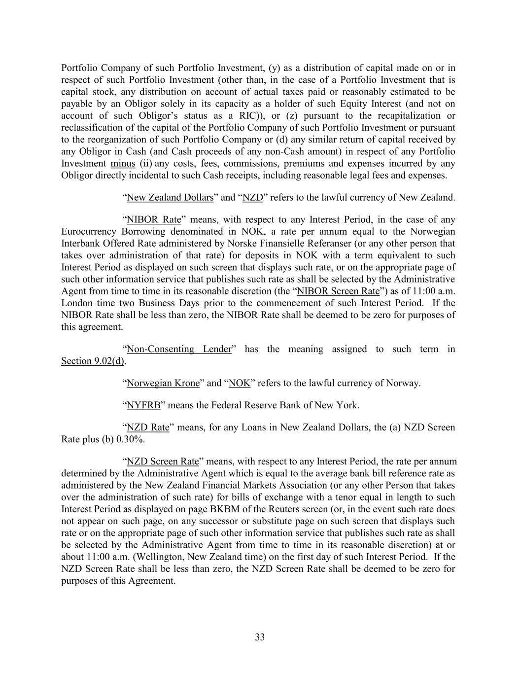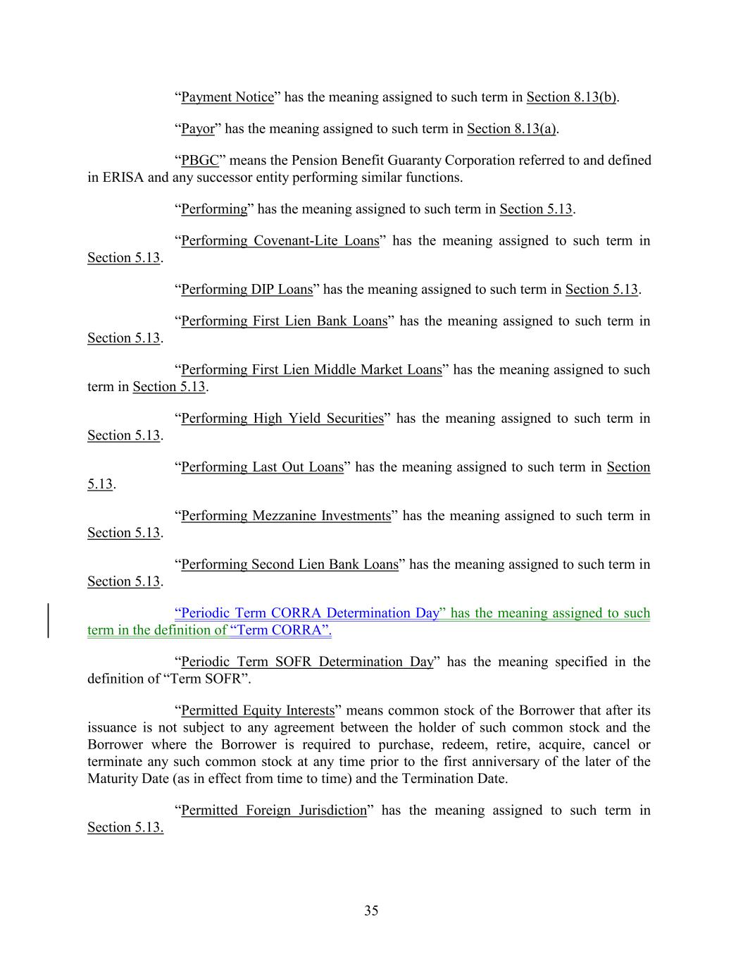 Loans, does not represent debt or Capital Stock of an issuer that has issued any Defaulted Obligation and (iii) is not on non-accrual (provided that for this clause (iii), any Eligible Portfolio Investment that is on “PIK non-accrual” may continue to be Performing for so long as such Eligible Portfolio Investment is not a PIK Obligation). “Performing Covenant-Lite Loans” means funded Covenant-Lite Loans that (a) are not PIK Obligations and (b) are Performing. “Performing DIP Loans” means funded DIP Loans that (a) are not PIK Obligations and (b) are not Defaulted Obligations. “Performing First Lien Bank Loans” means funded First Lien Bank Loans that (a) are not PIK Obligations, DIP Loans or Covenant-Lite Loans and (b) are Performing. “Performing First Lien Middle Market Loans” means funded First Lien Bank Loans to a Portfolio Company with trailing 12 month EBITDA of less than $15,000,000 that (a) are not PIK Obligations, DIP Loans, Covenant-Lite Loans, Last Out Loans or Second Lien Bank Loans and (b) are Performing. “Performing High Yield Securities” means funded High Yield Securities that (a) are not PIK Obligations or DIP Loans and (b) are Performing. “Performing Last Out Loans” means funded Last Out Loans that (a) are not PIK Obligations, DIP Loans or Covenant-Lite Loans and (b) are Performing. “Performing Mezzanine Investments” means funded Mezzanine Investments that (a) are not PIK Obligations, DIP Loans or Covenant-Lite Loans and (b) are Performing. “Performing PIK Obligations” means PIK Obligations that (a) are not DIP Loans and (b) are Performing. “Performing Second Lien Bank Loans” means Second Lien Bank Loans that (a) are not PIK Obligations, DIP Loans, Covenant-Lite Loans or Last Out Loans and (b) are Performing. “Permitted Foreign Jurisdiction” means Canada, Belgium, France, Germany, Ireland, Luxembourg, the Netherlands, Australia, New Zealand, Denmark, Norway, Sweden and Switzerland and the United Kingdom. “Permitted Foreign Jurisdiction Portfolio Investment” means any Portfolio Investment that meets the eligibility criteria under paragraph (8) of Schedule 1.01(c) by reference to a Permitted Foreign Jurisdiction. “Permitted Prior Working Capital Lien” means, with respect to a Portfolio Company that is a borrower under a Bank Loan, a security interest to secure a working capital facility for such Portfolio Company in the accounts receivable and/or inventory (and all related property and all proceeds thereof) of such Portfolio Company and any of its subsidiaries that are 132