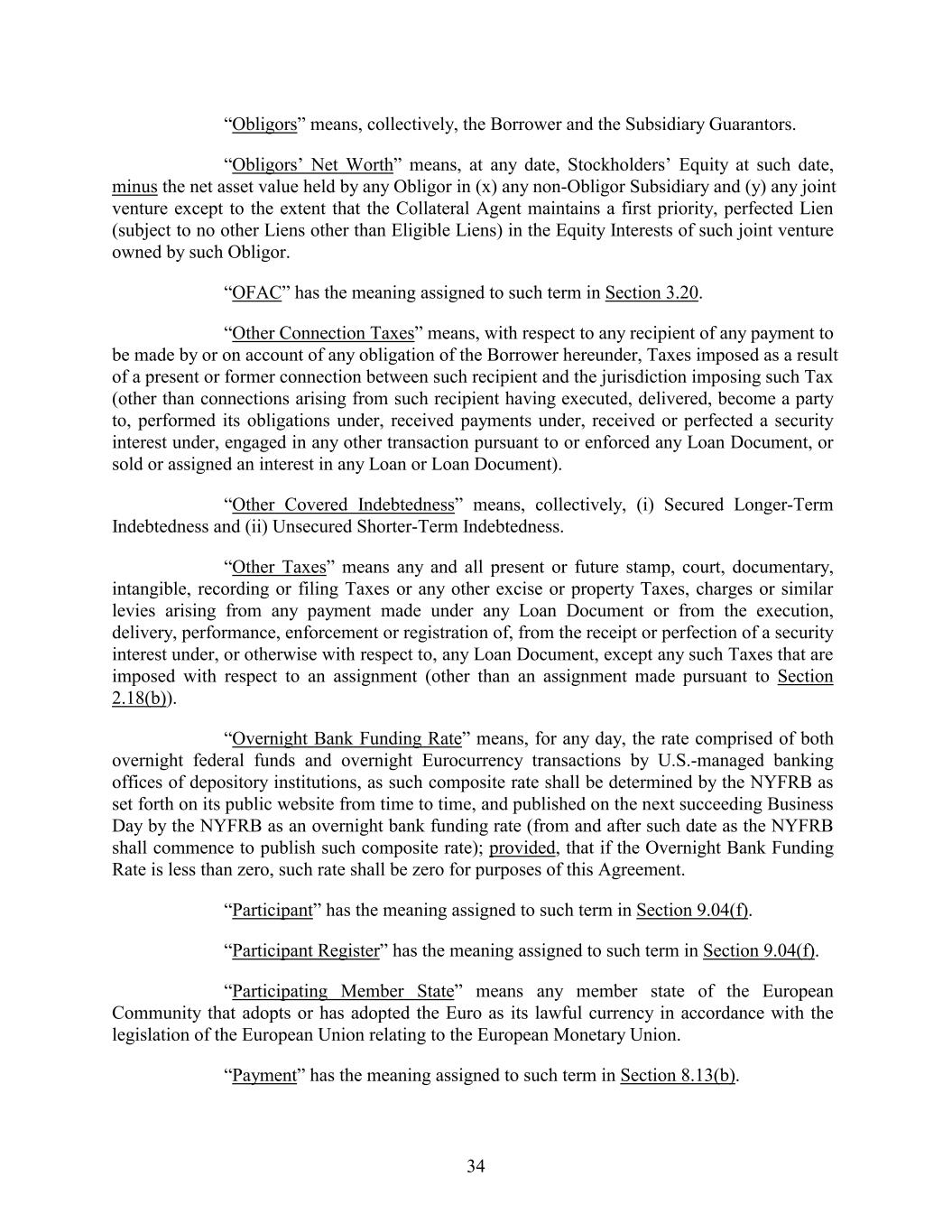 Administrative Agent the amount of any such Payment (or portion thereof) as to which such a demand was made in same day funds, together with interest thereon in respect of each day from and including the date such Payment (or portion thereof) was received by such Lender to the date such amount is repaid to the Administrative Agent at the greater of the Federal Funds Effective Rate and a rate determined by the Administrative Agent in accordance with banking industry rules on interbank compensation from time to time in effect, and (y) to the extent permitted by applicable law, such Lender shall not assert, and hereby waives, as to the Administrative Agent, any claim, counterclaim, defense or right of set-off or recoupment with respect to any demand, claim or counterclaim by the Administrative Agent for the return of any Payments received, including without limitation any defense based on “discharge for value” or any similar doctrine. A notice of the Administrative Agent to any Lender under this Section 8.13(b) shall be conclusive, absent manifest error. (ii) Each Lender hereby further agrees that if it receives a Payment from the Administrative Agent or any of its Affiliates (x) that is in a different amount than, or on a different date from, that specified in a notice of payment sent by the Administrative Agent (or any of its Affiliates) with respect to such Payment (a “Payment Notice”) or (y) that was not preceded or accompanied by a Payment Notice, it shall be on notice, in each such case, that an error has been made with respect to such Payment. Each Lender agrees that, in each such case, or if it otherwise becomes aware a Payment (or portion thereof) may have been sent in error, such Lender shall promptly notify the Administrative Agent of such occurrence and, upon demand from the Administrative Agent, it shall promptly, but in no event later than one Business Day thereafter, return to the Administrative Agent the amount of any such Payment (or portion thereof) as to which such a demand was made in same day funds, together with interest thereon in respect of each day from and including the date such Payment (or portion thereof) was received by such Lender to the date such amount is repaid to the Administrative Agent at the greater of the Federal Funds Effective Rate and a rate determined by the Administrative Agent in accordance with banking industry rules on interbank compensation from time to time in effect. (iii) The Borrower hereby agrees that (x) in the event an erroneous Payment (or portion thereof) is not recovered from any Lender that has received such Payment (or portion thereof) for any reason, the Administrative Agent shall be subrogated to all the rights of such Lender with respect to such amount and (y) an erroneous Payment shall not pay, prepay, repay, discharge or otherwise satisfy any Obligations owed by the Borrower, except, in each case, to the extent such erroneous Payment is, and solely with respect to the amount of such erroneous Payment that is, comprised of funds received by the Administrative Agent from the Borrower for the purpose of making such erroneous Payment. (iv) Each party’s obligations under this Section 8.13 shall survive the resignation or replacement of the Administrative Agent or any transfer of rights or obligations by, or the replacement of, a Lender, the termination of the Commitments or the repayment, satisfaction or discharge of all obligations of the Obligors under any Loan Document. 157