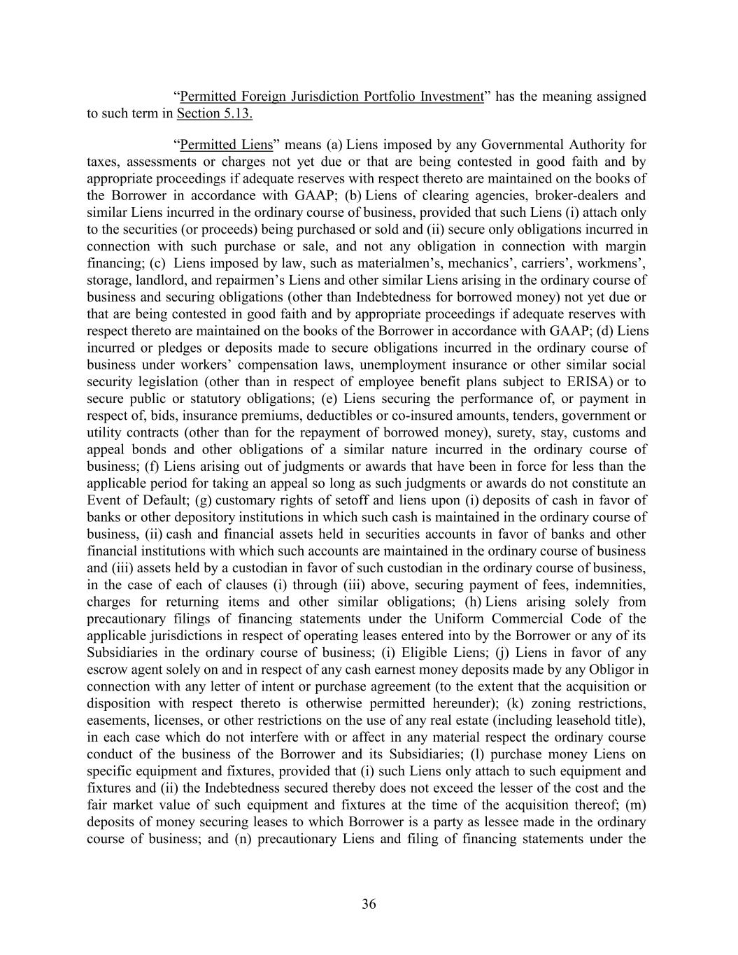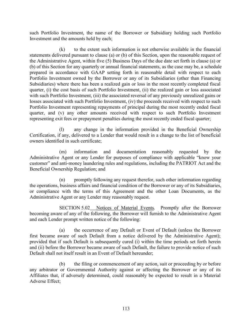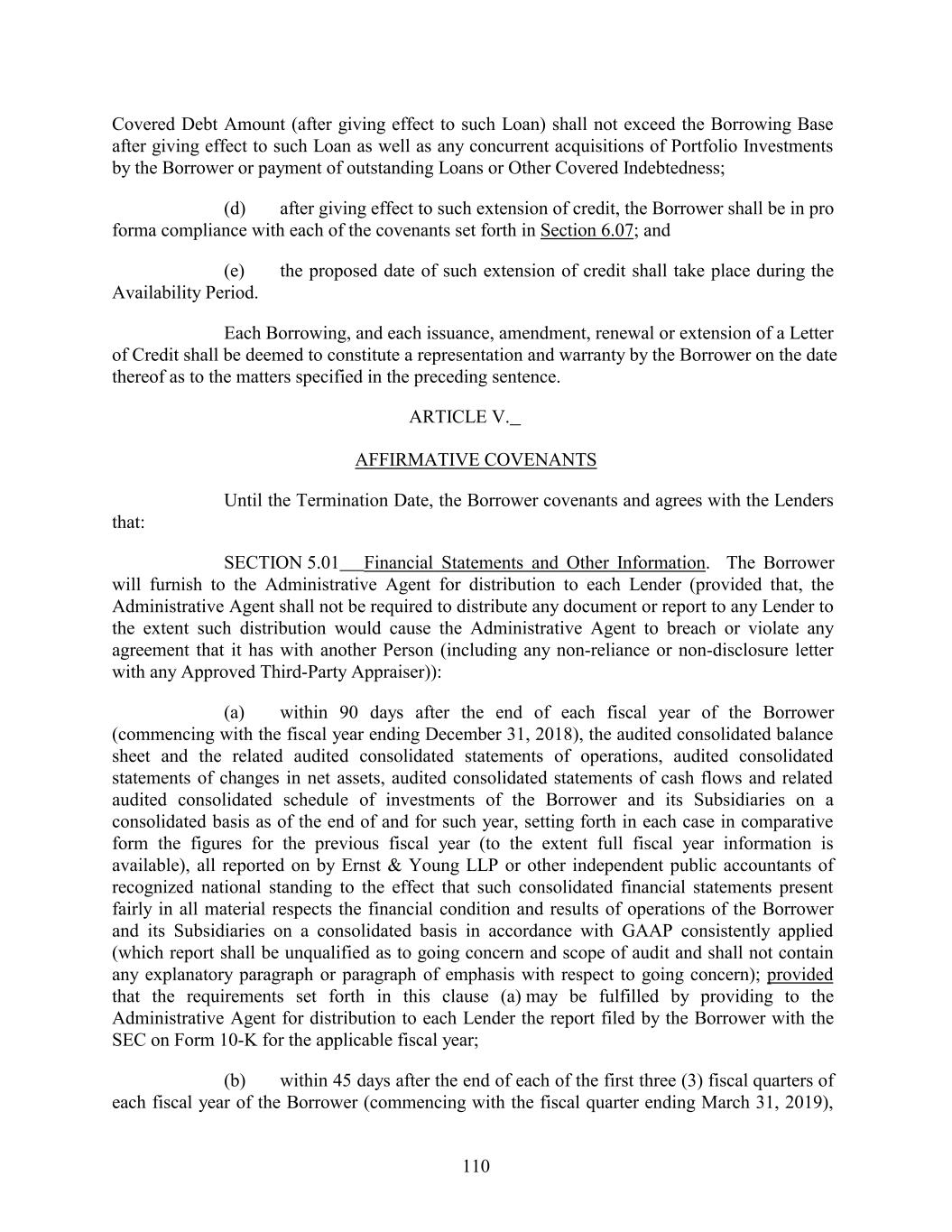 Portfolio Investment so long as the applicable provision also provides that such consent may not be unreasonably withheld, (b) customary restrictions in respect of minimum assignment amounts, (c) restrictions on transfer to parties that are not ‘eligible assignees’ within the customary and market based meaning of the term, and (d) restrictions on transfer to the applicable obligor or issuer under the Portfolio Investment or its equity holders or financial sponsor entities or competitors or, in each case, their affiliates; provided, further, that in the event that an Obligor is a party to an intercreditor arrangement with other lenders thereof with payment rights or lien priorities that are junior or senior to the rights of such Obligor, such Portfolio Investment may be subject to customary and market based rights of first refusal, rights of first offer and purchase rights in favor, in each case, of such other lenders thereof (so long as the Value used in determining the Borrowing Base is not greater than the amount of such right of first refusal, first offer or purchase rights). “U.S. Government Securities” has the meaning assigned to such term in Section 1.01 of this Agreement. “Value” means, with respect to any Eligible Portfolio Investment, the value thereof determined for purposes of this Agreement in accordance with Section 5.12(b)(ii) or 5.12(b)(iii), as applicable. SECTION 5.14 Taxes. Each of the Borrower and its Subsidiaries will timely file or cause to be timely filed all material Tax returns that are required to be filed by it and will pay all Taxes for which it is directly or indirectly liable and any assessments made against it or any of its property and all other Taxes, fees or other charges imposed on it or any of its property by any Governmental Authority, except Taxes that are being contested in good faith by appropriate proceedings, and with respect to which reserves in conformity with GAAP are provided on the books of the Borrower or its Subsidiaries, as the case may be. The charges, accruals and reserves on the books of the Borrower and any of its Subsidiaries in respect of Taxes and other governmental charges will be adequate in accordance with GAAP. SECTION 5.15 Post-Closing Matters. Notwithstanding anything to the contrary contained herein, within thirty (30) days (or such longer period as may be agreed by the Administrative Agent in its sole discretion), the Borrower shall deliver an executed control agreement in form and substance reasonably satisfactory to the Administrative Agent in respect of the Borrower’s account #7000009618 held at State Street Global Markets, LLC; provided that, for the avoidance of doubt, assets in such account shall not be included in the Borrowing Base prior to delivery of such control agreement. ARTICLE VI. NEGATIVE COVENANTS Until the Termination Date, the Borrower covenants and agrees with the Lenders that: 135