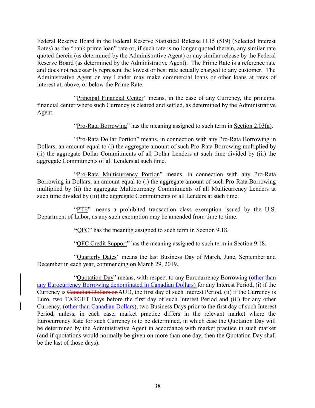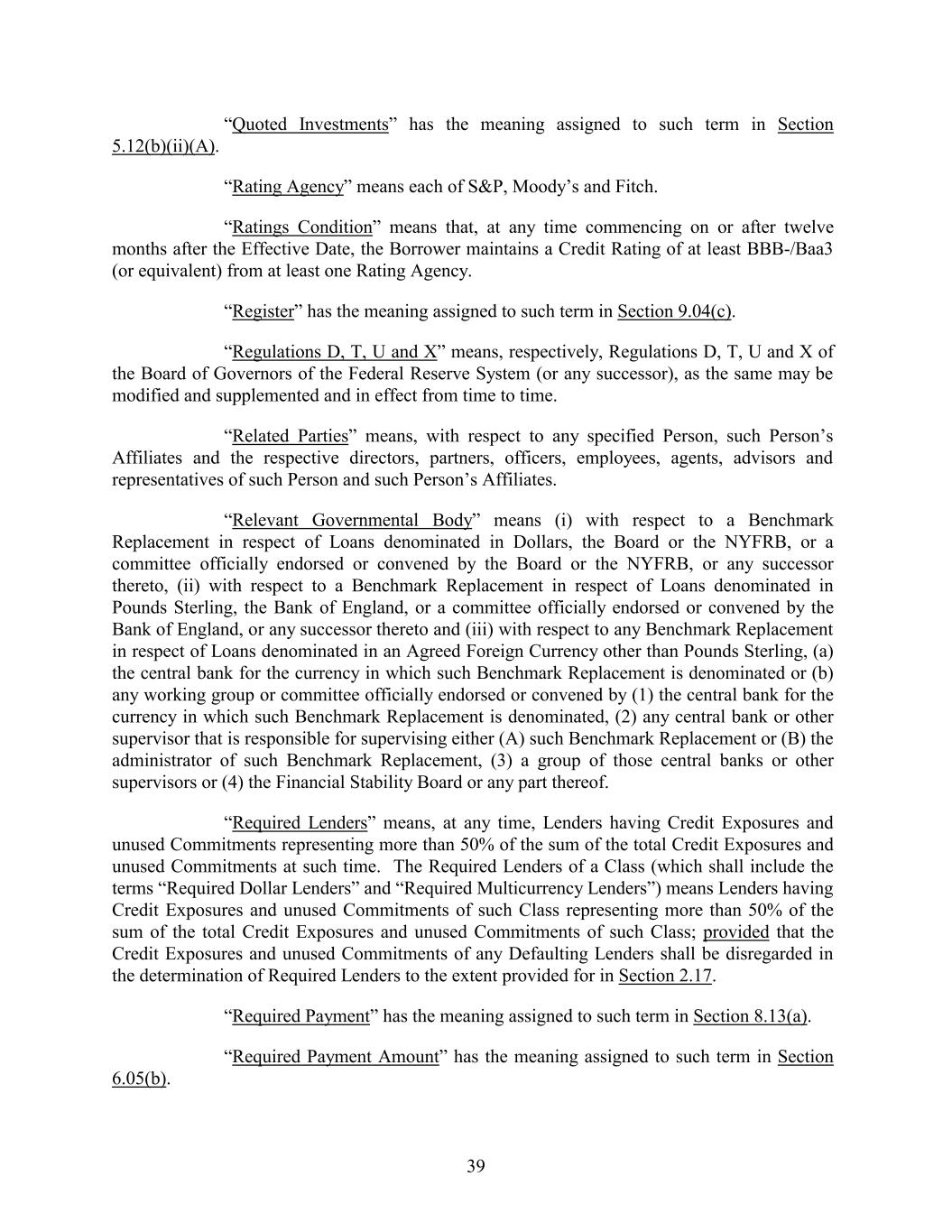 terminate all or substantially all of the Liens under any Security Document providing for collateral security, agree to additional obligations being secured by all or substantially all of such collateral security, or alter the relative priorities of the obligations entitled to the benefits of the Liens created under the Security Documents with respect to all or substantially all of the Collateral, except that no such consent shall be required, and the Administrative Agent is hereby authorized, to release any Lien covering property that is the subject of either (x) a disposition of property permitted hereunder (which release described in this clause (x) shall be automatic and require no further action from any party) or (y) a disposition to which the Required Lenders have consented. SECTION 8.09 Certain ERISA Matters. (a) Each Lender (x) represents and warrants, as of the date such Person became a Lender party hereto, to, and (y) covenants, from the date such Person became a Lender party hereto to the date such Person ceases being a Lender party hereto, for the benefit of, the Administrative Agent, each Joint Lead Arranger, and their respective Affiliates, and not, for the avoidance of doubt, to or for the benefit of the Borrower or any other Obligor, that at least one of the following is and will be true: (i) such Lender is not using “plan assets” (within the meaning of Section 3(42) of ERISA or otherwise) of one or more Benefit Plans with respect to such Lender’s entrance into, participation in, administration of and performance of the Loans, the Letters of Credit, the Commitments or this Agreement; (ii) the transaction exemption set forth in one or more PTEs, such as PTE 84-14 (a class exemption for certain transactions determined by independent qualified professional asset managers), PTE 95-60 (a class exemption for certain transactions involving insurance company general accounts), PTE 90-1 (a class exemption for certain transactions involving insurance company pooled separate accounts), PTE 91-38 (a class exemption for certain transactions involving bank collective investment funds) or PTE 96-23 (a class exemption for certain transactions determined by in-house asset managers), is applicable with respect to, and covers, such Lender’s entrance into, participation in, administration of and performance of the Loans, the Letters of Credit, the Commitments and this Agreement; (iii) (A) such Lender is an investment fund managed by a “Qualified Professional Asset Manager” (within the meaning of Part VI of PTE 84-14), (B) such Qualified Professional Asset Manager made the investment decision on behalf of such Lender to enter into, participate in, administer and perform the Loans, the Letters of Credit, the Commitments and this Agreement, (C) the entrance into, participation in, administration of and performance of the Loans, the Letters of Credit, the Commitments and this Agreement satisfies the requirements of sub-sections (b) through (g) of Part I of PTE 84-14 and (D) to the best knowledge of such Lender, the requirements of subsection (a) of Part I of PTE 84-14 are satisfied with respect to such Lender’s entrance into, participation in, administration of and performance of the Loans, the Letters of Credit, the Commitments and this Agreement; or 153