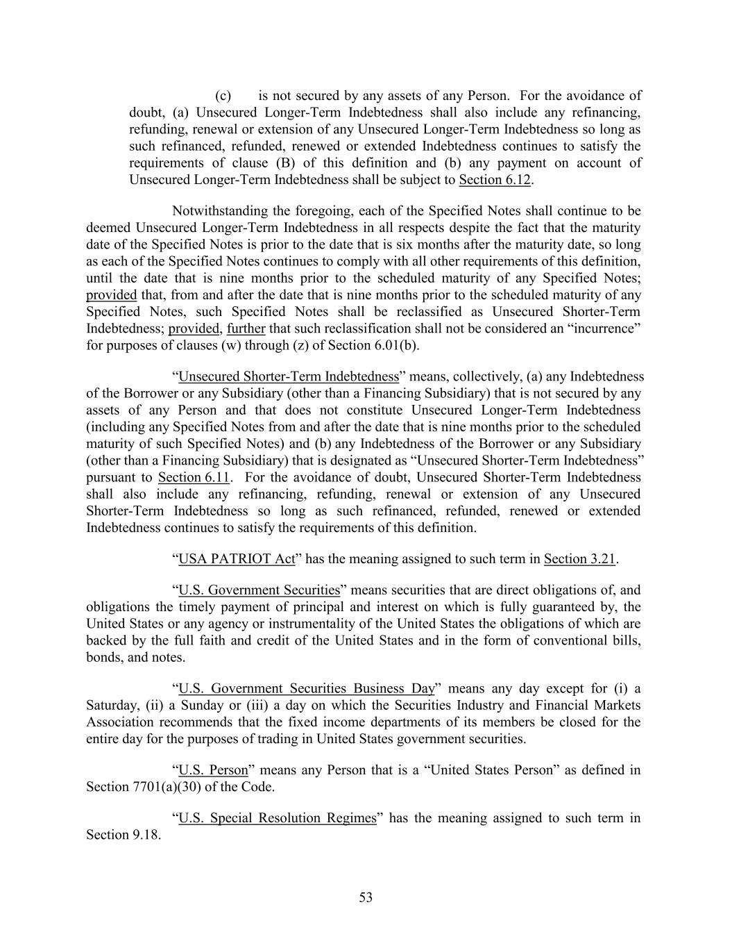 not require the direct or indirect granting of any Lien securing any Indebtedness or other obligation by virtue of the granting of Liens on or pledge of property of any Obligor to secure the Loans or any Hedging Agreement. SECTION 6.11 Modifications of Indebtedness and Affiliate Agreements. The Borrower will not, and will not permit any of its Subsidiaries to, consent to any modification, supplement or waiver of: (a) any of the provisions of any agreement, instrument or other document evidencing or relating to any Secured Longer-Term Indebtedness, Unsecured Longer-Term Indebtedness or Unsecured Shorter-Term Indebtedness that would result in such Indebtedness not meeting the requirements of the definition of “Secured Longer-Term Indebtedness”, clause (B) of the definition of “Unsecured Longer-Term Indebtedness” or the definition of “Unsecured Shorter-Term Indebtedness”, as applicable, set forth in Section 1.01 of this Agreement, unless, in the case of Unsecured Longer-Term Indebtedness, such Indebtedness would have been permitted to be incurred as Unsecured Shorter-Term Indebtedness at the time of such modification, supplement or waiver and the Borrower so designates such Indebtedness as “Unsecured Shorter-Term Indebtedness” (whereupon such Indebtedness shall be deemed to constitute “Unsecured Shorter-Term Indebtedness” for all purposes of this Agreement); and (b) any of the Affiliate Agreements, unless such modification, supplement or waiver is not materially less favorable to the Borrower than could be obtained on an arm’s-length basis from unrelated third parties. The Administrative Agent and the Lenders hereby acknowledge and agree that the Borrower may, at any time and from time to time, without the consent of the Administrative Agent, freely amend, restate, terminate, or otherwise modify any documents, instruments and agreements evidencing, securing or relating to Indebtedness permitted pursuant to Section 6.01(d), including increases in the principal amount thereof, modifications to the advance rates and/or modifications to the interest rate, fees or other pricing terms; provided that no such amendment, restatement or modification shall, for so long as the Borrower complies with the terms of Section 5.08(a)(i) hereof, cause a Financing Subsidiary to fail to be a “Financing Subsidiary” in accordance with the definition thereof. SECTION 6.12 Payments of Longer-Term Indebtedness. The Borrower will not, nor will it permit any of its Subsidiaries to, purchase, redeem, retire or otherwise acquire for value, or set apart any money for a sinking, defeasance or other analogous fund for the purchase, redemption, retirement or other acquisition of or make any voluntary or involuntary payment or prepayment of the principal of or interest on, or any other amount owing in respect of, any Secured Longer-Term Indebtedness, Unsecured Longer-Term Indebtedness or Specified Notes (other than (i) to refinance any such Secured Longer-Term Indebtedness, Unsecured Longer-Term Indebtedness or Specified Notes with Indebtedness permitted under Section 6.01(b)(ii) and (c) and (ii) with the proceeds of any issuance of Equity Interests (in each case with respect to clauses (i) and (ii) of this Section 6.12 to the extent not required to be used to repay Loans), except (a) for regularly scheduled payments of interest in respect thereof required pursuant to the instruments evidencing such Indebtedness and the payment when due of 145