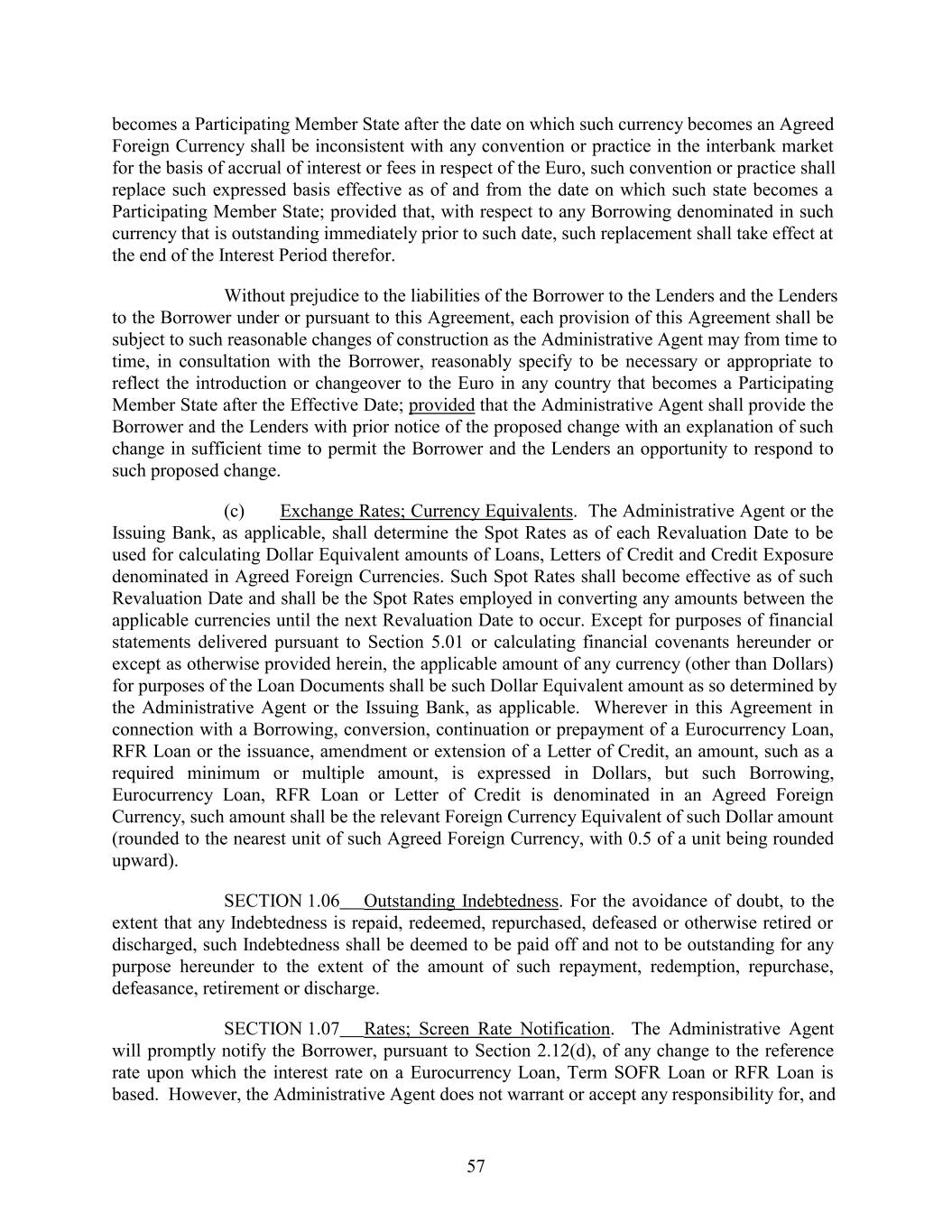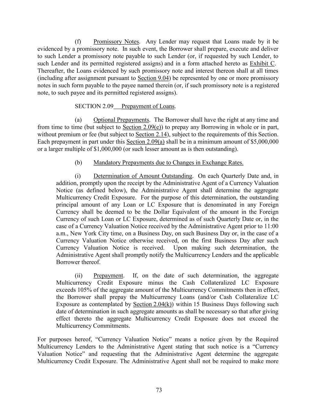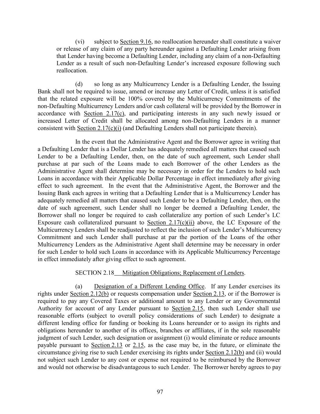 and such Lender shall treat each Person whose name is recorded in the Participant Register as the owner of such participation for all purposes of this Agreement notwithstanding any notice to the contrary. For the avoidance of doubt, the Administrative Agent (in its capacity as the Administrative Agent) shall have no responsibility for maintaining a Participant Register. (g) Limitations on Rights of Participants. A Participant shall not be entitled to receive any greater payment under Section 2.13, 2.14 or 2.15 than the applicable Lender would have been entitled to receive with respect to the participation sold to such Participant, unless the sale of the participation to such Participant is made with the Borrower’s prior written consent. A Participant that would be a Foreign Lender if it were a Lender shall not be entitled to the benefits of Section 2.15 unless the Borrower is notified of the participation sold to such Participant and such Participant agrees, for the benefit of the Borrower, to comply with paragraphs (c) and (f) of Section 2.15 as though it were a Lender (it being understood that that the documentation required under Section 2.15(f) shall be delivered to the participating Lender). (h) Certain Pledges. Any Lender may at any time pledge or assign a security interest in all or any portion of its rights under this Agreement to secure obligations of such Lender, including any such pledge or assignment to a Federal Reserve Bank or any other central bank, and this Section shall not apply to any such pledge or assignment of a security interest; provided that no such pledge or assignment of a security interest shall release a Lender from any of its obligations hereunder or substitute any such assignee for such Lender as a party hereto. (i) No Assignments or Participations to the Borrower or Affiliates or Certain Other Persons. Anything in this Section to the contrary notwithstanding, no Lender may (i) assign or participate any interest in any Commitment, Loan or LC Exposure held by it hereunder to the Borrower or any of its Affiliates or Subsidiaries without the prior consent of each Lender, or (ii) assign any interest in any Commitment, Loan or LC Exposure held by it hereunder to a natural person (or a holding company, investment vehicle or trust for, or owned and operated for the primary benefit of, a natural person) or to any Person known by such Lender at the time of such assignment to be a Defaulting Lender, a Subsidiary of a Defaulting Lender or a Person who, upon consummation of such assignment would be a Defaulting Lender. (j) Multicurrency Lenders. Any assignment by a Multicurrency Lender, so long as no Event of Default has occurred and is continuing with respect to any Borrower, must be to a Person that is able to fund and receive payments on account of each outstanding Agreed Foreign Currency at such time without the need to obtain any authorization referred to in clause (c) of the definition of “Agreed Foreign Currency”. (k) Certain matters Relating to Disqualified Lenders. The Administrative Agent shall not be responsible or have any liability for, or have any duty to ascertain, inquire into, monitor or enforce, compliance with the provisions hereof relating to Disqualified Lenders. Without limiting the generality of the foregoing, the Administrative Agent shall not (x) be obligated to ascertain, monitor or inquire as to whether any Lender or Participant or prospective Lender or Participant is a Disqualified Lender or (y) have any liability with respect to or arising out of any assignment or participation of Loans, or disclosure of confidential information, to any 172